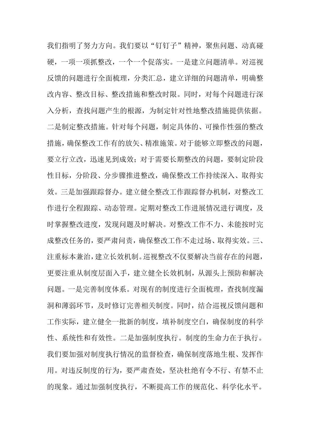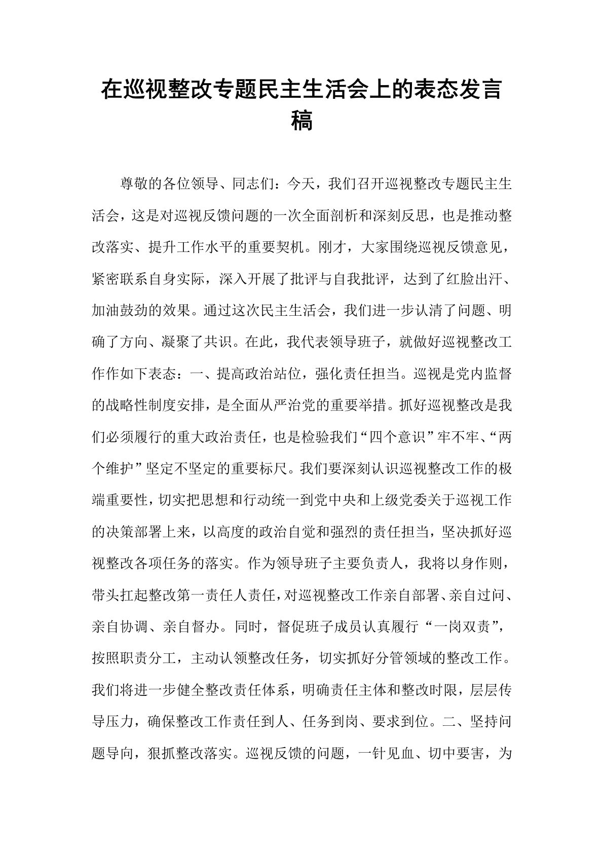 在巡视整改专题民主生活会上的表态发言稿尊敬的各位领导、同志们:今天,我们召开巡视整改专题民主生活会,这是对巡视反馈问题的一次全面剖析和深刻反思,也是推动整改落实、提升工作水平的重要契机。刚才,大家围绕巡视反馈意见,紧密联系自身实际,深入开展了批评与自我批评,达到了红脸出汗、加油鼓劲的效果。通过这次民主生活会,我们进一步认清了问题、明确了方向、凝聚了共识。在此,我代表领导班子,就做好巡视整改工作作如下表态:一、提高政治站位,强化责任担当。巡视是党内监督的战略性制度安排,是全面从严治党的重要举措。抓好巡视整改是我们必须履行的重大政治责任,也是检验我们“四个意识”牢不牢、“两个维护”坚定不坚定的重要...