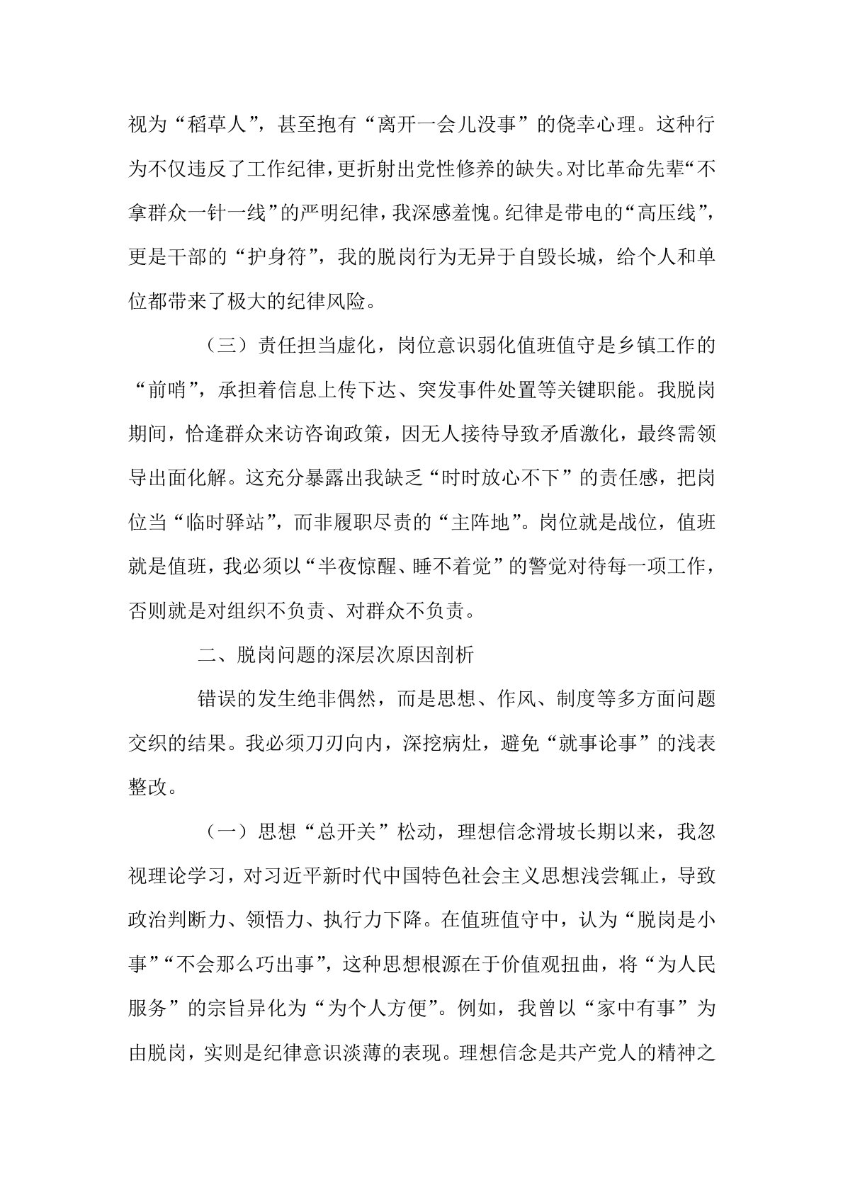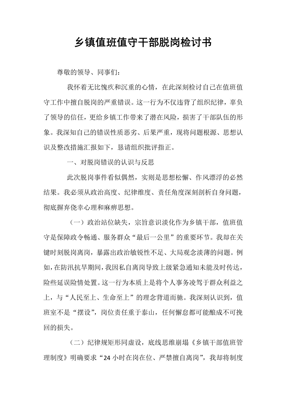 乡镇值班值守干部脱岗检讨书