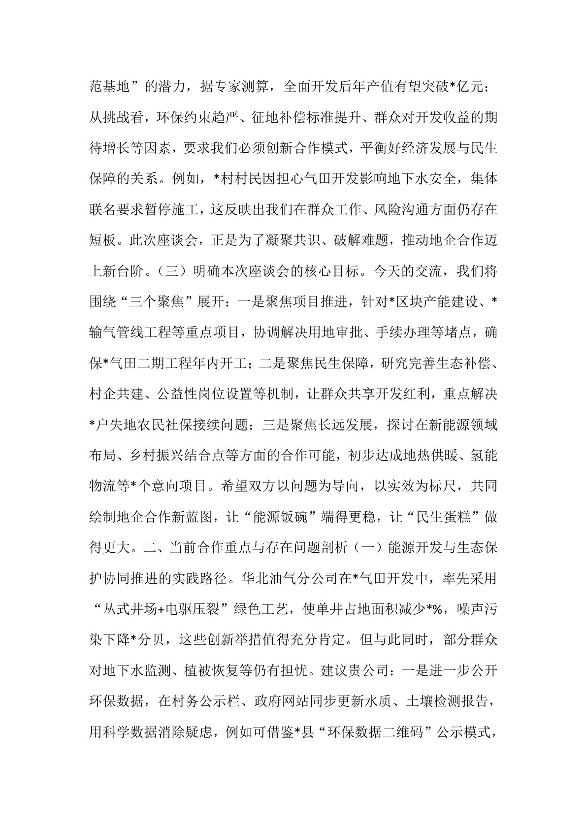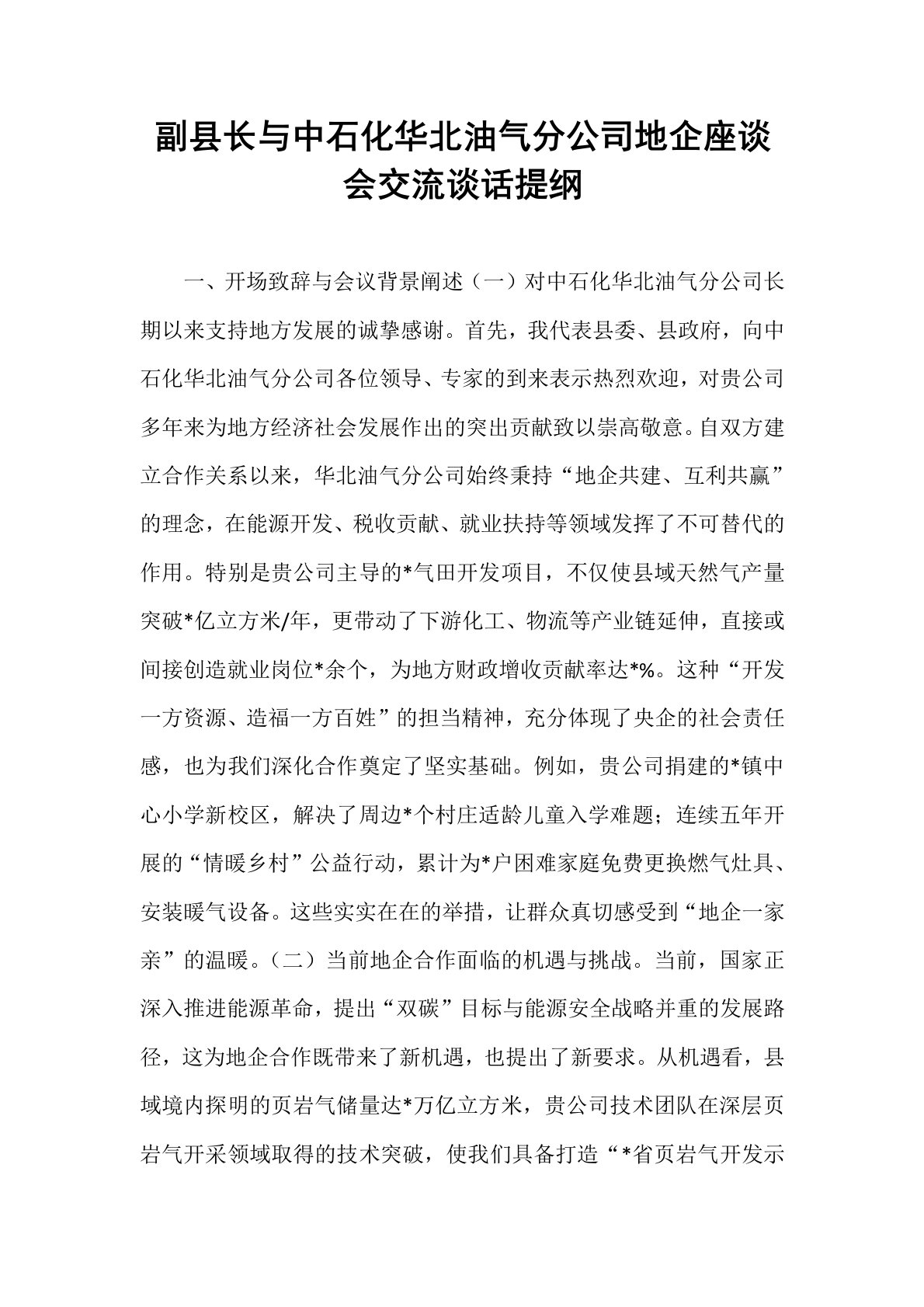 副县长与中石化华北油气分公司地企座谈会交流谈话提纲一、开场致辞与会议背景阐述(一)对中石化华北油气分公司长期以来支持地方发展的诚挚感谢。首先,我代表县委、县政府,向中石化华北油气分公司各位领导、专家的到来表示热烈欢迎,对贵公司多年来为地方经济社会发展作出的突出贡献致以崇高敬意。自双方建立合作关系以来,华北油气分公司始终秉持“地企共建、互利共赢”的理念,在能源开发、税收贡献、就业扶持等领域发挥了不可替代的作用。特别是贵公司主导的*气田开发项目,不仅使县域天然气产量突破*亿立方米/年,更带动了下游化工、物流等产业链延伸,直接或间接创造就业岗位*余个,为地方财政增收贡献率达*%。这种“开发一方资源、...