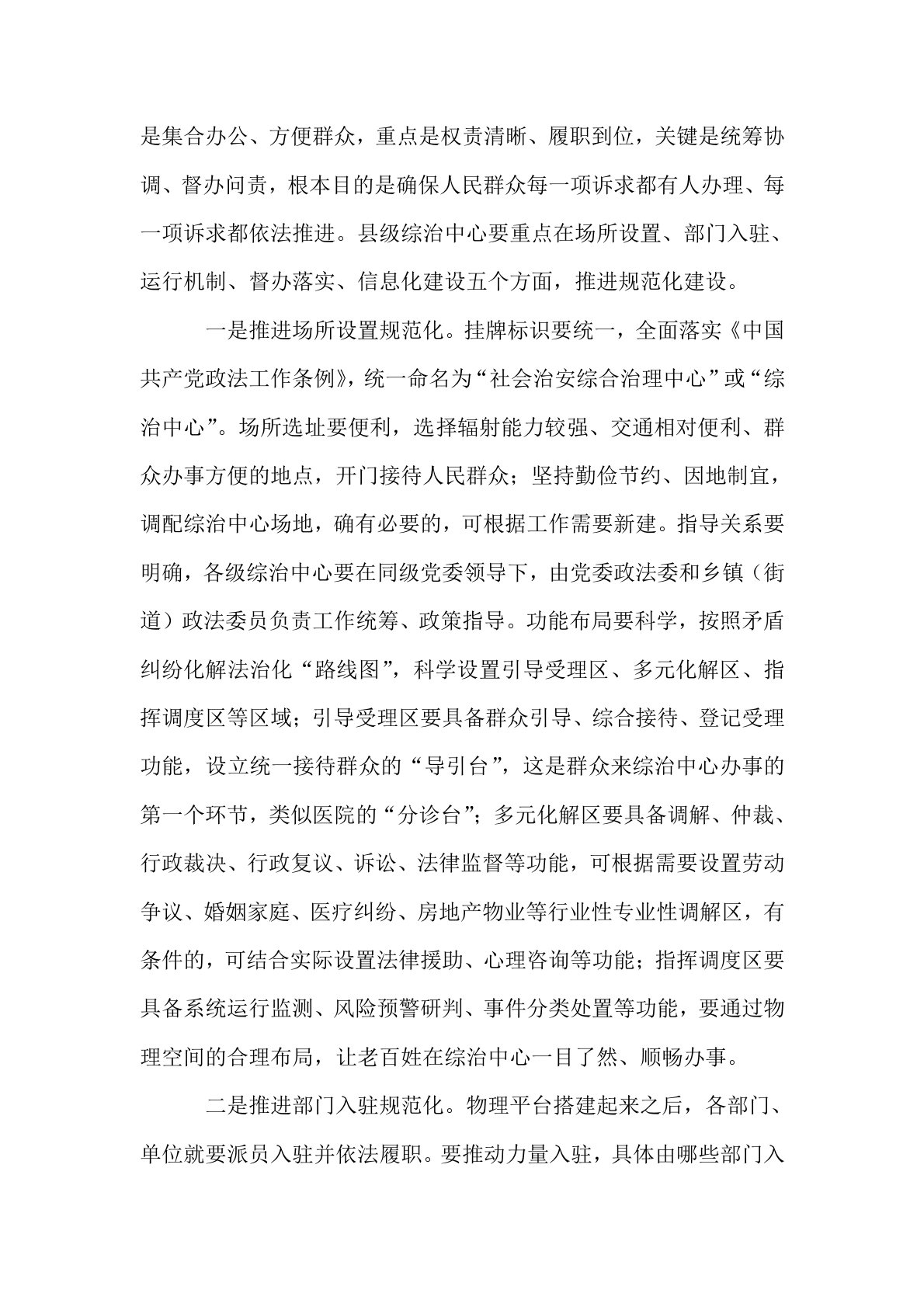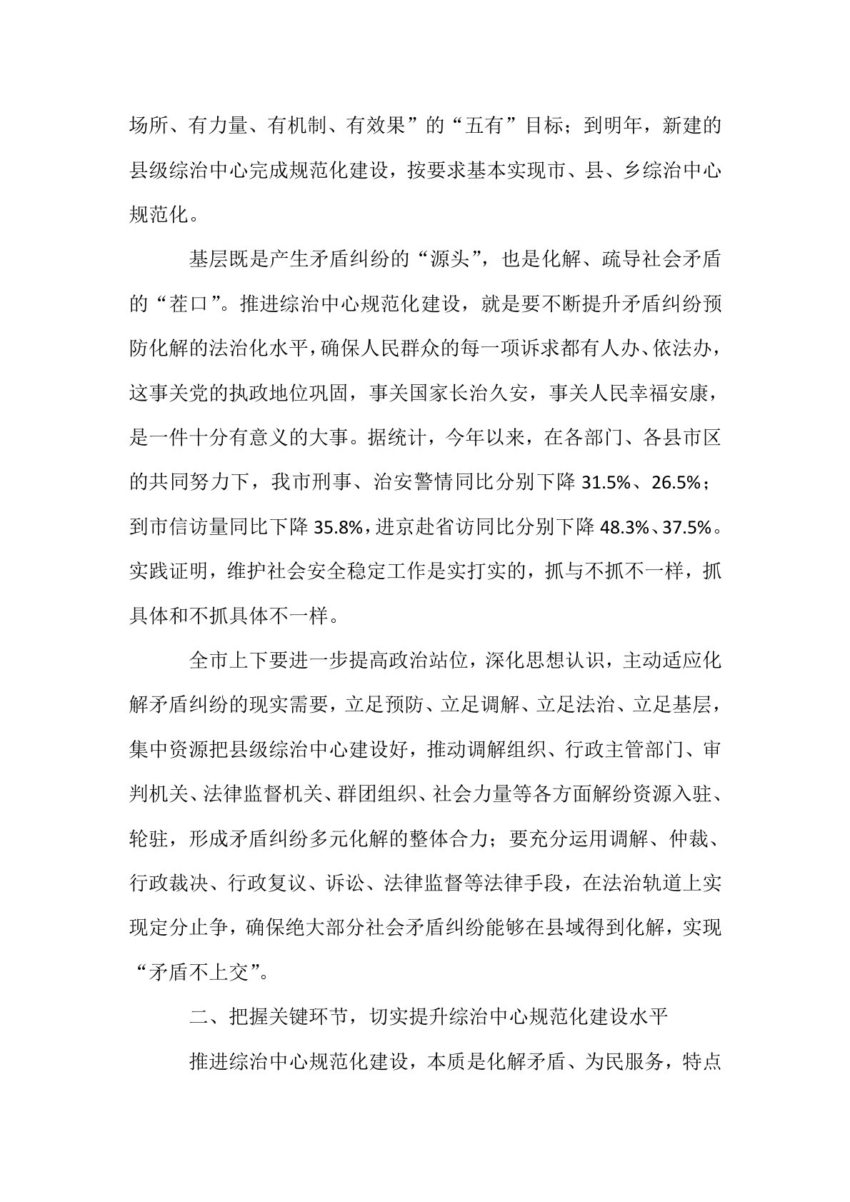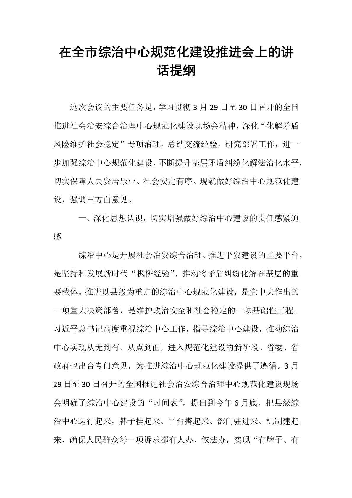 在全市综治中心规范化建设推进会上的讲话提纲这次会议的主要任务是,学习贯彻3月29日至30日召开的全国推进社会治安综合治理中心规范化建设现场会精神,深化“化解矛盾风险维护社会稳定”专项治理,总结交流经验,研究部署工作,进一步加强综治中心规范化建设,不断提升基层矛盾纠纷化解法治化水平,切实保障人民安居乐业、社会安定有序。现就做好综治中心规范化建设,强调三方面意见。一、深化思想认识,切实增强做好综治中心建设的责任感紧迫感综治中心是开展社会治安综合治理、推进平安建设的重要平台,是坚持和发展新时代“枫桥经验”、推动将矛盾纠纷化解在基层的重要载体。推进以县级为重点的综治中心规范化建设,是党中央作出的一项重...