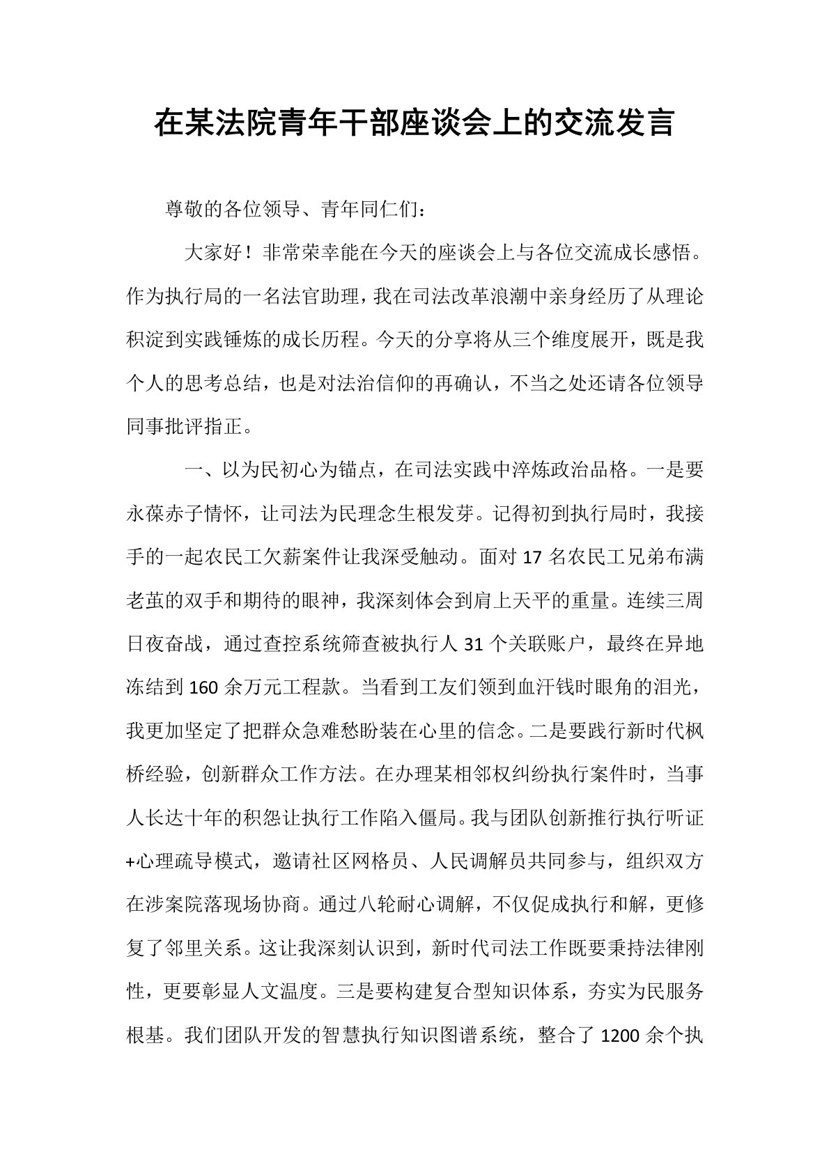 在某法院青年干部座谈会上的交流发言尊敬的各位领导、青年同仁们:大家好!非常荣幸能在今天的座谈会上与各位交流成长感悟。作为执行局的一名法官助理,我在司法改革浪潮中亲身经历了从理论积淀到实践锤炼的成长历程。今天的分享将从三个维度展开,既是我个人的思考总结,也是对法治信仰的再确认,不当之处还请各位领导同事批评指正。一、以为民初心为锚点,在司法实践中淬炼政治品格。一是要永葆赤子情怀,让司法为民理念生根发芽。记得初到执行局时,我接手的一起农民工欠薪案件让我深受触动。面对17名农民工兄弟布满老茧的双手和期待的眼神,我深刻体会到肩上天平的重量。连续三周日夜奋战,通过查控系统筛查被执行人31个关联账户,最终在...