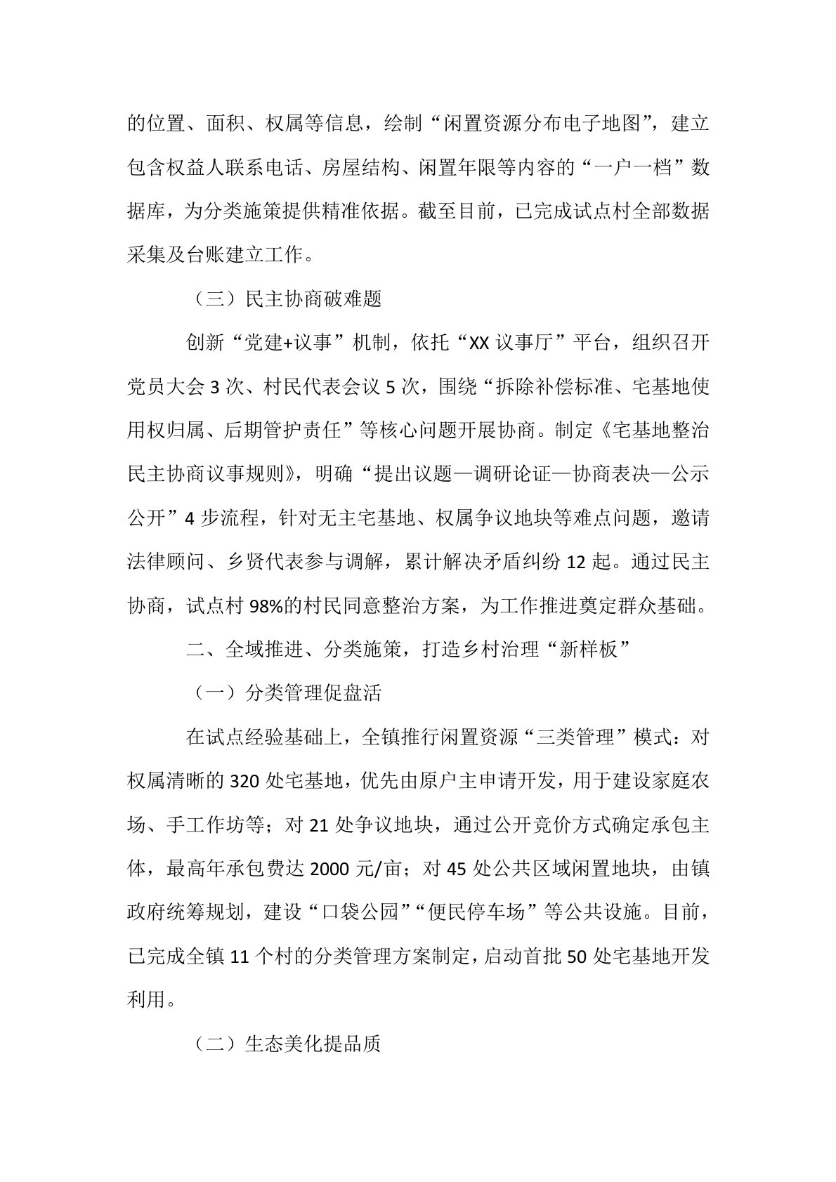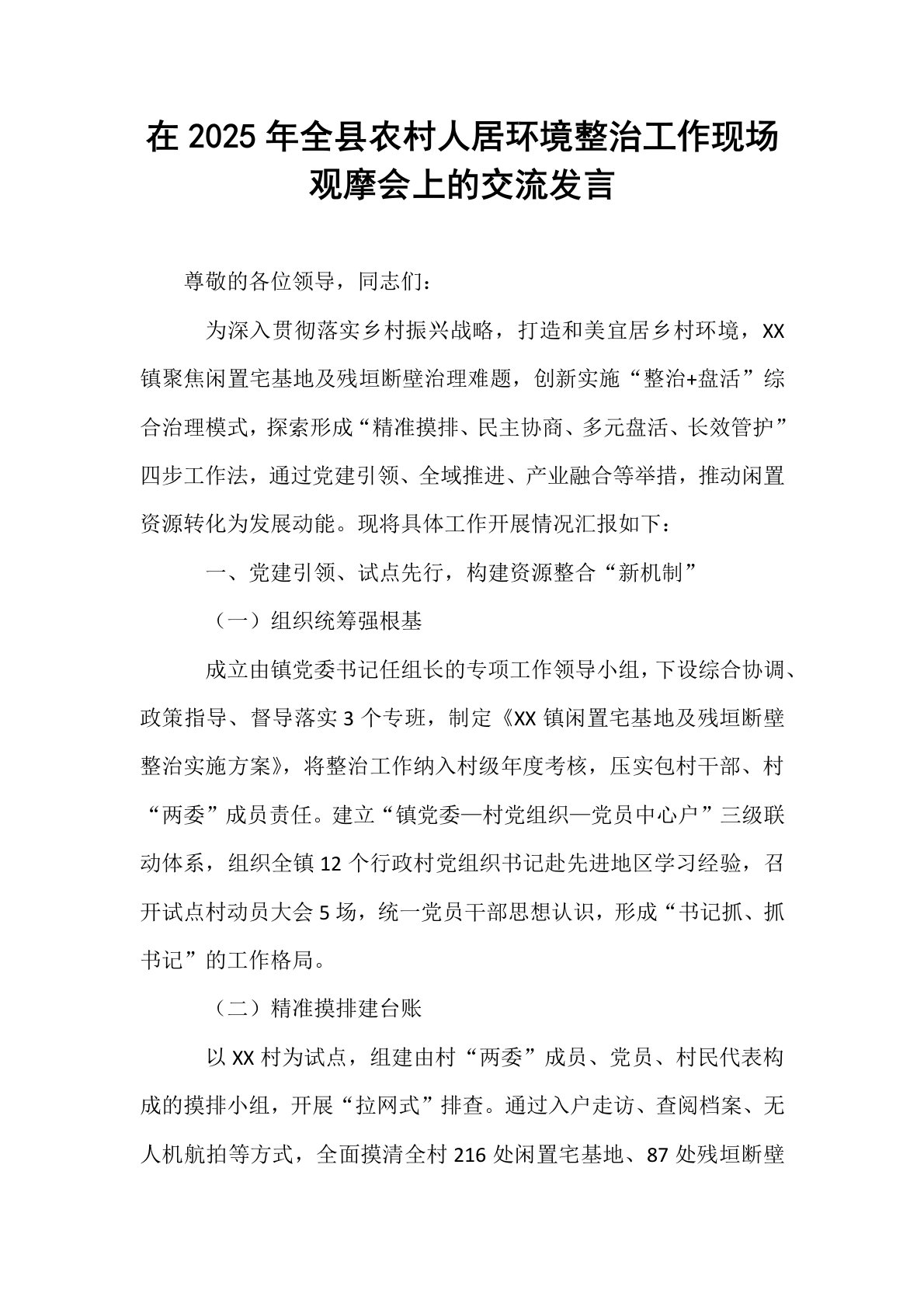 在2025年全县农村人居环境整治工作现场观摩会上的交流发言尊敬的各位领导,同志们:为深入贯彻落实乡村振兴战略,打造和美宜居乡村环境,XX镇聚焦闲置宅基地及残垣断壁治理难题,创新实施“整治+盘活”综合治理模式,探索形成“精准摸排、民主协商、多元盘活、长效管护”四步工作法,通过党建引领、全域推进、产业融合等举措,推动闲置资源转化为发展动能。现将具体工作开展情况汇报如下:一、党建引领、试点先行,构建资源整合“新机制”(一)组织统筹强根基成立由镇党委书记任组长的专项工作领导小组,下设综合协调、政策指导、督导落实3个专班,制定《XX镇闲置宅基地及残垣断壁整治实施方案》,将整治工作纳入村级年度考核,压实包...