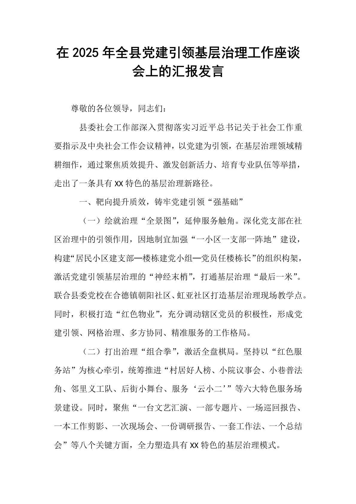在2025年全县党建引领基层治理工作座谈会上的汇报发言尊敬的各位领导,同志们:县委社会工作部深入贯彻落实习近平总书记关于社会工作重要指示及中央社会工作会议精神,以党建为引领,在基层治理领域精耕细作,通过聚焦质效提升、激发创新活力、培育专业队伍等举措,走出了一条具有XX特色的基层治理新路径。一、靶向提升质效,铸牢党建引领“强基础”(一)绘就治理“全景图”,延伸服务触角。深化党支部在社区治理中的引领作用,因地制宜加强“一小区一支部一阵地”建设,构建“居民小区建支部─楼栋建党小组─党员任楼栋长”的组织构架,激活党建引领基层治理的“神经末梢”,打通基层治理“最后一米”。联合县委党校在合德镇朝阳社区、虹...