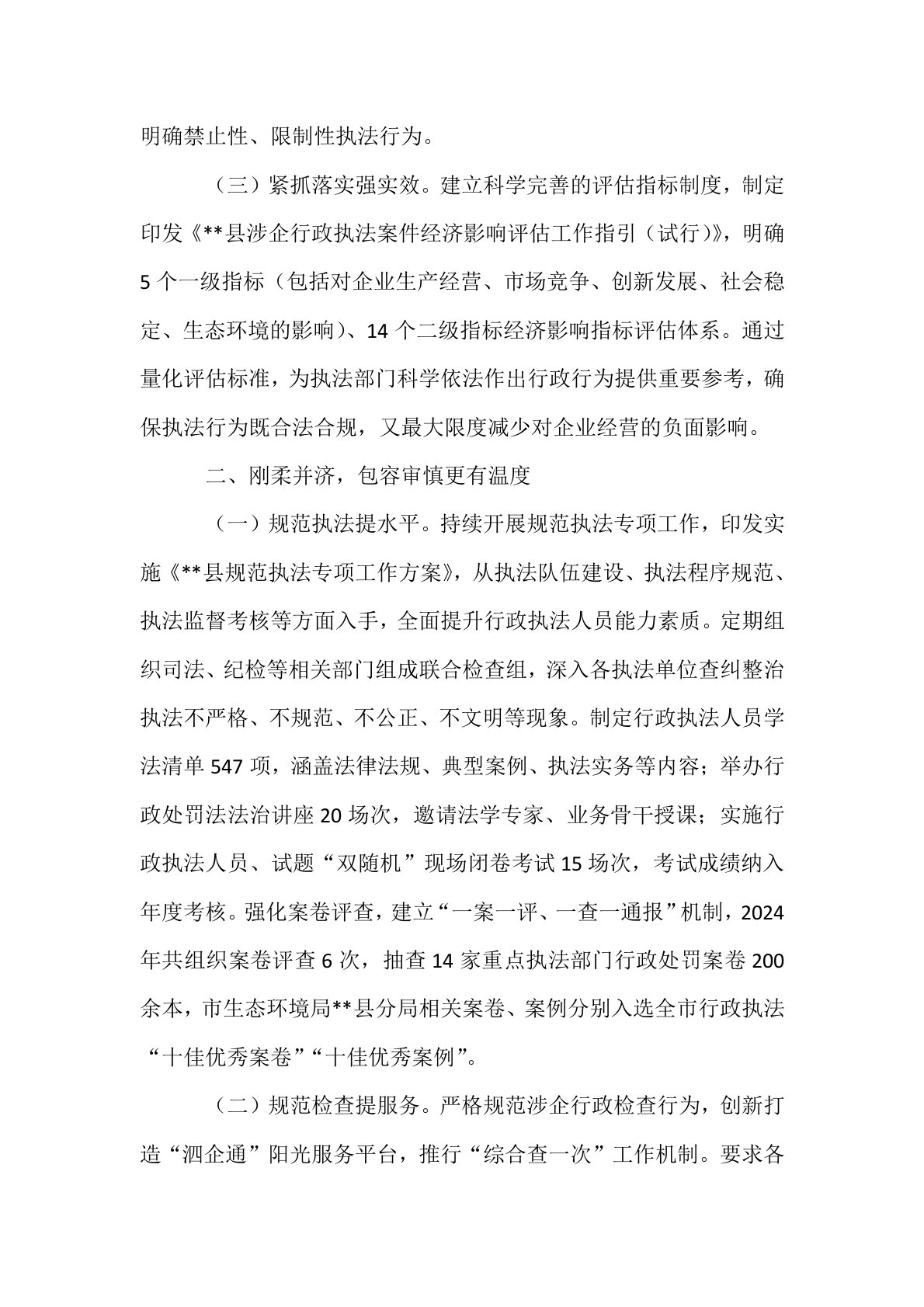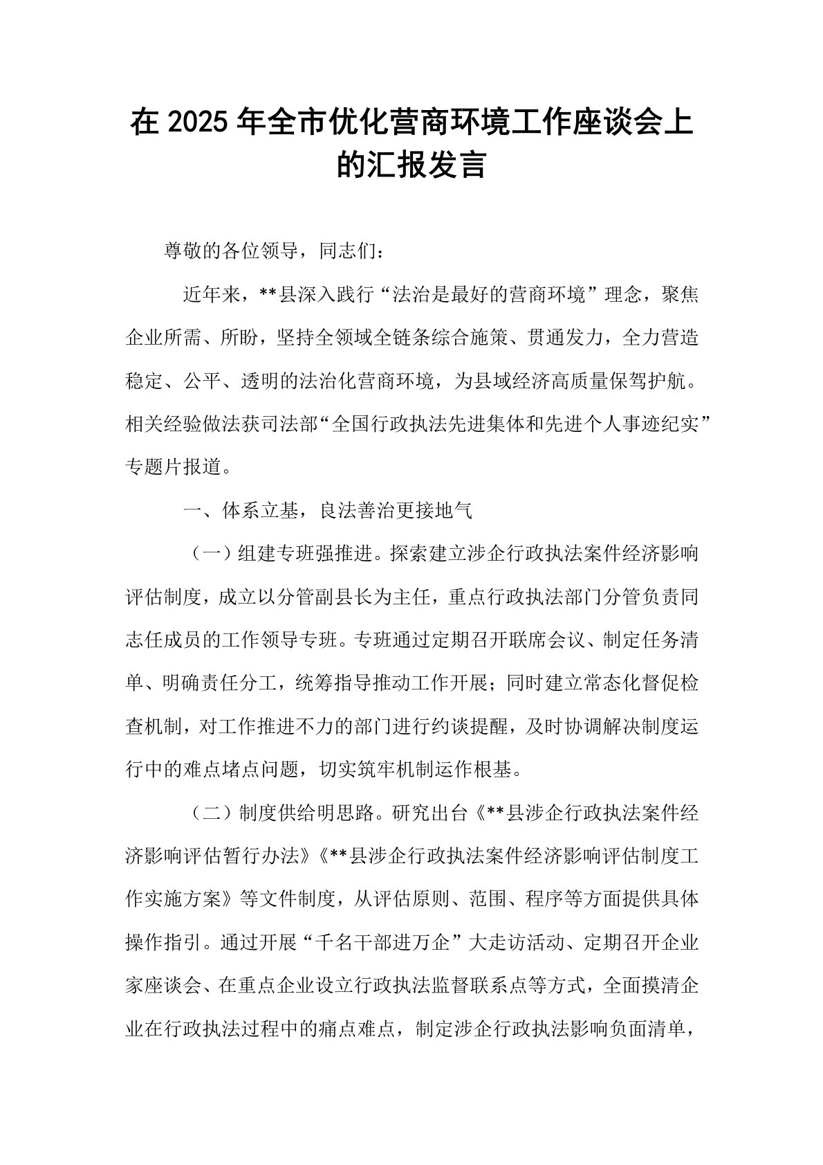 在2025年全市优化营商环境工作座谈会上的汇报发言尊敬的各位领导,同志们:近年来,**县深入践行“法治是最好的营商环境”理念,聚焦企业所需、所盼,坚持全领域全链条综合施策、贯通发力,全力营造稳定、公平、透明的法治化营商环境,为县域经济高质量保驾护航。相关经验做法获司法部“全国行政执法先进集体和先进个人事迹纪实”专题片报道。一、体系立基,良法善治更接地气(一)组建专班强推进。探索建立涉企行政执法案件经济影响评估制度,成立以分管副县长为主任,重点行政执法部门分管负责同志任成员的工作领导专班。专班通过定期召开联席会议、制定任务清单、明确责任分工,统筹指导推动工作开展;同时建立常态化督促检查机制,对工...