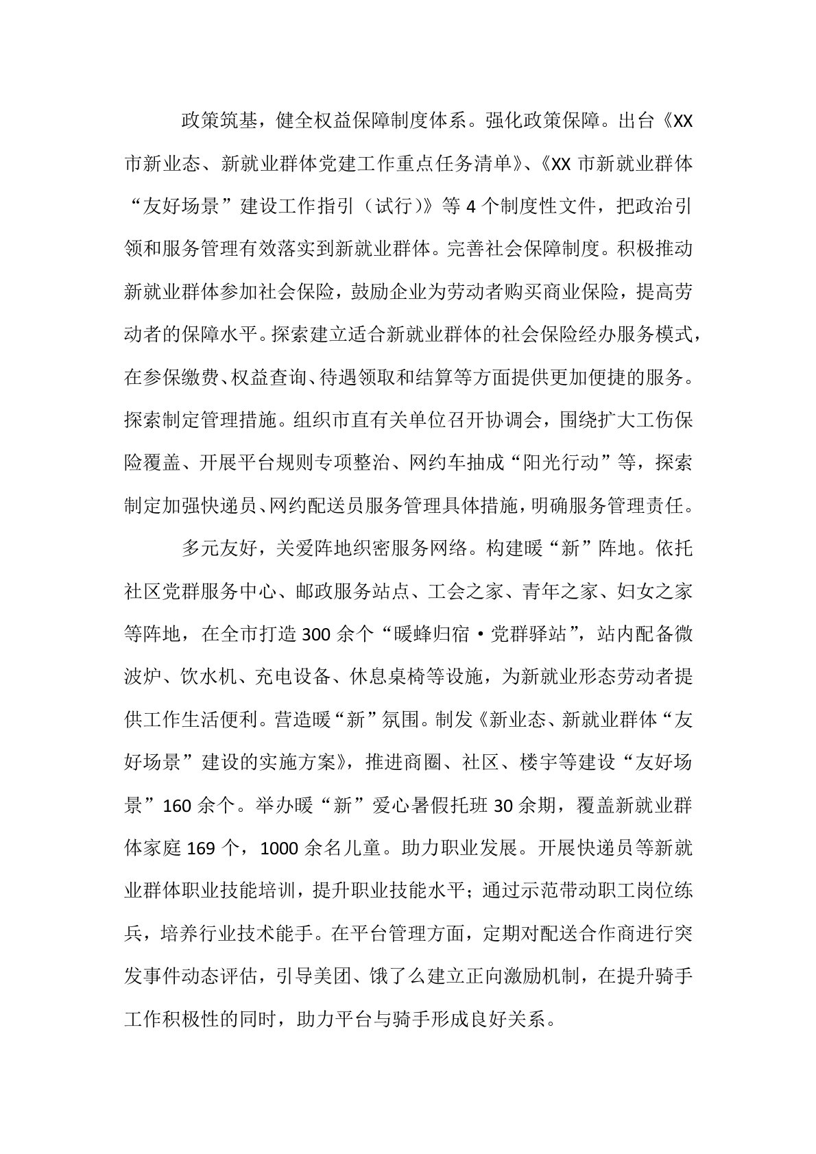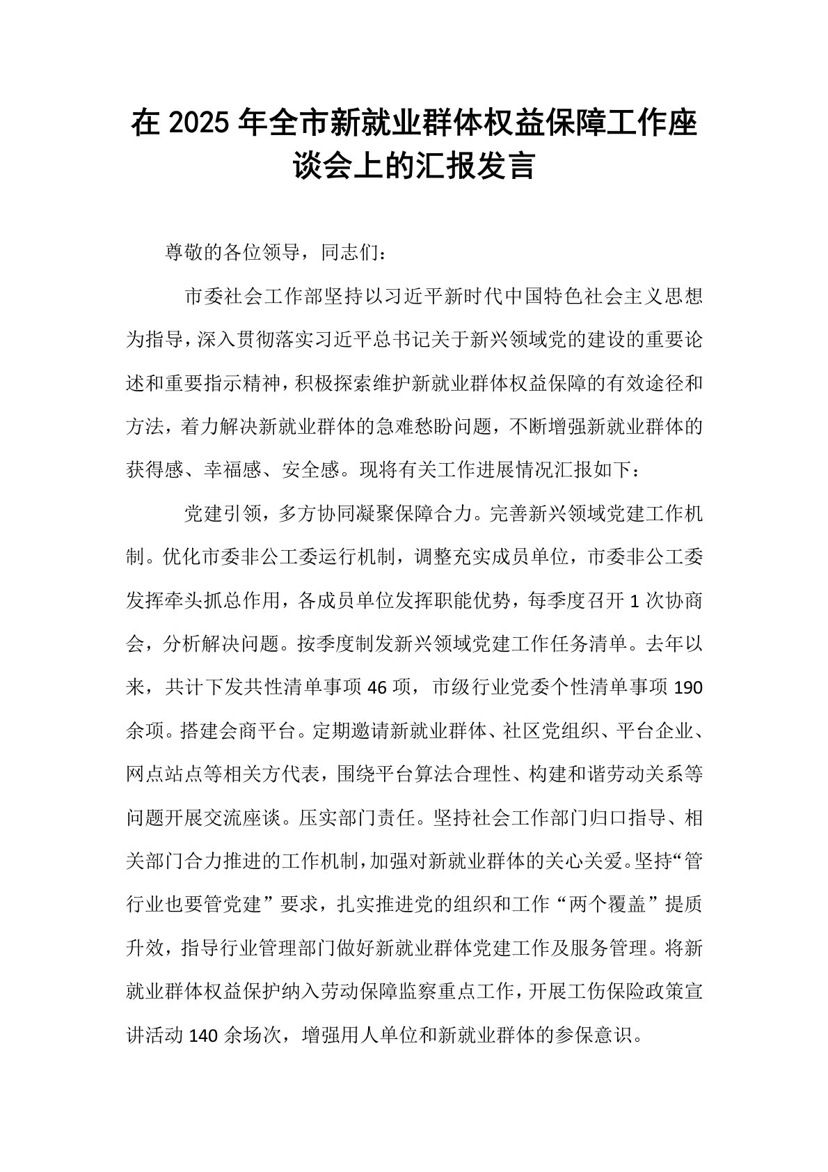 在2025年全市新就业群体权益保障工作座谈会上的汇报发言尊敬的各位领导,同志们:市委社会工作部坚持以习近平新时代中国特色社会主义思想为指导,深入贯彻落实习近平总书记关于新兴领域党的建设的重要论述和重要指示精神,积极探索维护新就业群体权益保障的有效途径和方法,着力解决新就业群体的急难愁盼问题,不断增强新就业群体的获得感、幸福感、安全感。现将有关工作进展情况汇报如下:党建引领,多方协同凝聚保障合力。完善新兴领域党建工作机制。优化市委非公工委运行机制,调整充实成员单位,市委非公工委发挥牵头抓总作用,各成员单位发挥职能优势,每季度召开1次协商会,分析解决问题。按季度制发新兴领域党建工作任务清单。去年以...