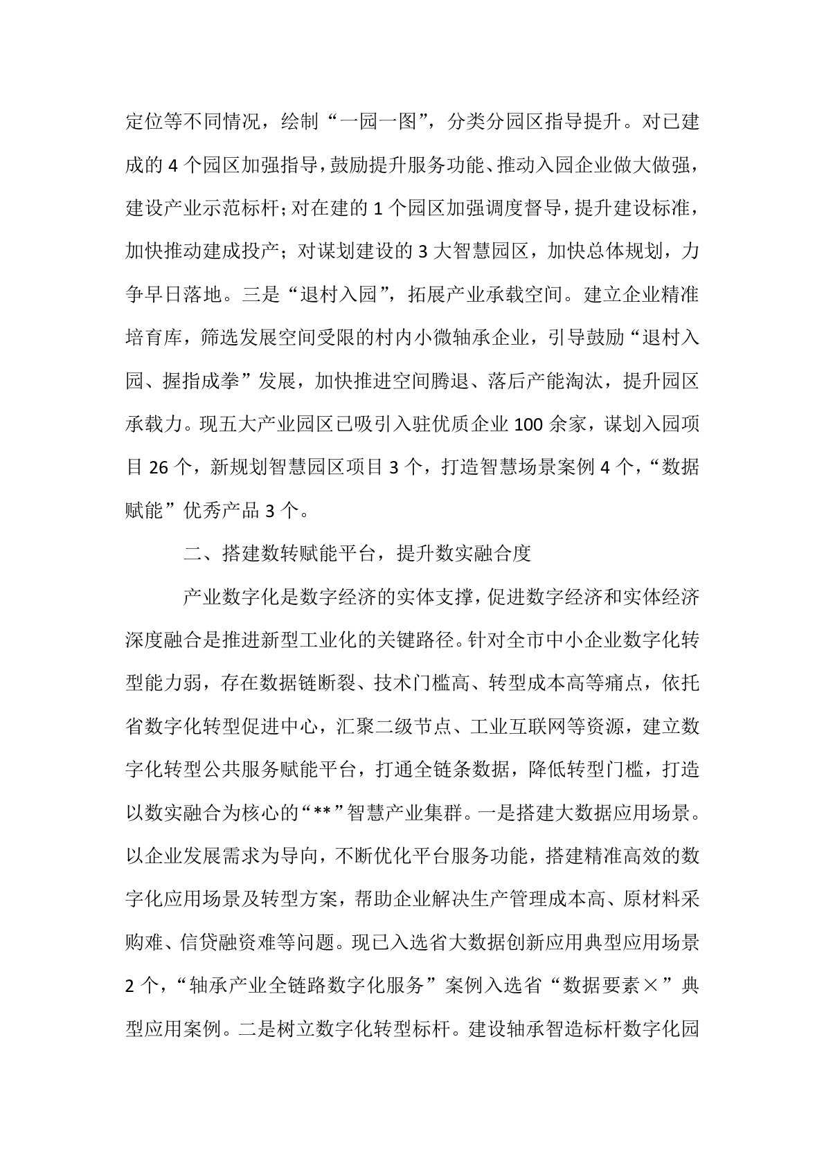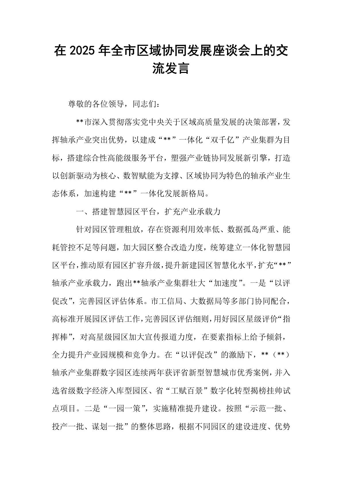 在2025年全市区域协同发展座谈会上的交流发言尊敬的各位领导,同志们:**市深入贯彻落实党中央关于区域高质量发展的决策部署,发挥轴承产业突出优势,以建成“**”一体化“双千亿”产业集群为目标,搭建综合性高能级服务平台,塑强产业链协同发展新引擎,打造以创新驱动为核心、数智赋能为支撑、区域协同为特色的轴承产业生态体系,加速构建“**”一体化发展新格局。一、搭建智慧园区平台,扩充产业承载力针对园区管理粗放,存在资源利用效率低、数据孤岛严重、能耗管控不足等问题,加大园区整合改造力度,统筹建立一体化智慧园区平台,推动原有园区扩容升级,提升新建园区智慧化水平,扩充“**”轴承产业承载力,跑出**轴承产业集...
