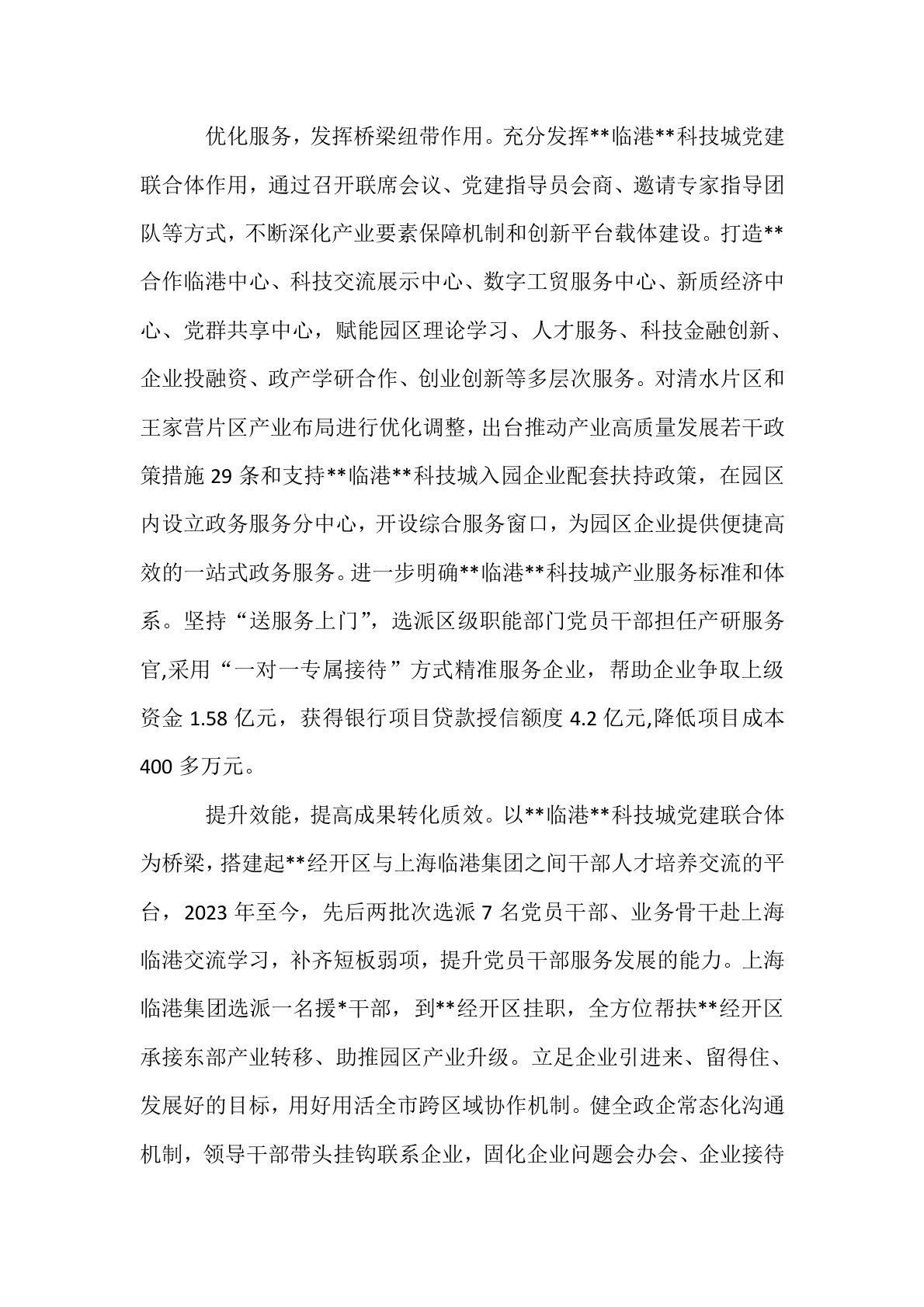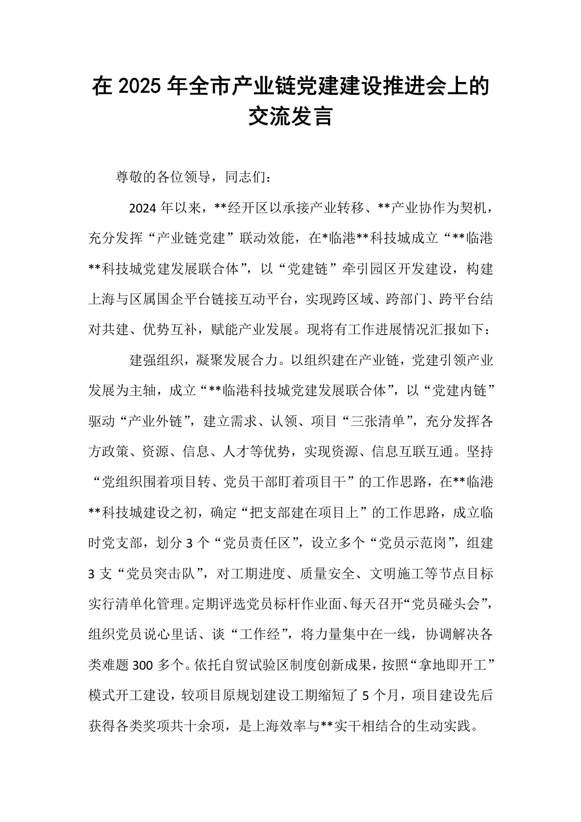 在2025年全市产业链党建建设推进会上的交流发言尊敬的各位领导,同志们:2024年以来,**经开区以承接产业转移、**产业协作为契机,充分发挥“产业链党建”联动效能,在*临港**科技城成立“**临港**科技城党建发展联合体”,以“党建链”牵引园区开发建设,构建上海与区属国企平台链接互动平台,实现跨区域、跨部门、跨平台结对共建、优势互补,赋能产业发展。现将有工作进展情况汇报如下:建强组织,凝聚发展合力。以组织建在产业链,党建引领产业发展为主轴,成立“**临港科技城党建发展联合体”,以“党建内链”驱动“产业外链”,建立需求、认领、项目“三张清单”,充分发挥各方政策、资源、信息、人才等优势,实现资源...