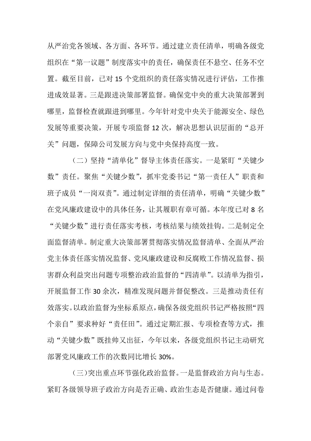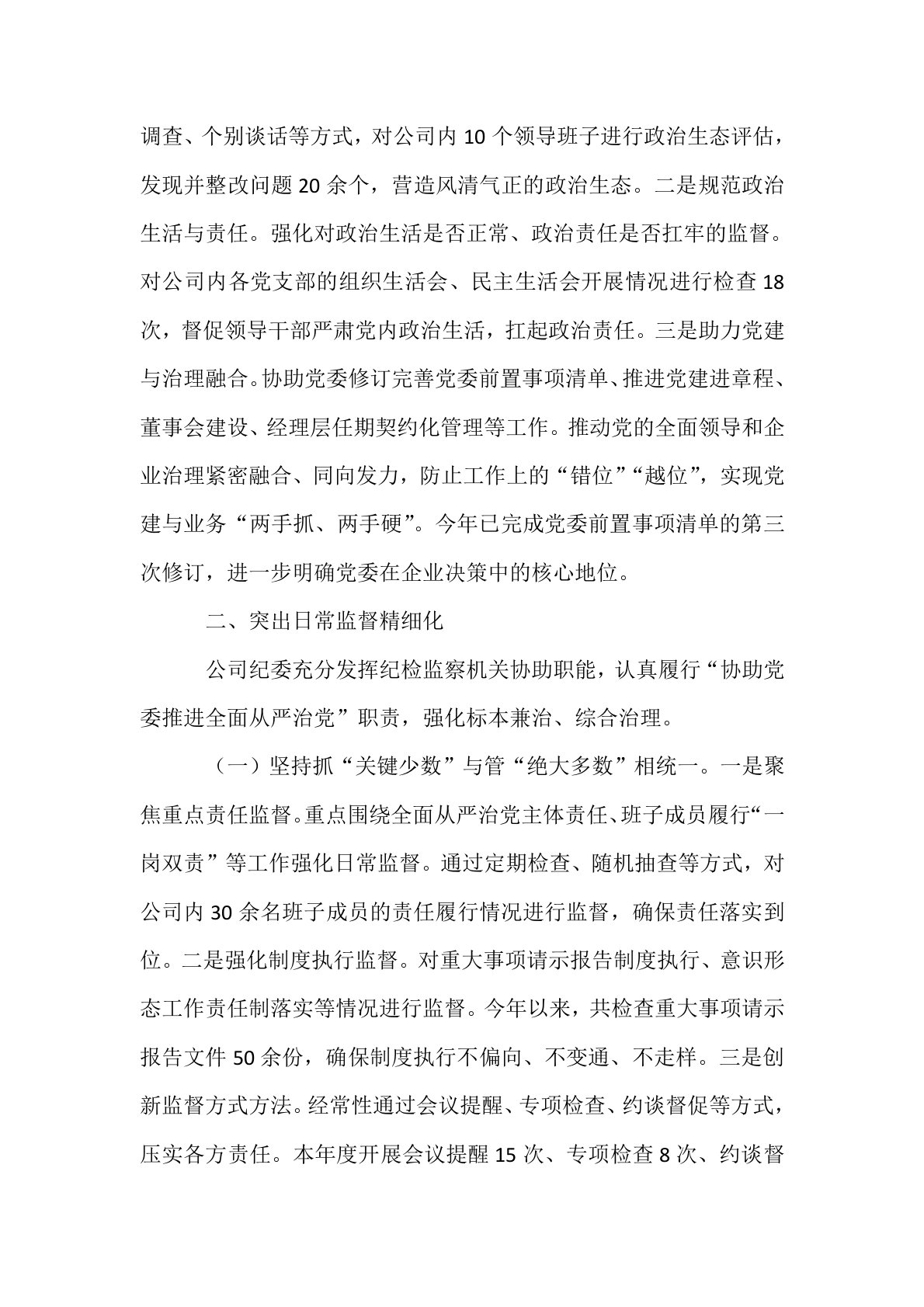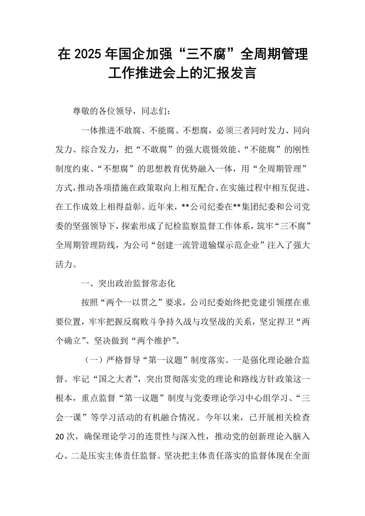 在2025年国企加强“三不腐”全周期管理工作推进会上的汇报发言尊敬的各位领导,同志们:一体推进不敢腐、不能腐、不想腐,必须三者同时发力、同向发力、综合发力,把“不敢腐”的强大震慑效能、“不能腐”的刚性制度约束、“不想腐”的思想教育优势融入一体,用“全周期管理”方式,推动各项措施在政策取向上相互配合、在实施过程中相互促进、在工作成效上相得益彰。近年来,**公司纪委在**集团纪委和公司党委的坚强领导下,探索形成了纪检监察监督工作体系,筑牢“三不腐”全周期管理防线,为公司“创建一流管道输煤示范企业”注入了强大活力。一、突出政治监督常态化按照“两个一以贯之”要求,公司纪委始终把党建引领摆在重要位置,牢...