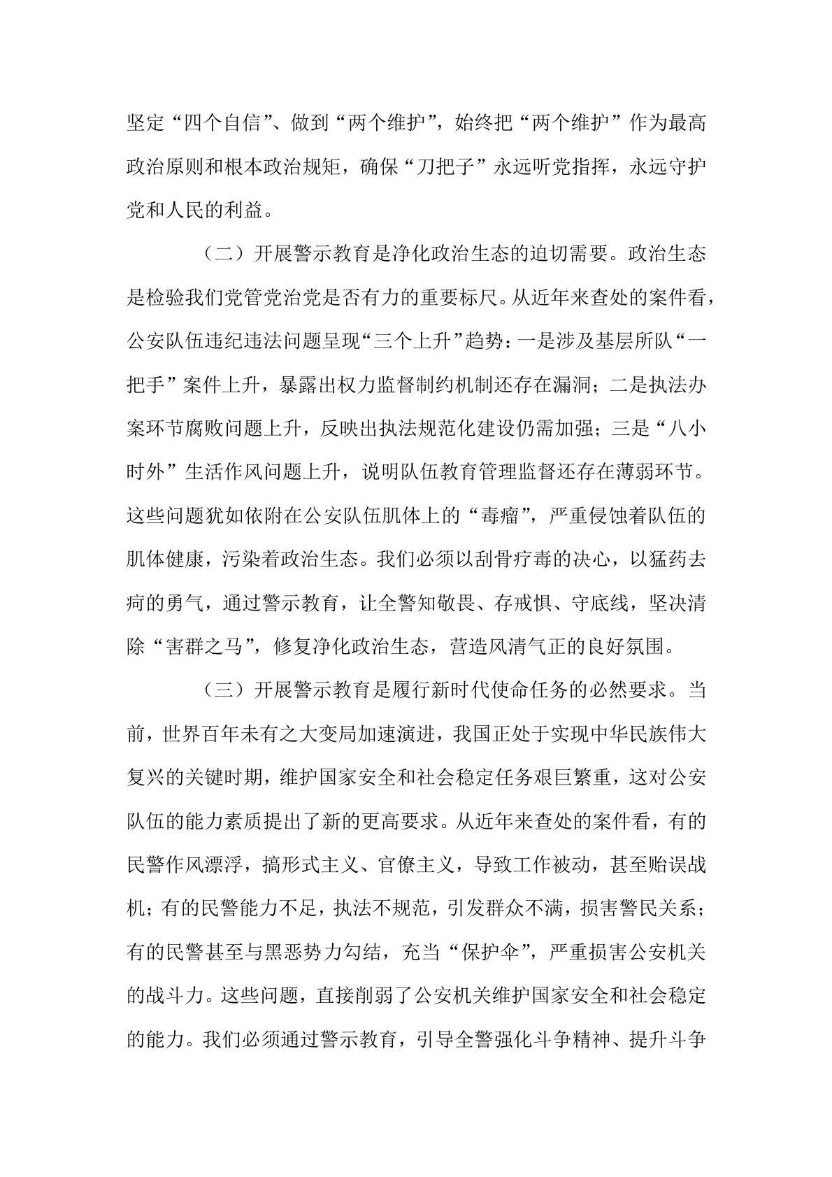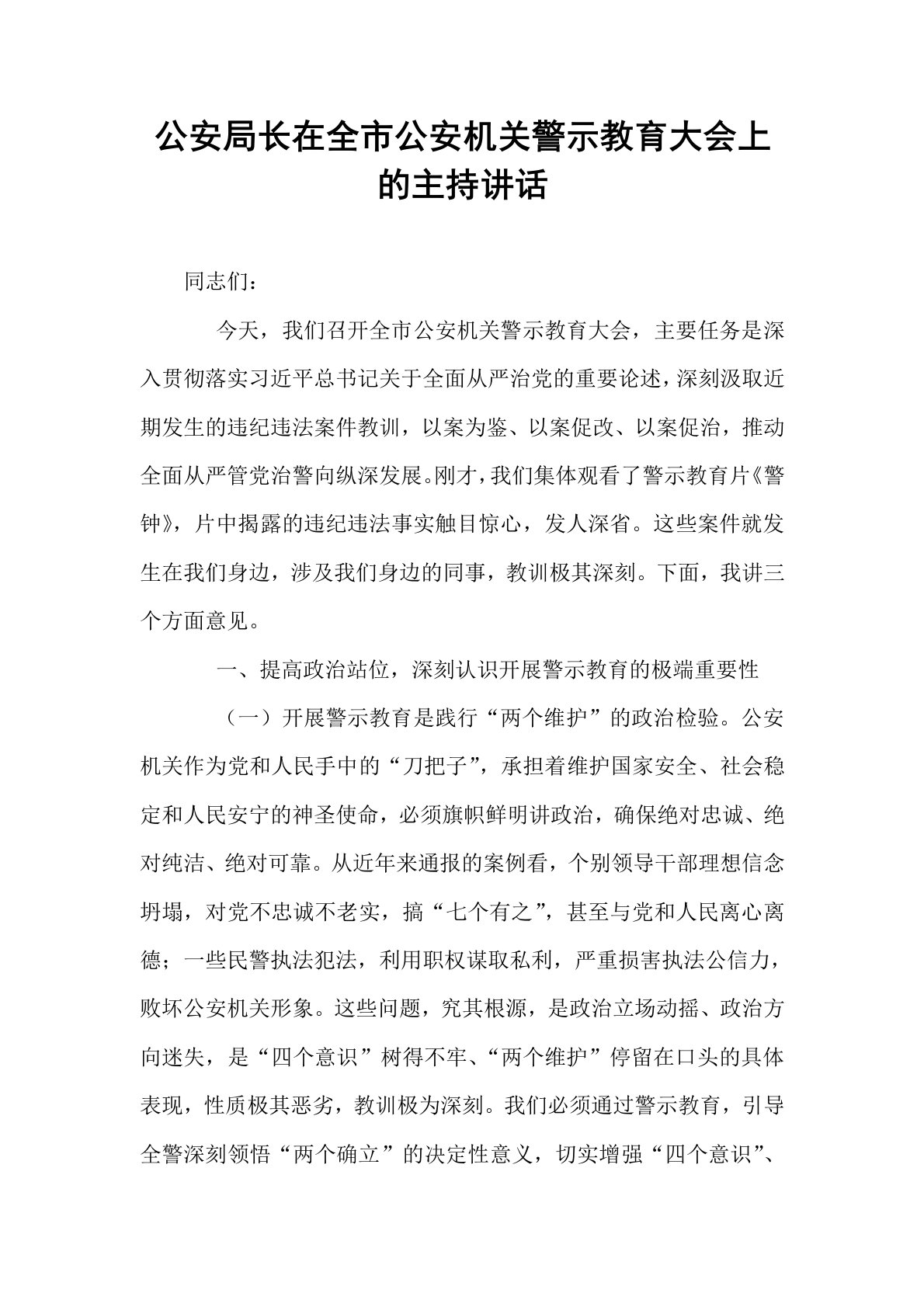 公安局长在全市公安机关警示教育大会上的主持讲话同志们:今天,我们召开全市公安机关警示教育大会,主要任务是深入贯彻落实习近平总书记关于全面从严治党的重要论述,深刻汲取近期发生的违纪违法案件教训,以案为鉴、以案促改、以案促治,推动全面从严管党治警向纵深发展。刚才,我们集体观看了警示教育片《警钟》,片中揭露的违纪违法事实触目惊心,发人深省。这些案件就发生在我们身边,涉及我们身边的同事,教训极其深刻。下面,我讲三个方面意见。一、提高政治站位,深刻认识开展警示教育的极端重要性(一)开展警示教育是践行“两个维护”的政治检验。公安机关作为党和人民手中的“刀把子”,承担着维护国家安全、社会稳定和人民安宁的神圣...