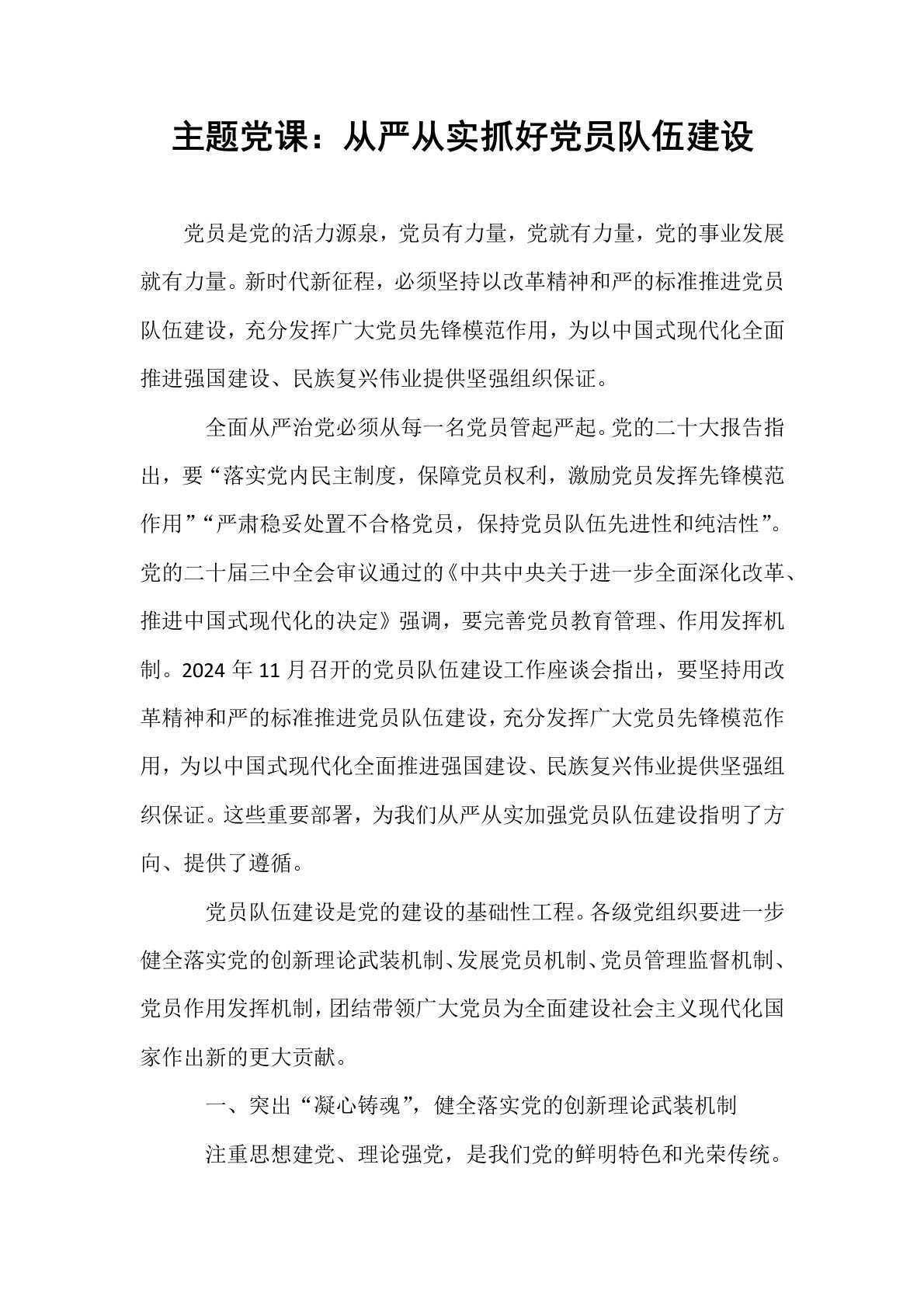 主题党课:从严从实抓好党员队伍建设党员是党的活力源泉,党员有力量,党就有力量,党的事业发展就有力量。新时代新征程,必须坚持以改革精神和严的标准推进党员队伍建设,充分发挥广大党员先锋模范作用,为以中国式现代化全面推进强国建设、民族复兴伟业提供坚强组织保证。全面从严治党必须从每一名党员管起严起。党的二十大报告指出,要“落实党内民主制度,保障党员权利,激励党员发挥先锋模范作用”“严肃稳妥处置不合格党员,保持党员队伍先进性和纯洁性”。党的二十届三中全会审议通过的《中共中央关于进一步全面深化改革、推进中国式现代化的决定》强调,要完善党员教育管理、作用发挥机制。2024年11月召开的党员队伍建设工作座谈会...