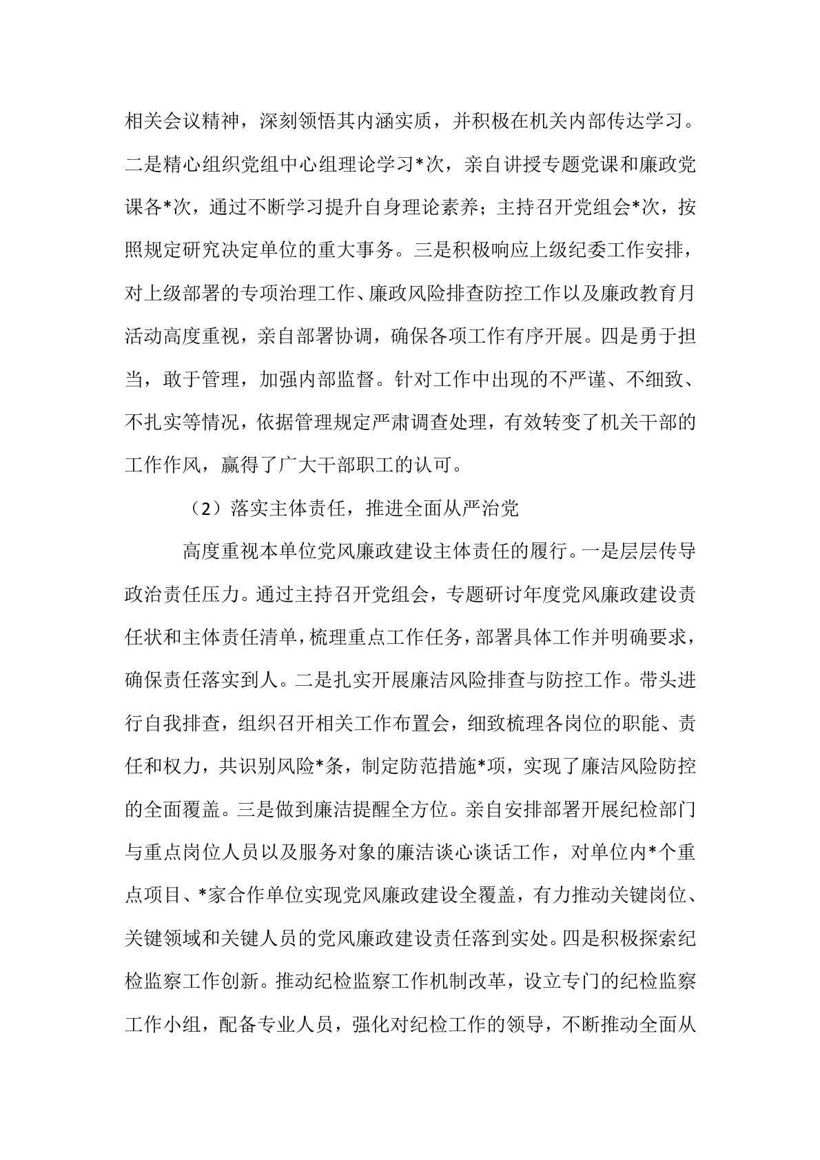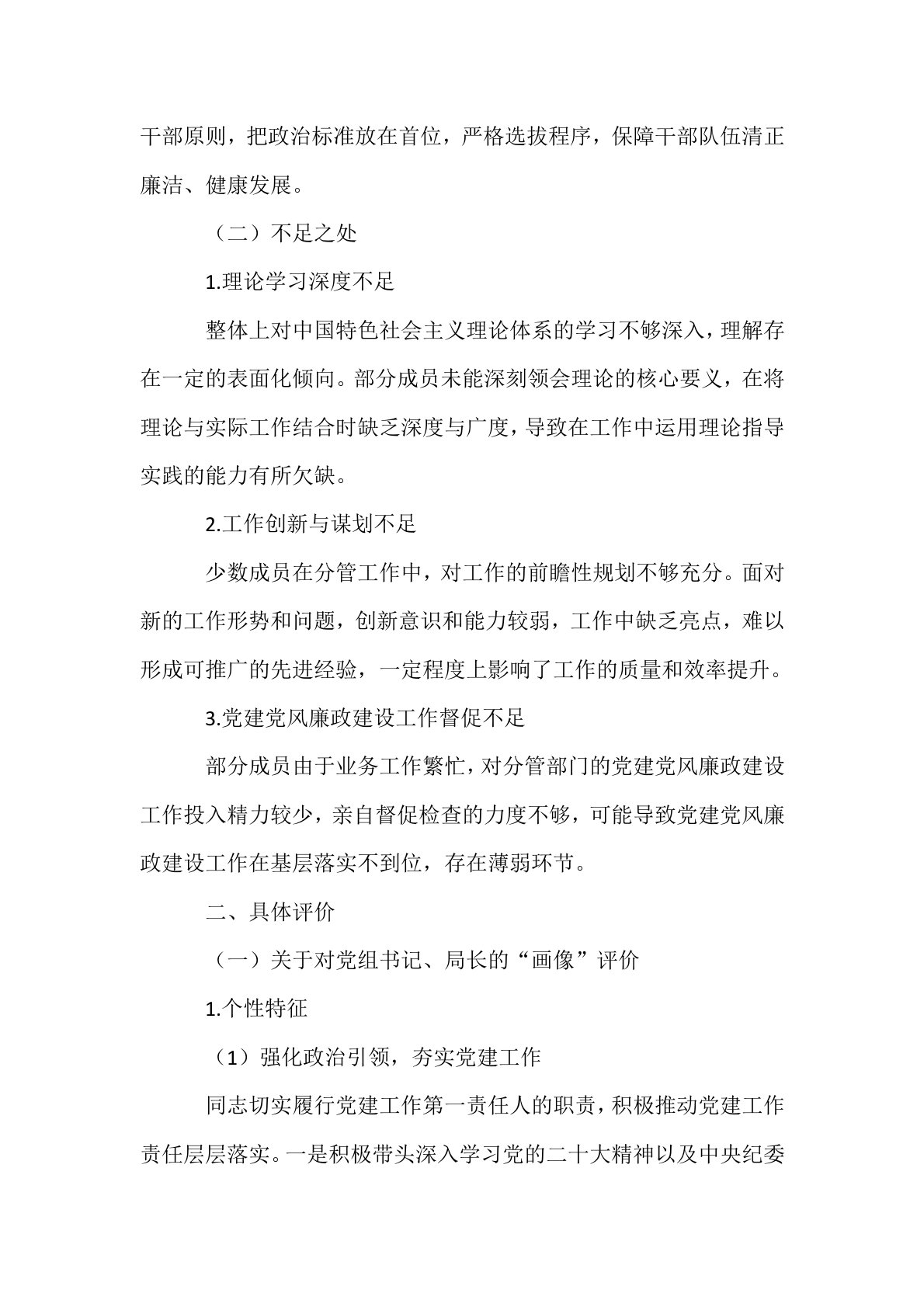 市直机关单位领导班子及其成员的政治“画像”评价报告一、领导班子履行主体责任情况(一)整体特征市直机关单位领导班子以习近平新时代中国特色社会主义思想为指引,深入贯彻党的二十大和二十届三中全会精神,全面落实上级纪委全会部署以及上级机关要求,坚定地推进全面从严治党,严肃党的政治纪律与政治规矩,积极落实意识形态工作责任制。始终把党风廉政建设与机关中心工作同步规划部署,构建起“一把手全面负责,分管领导分工负责,班子成员协同负责,纪检监察部门协调推进”的领导和工作机制,切实强化“四个意识”,坚定“四个自信”,做到“两个维护”。在决策机制方面,领导班子认真执行“三重一大”集体研究制度,“一把手”严格遵循“四...