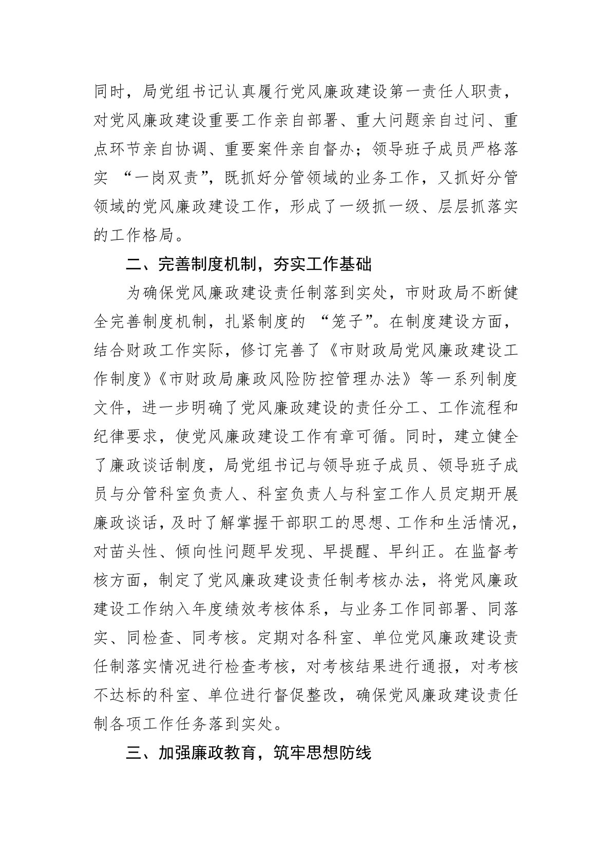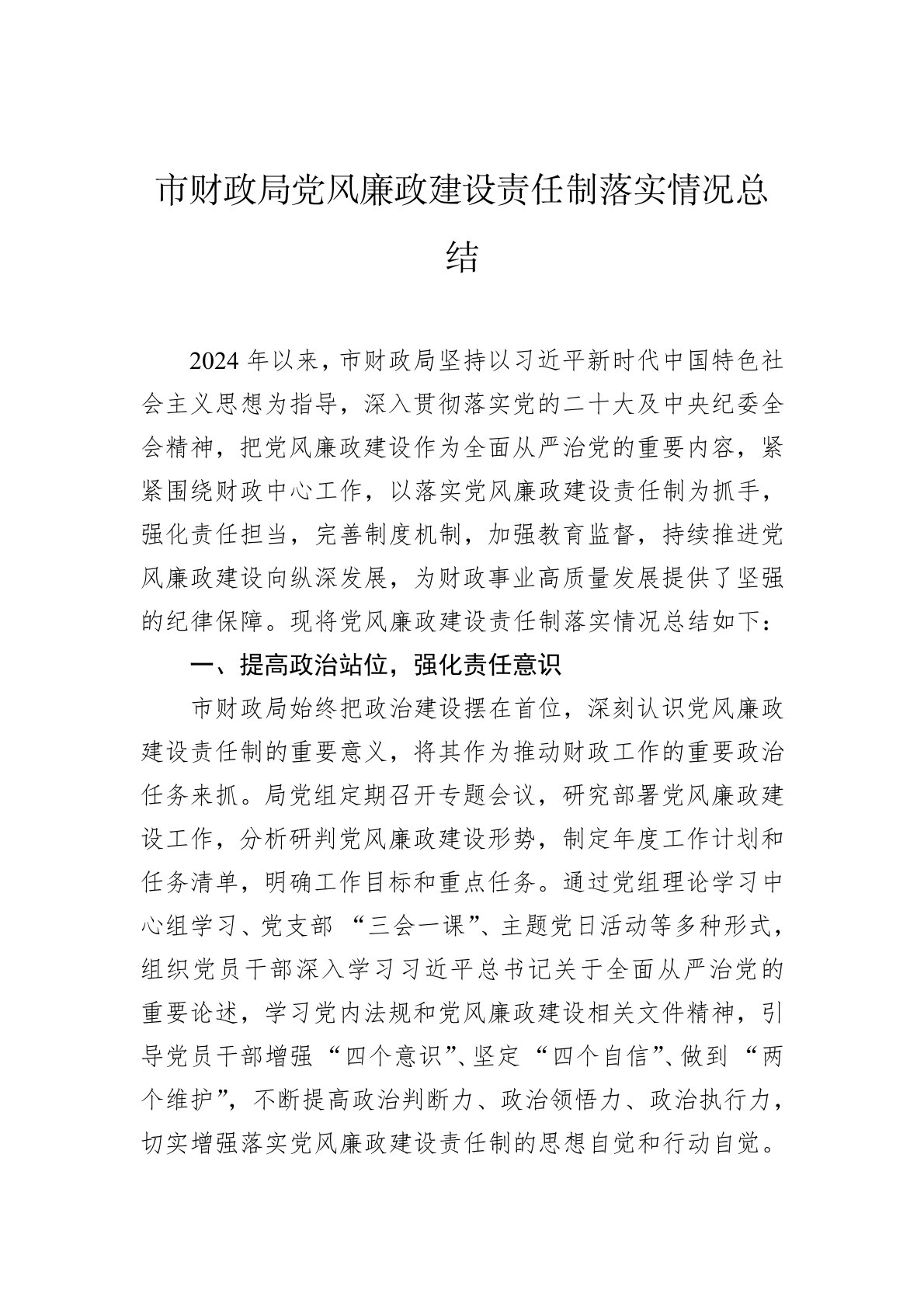 2024年以来,市财政局坚持以习近平新时代中国特色社会主义思想为指导,深入贯彻落实党的二十大及中央纪委全会精神,把党风廉政建设作为全面从严治党的重要内容,紧紧围绕财政中心工作,以落实党风廉政建设责任制为抓手,强化责任担当,完善制度机制,加强教育监督,持续推进党风廉政建设向纵深发展,为财政事业高质量发展提供了坚强的纪律保障。现将党风廉政建设责任制落实情况总结如下:一、提高政治站位,强化责任意识市财政局始终把政治建设摆在首位,深刻认识党风廉政建设责任制的重要意义,将其作为推动财政工作的重要政治任务来抓。局党组定期召开专题会议,研究部署党风廉政建设工作,分析研判党风廉政建设形势,制定年度工作计划和任...