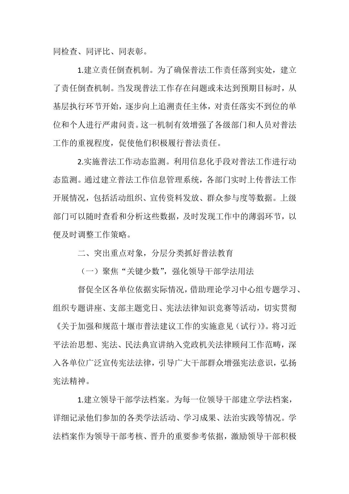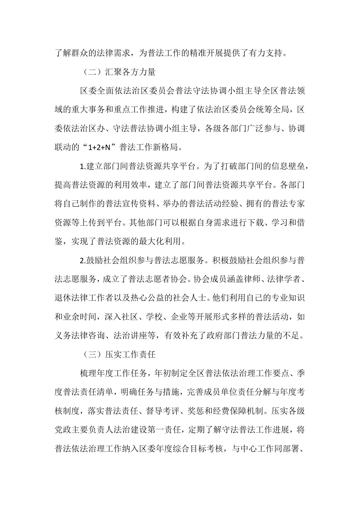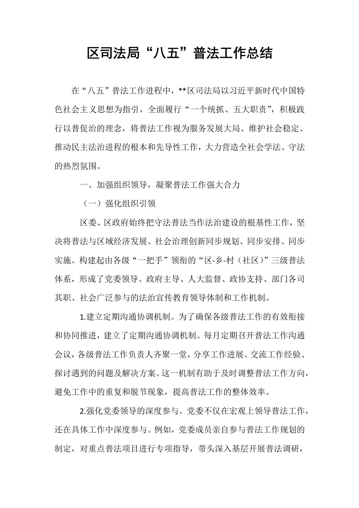 区司法局“八五”普法工作总结在“八五”普法工作进程中,**区司法局以习近平新时代中国特色社会主义思想为指引,全面履行“一个统抓、五大职责”,积极践行以普促治的理念,将普法工作视为服务发展大局、维护社会稳定、推动民主法治进程的根本和先导性工作,大力营造全社会学法、守法的热烈氛围。一、加强组织领导,凝聚普法工作强大合力(一)强化组织引领区委、区政府始终把守法普法当作法治建设的根基性工作,坚决将普法与区域经济发展、社会治理创新同步规划、同步安排、同步实施。构建起由各级“一把手”领衔的“区-乡-村(社区)”三级普法体系,形成了党委领导、政府主导、人大监督、政协支持、部门各司其职、社会广泛参与的法治宣传...