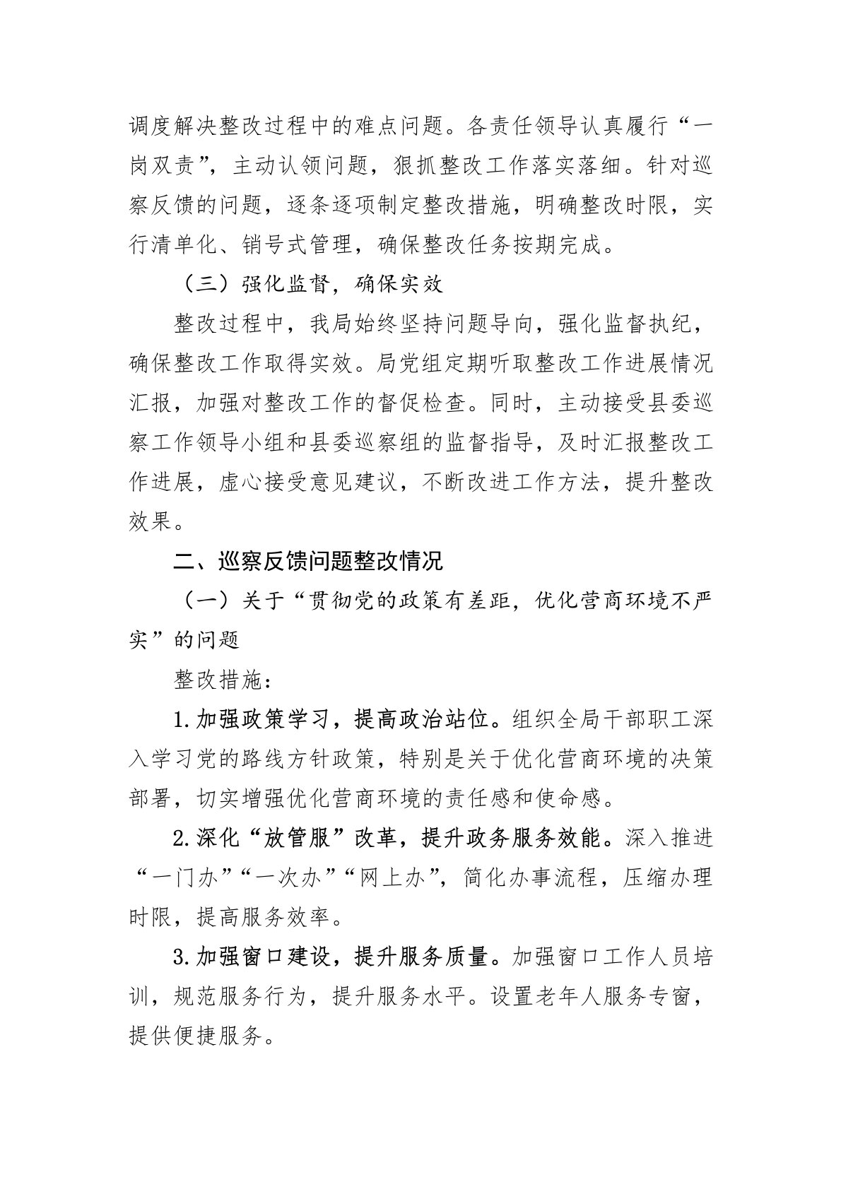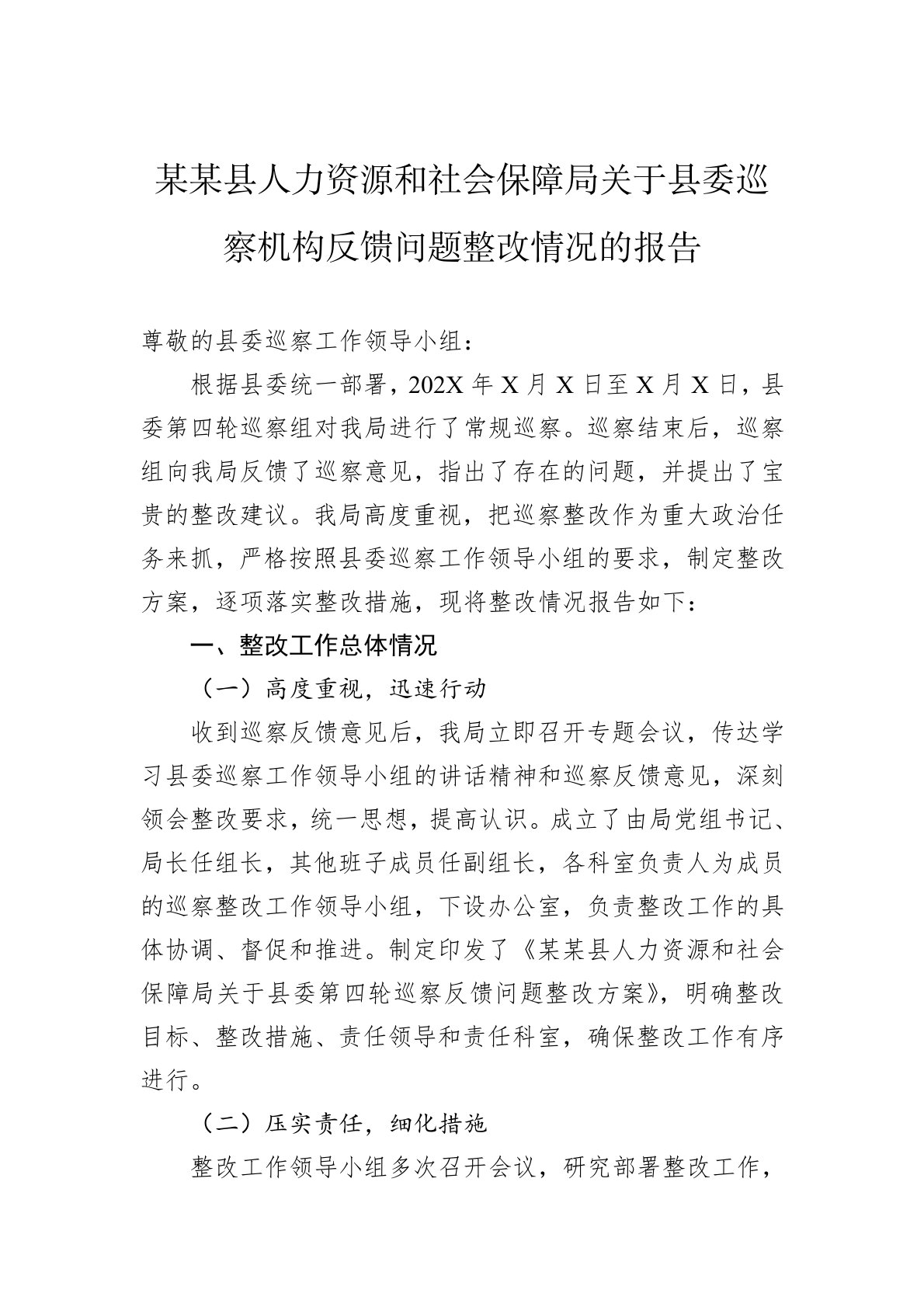 尊敬的县委巡察工作领导小组:根据县委统一部署,202X年X月X日至X月X日,县委第四轮巡察组对我局进行了常规巡察。巡察结束后,巡察组向我局反馈了巡察意见,指出了存在的问题,并提出了宝贵的整改建议。我局高度重视,把巡察整改作为重大政治任务来抓,严格按照县委巡察工作领导小组的要求,制定整改方案,逐项落实整改措施,现将整改情况报告如下:一、整改工作总体情况(一)高度重视,迅速行动收到巡察反馈意见后,我局立即召开专题会议,传达学习县委巡察工作领导小组的讲话精神和巡察反馈意见,深刻领会整改要求,统一思想,提高认识。成立了由局党组书记、局长任组长,其他班子成员任副组长,各科室负责人为成员的巡察整改工作领导...