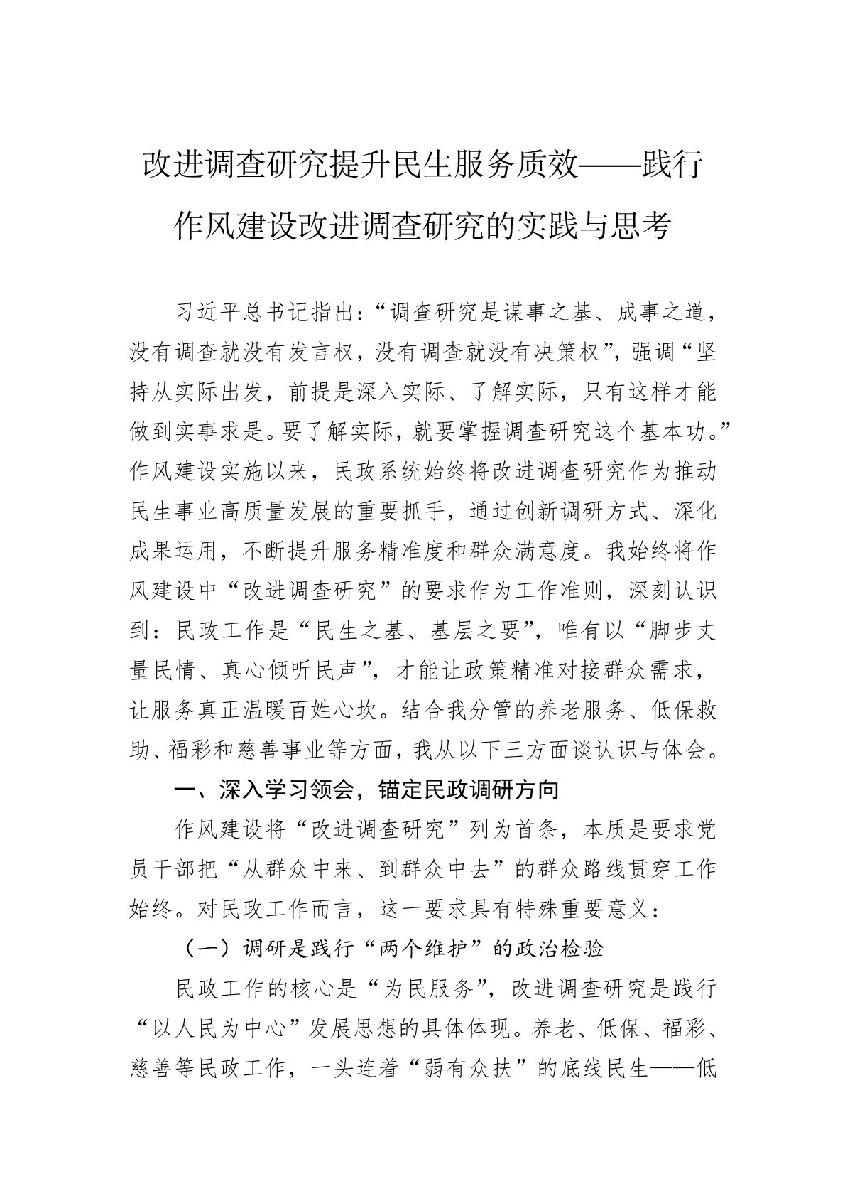 习近平总书记指出:“调查研究是谋事之基、成事之道,没有调查就没有发言权,没有调查就没有决策权”,强调“坚持从实际出发,前提是深入实际、了解实际,只有这样才能做到实事求是。要了解实际,就要掌握调查研究这个基本功。”作风建设实施以来,民政系统始终将改进调查研究作为推动民生事业高质量发展的重要抓手,通过创新调研方式、深化成果运用,不断提升服务精准度和群众满意度。我始终将作风建设中“改进调查研究”的要求作为工作准则,深刻认识到:民政工作是“民生之基、基层之要”,唯有以“脚步丈量民情、真心倾听民声”,才能让政策精准对接群众需求,让服务真正温暖百姓心坎。结合我分管的养老服务、低保救助、福彩和慈善事业等方面...