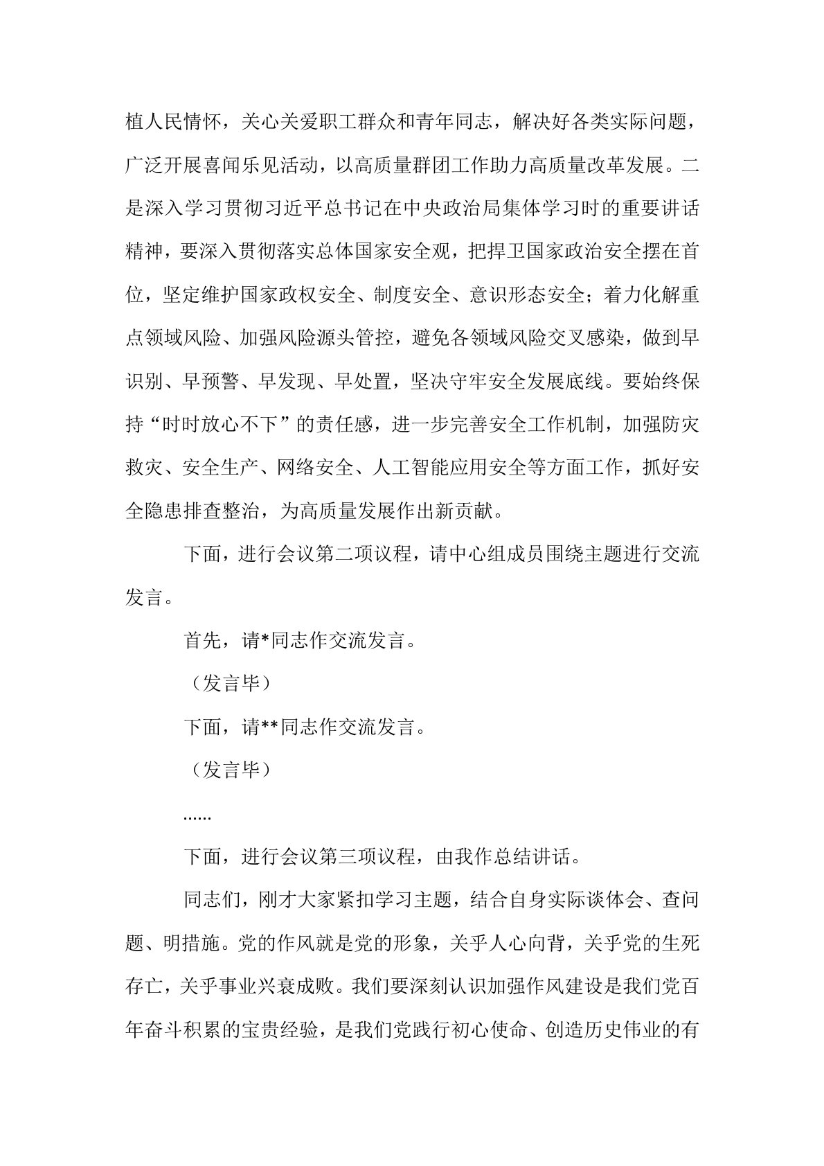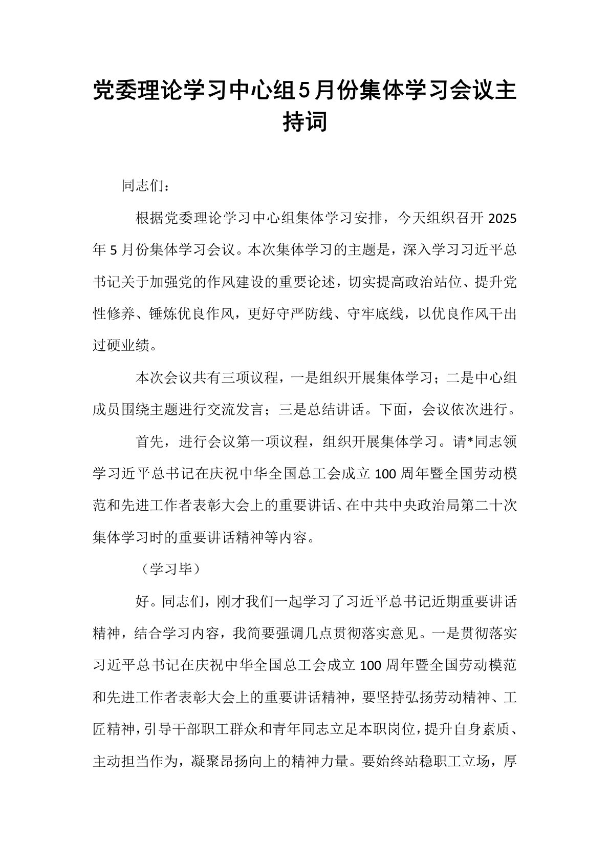 党委理论学习中心组5月份集体学习会议主持词同志们:根据党委理论学习中心组集体学习安排,今天组织召开2025年5月份集体学习会议。本次集体学习的主题是,深入学习习近平总书记关于加强党的作风建设的重要论述,切实提高政治站位、提升党性修养、锤炼优良作风,更好守严防线、守牢底线,以优良作风干出过硬业绩。本次会议共有三项议程,一是组织开展集体学习;二是中心组成员围绕主题进行交流发言;三是总结讲话。下面,会议依次进行。首先,进行会议第一项议程,组织开展集体学习。请*同志领学习近平总书记在庆祝中华全国总工会成立100周年暨全国劳动模范和先进工作者表彰大会上的重要讲话、在中共中央政治局第二十次集体学习时的重要...