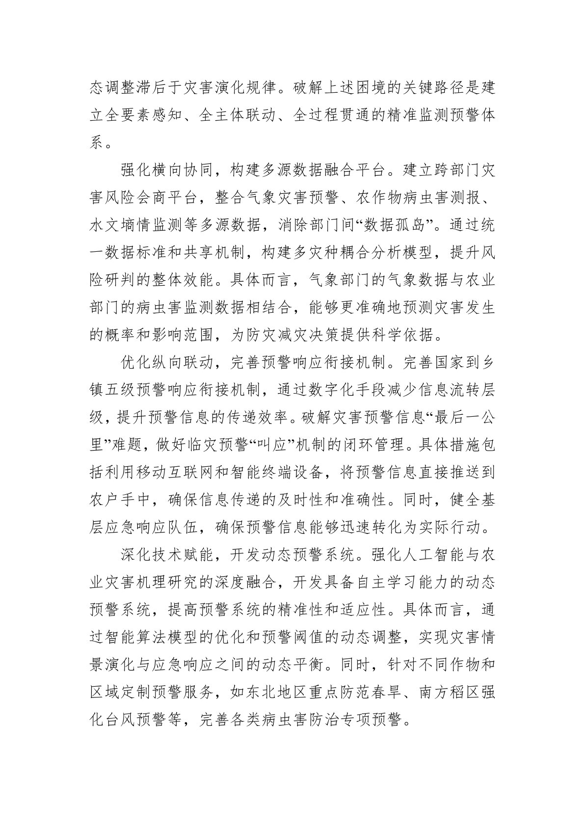 近年来,全球气候变化加剧,极端天气事件频发,我国农业生产面临“旱涝并存、显隐交织、链式衍生”的复合型灾害风险。农业防灾减灾能力建设事关国家粮食安全和重要农产品稳定供给,是经济社会发展的重要保障。2025年中央一号文件将“加强农业防灾减灾能力建设”作为重要战略部署,可见加强农业防灾减灾能力建设是保障国家粮食安全、推进乡村全面振兴的重要任务。为此,筑牢农业防灾减灾体系建设,应从监测预警、工程防御、社会协同这三个方面着力,进一步提升农业防灾减灾能力。一是构建精准高效的监测预警体系。农业灾害监测预警体系是农业风险治理的前端抓手,其精准化程度直接影响防灾减灾行动的时度效。我国农业灾害监测预警体系已形成农...
