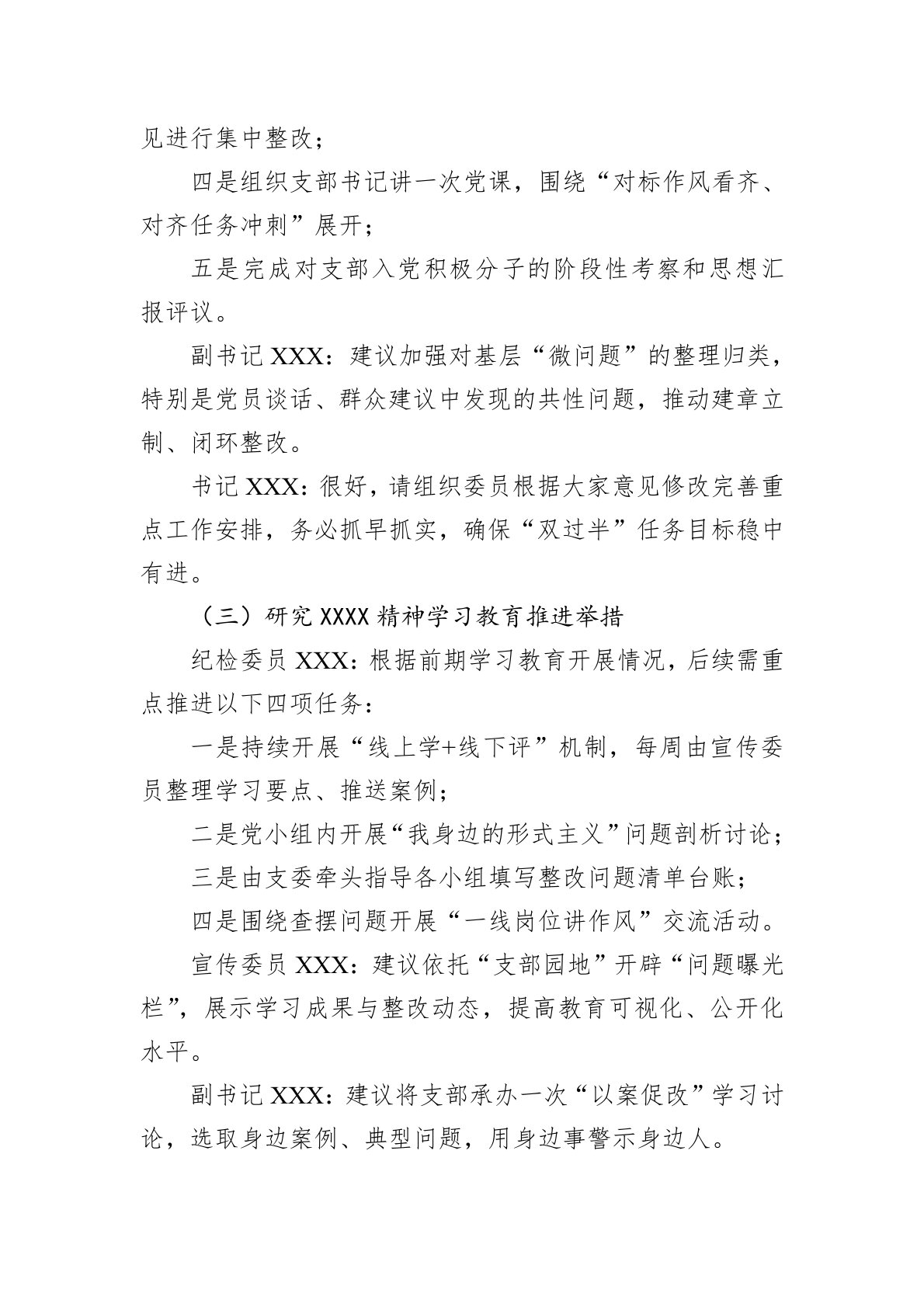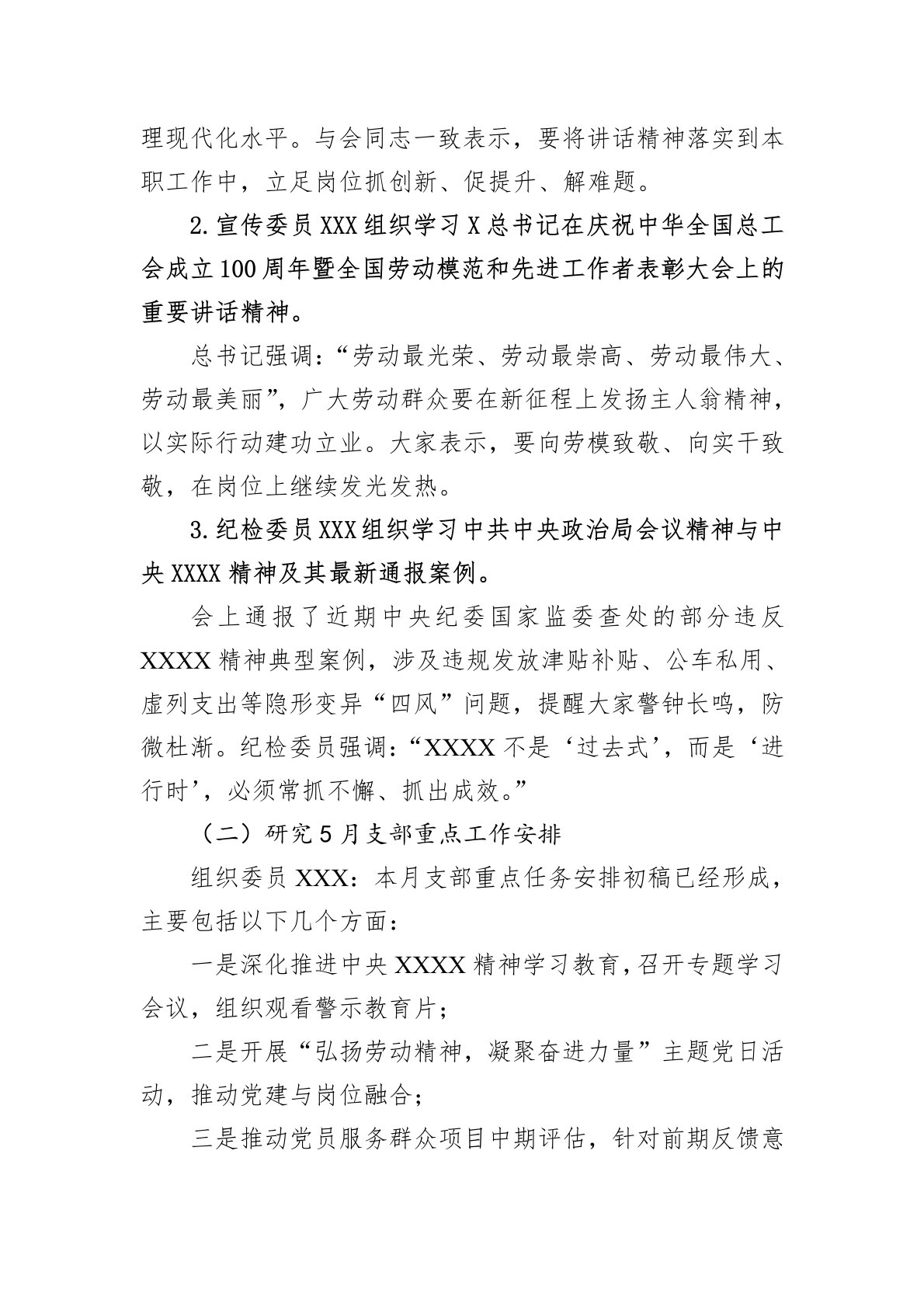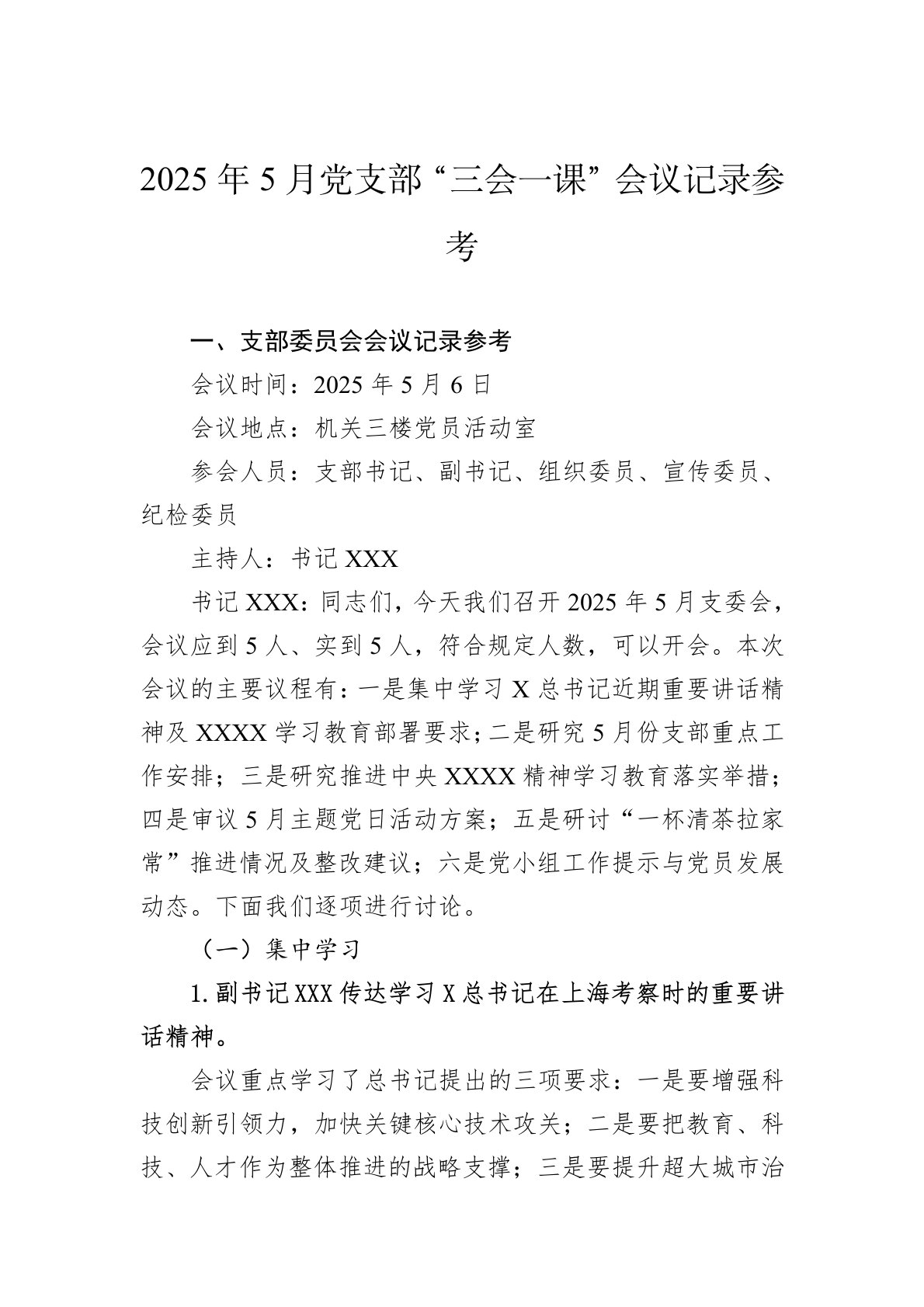 一、支部委员会会议记录参考会议时间:2025年5月6日会议地点:机关三楼党员活动室参会人员:支部书记、副书记、组织委员、宣传委员、纪检委员主持人:书记XXX书记XXX:同志们,今天我们召开2025年5月支委会,会议应到5人、实到5人,符合规定人数,可以开会。本次会议的主要议程有:一是集中学习X总书记近期重要讲话精神及XXXX学习教育部署要求;二是研究5月份支部重点工作安排;三是研究推进中央XXXX精神学习教育落实举措;四是审议5月主题党日活动方案;五是研讨“一杯清茶拉家常”推进情况及整改建议;六是党小组工作提示与党员发展动态。下面我们逐项进行讨论。(一)集中学习1.副书记XXX传达学习X总书记...
