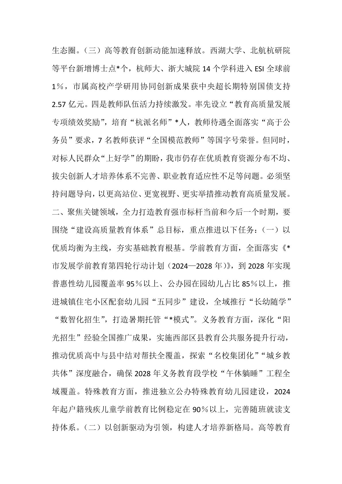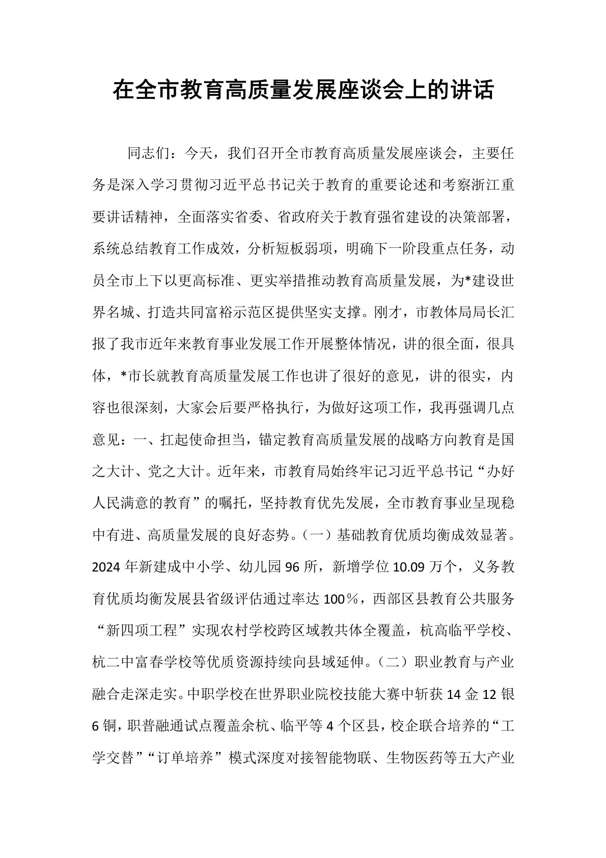 在全市教育高质量发展座谈会上的讲话 同志们:今天,我们召开全市教育高质量发展座谈会,主要任务是深入学习贯彻习近平总书记关于教育的重要论述和考察浙江重要讲话精神,全面落实省委、省政府关于教育强省建设的决策部署,系统总结教育工作成效,分析短板弱项,明确下一阶段重点任务,动员全市上下以更高标准、更实举措推动教育高质量发展,为*建设世界名城、打造共同富裕示范区提供坚实支撑。刚才,市教体局局长汇报了我市近年来教育事业发展工作开展整体情况,讲的很全面,很具体,*市长就教育高质量发展工作也讲了很好的意见,讲的很实,内容也很深刻,大家会后要严格执行,为做好这项工作,我再强调几点意见:一、扛起使命担当,锚定教...