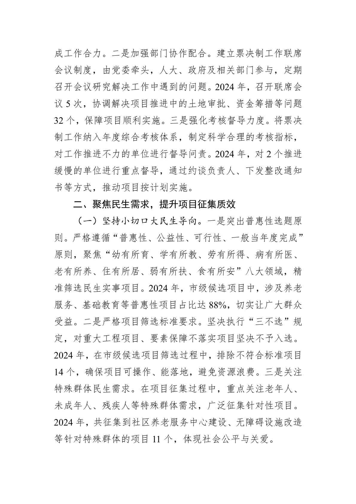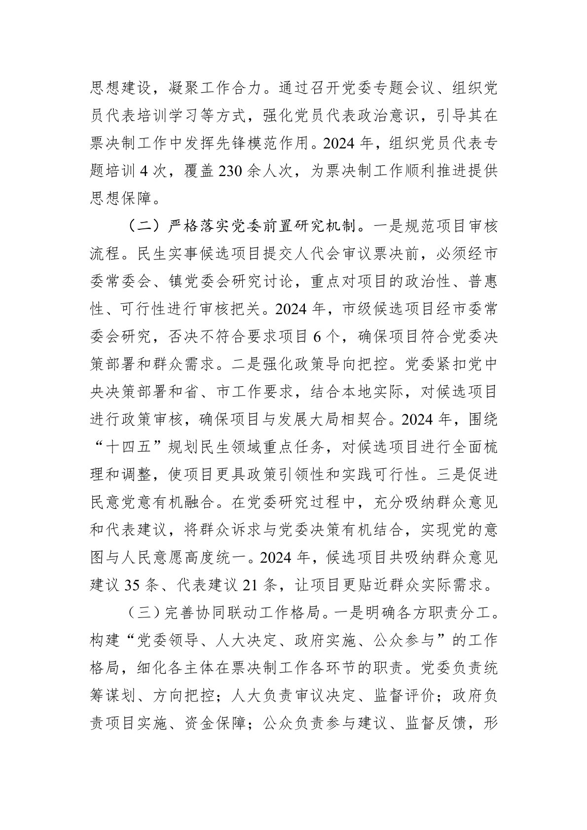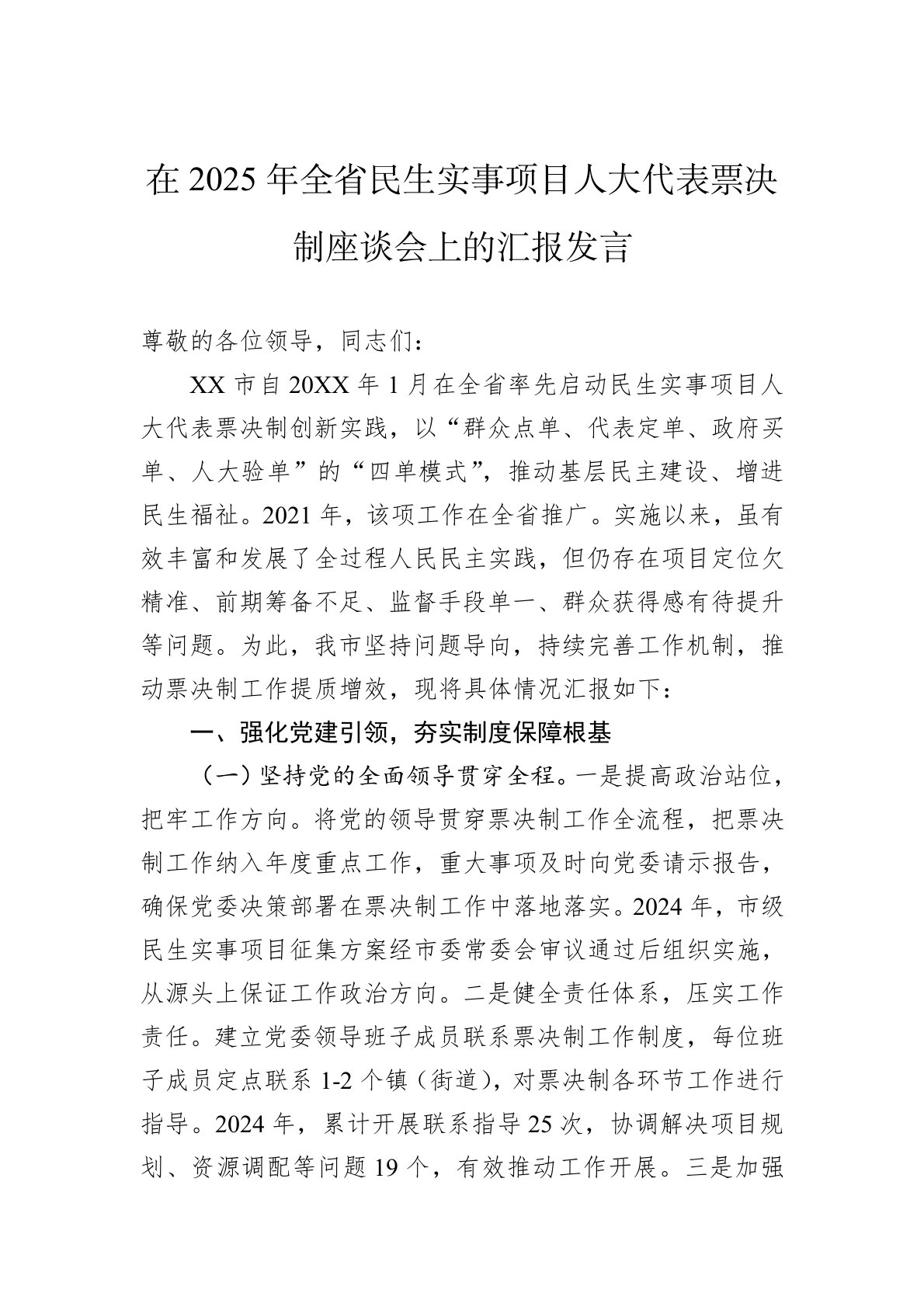 尊敬的各位领导,同志们:XX市自20XX年1月在全省率先启动民生实事项目人大代表票决制创新实践,以“群众点单、代表定单、政府买单、人大验单”的“四单模式”,推动基层民主建设、增进民生福祉。2021年,该项工作在全省推广。实施以来,虽有效丰富和发展了全过程人民民主实践,但仍存在项目定位欠精准、前期筹备不足、监督手段单一、群众获得感有待提升等问题。为此,我市坚持问题导向,持续完善工作机制,推动票决制工作提质增效,现将具体情况汇报如下:一、强化党建引领,夯实制度保障根基(一)坚持党的全面领导贯穿全程。一是提高政治站位,把牢工作方向。将党的领导贯穿票决制工作全流程,把票决制工作纳入年度重点工作,重大事...