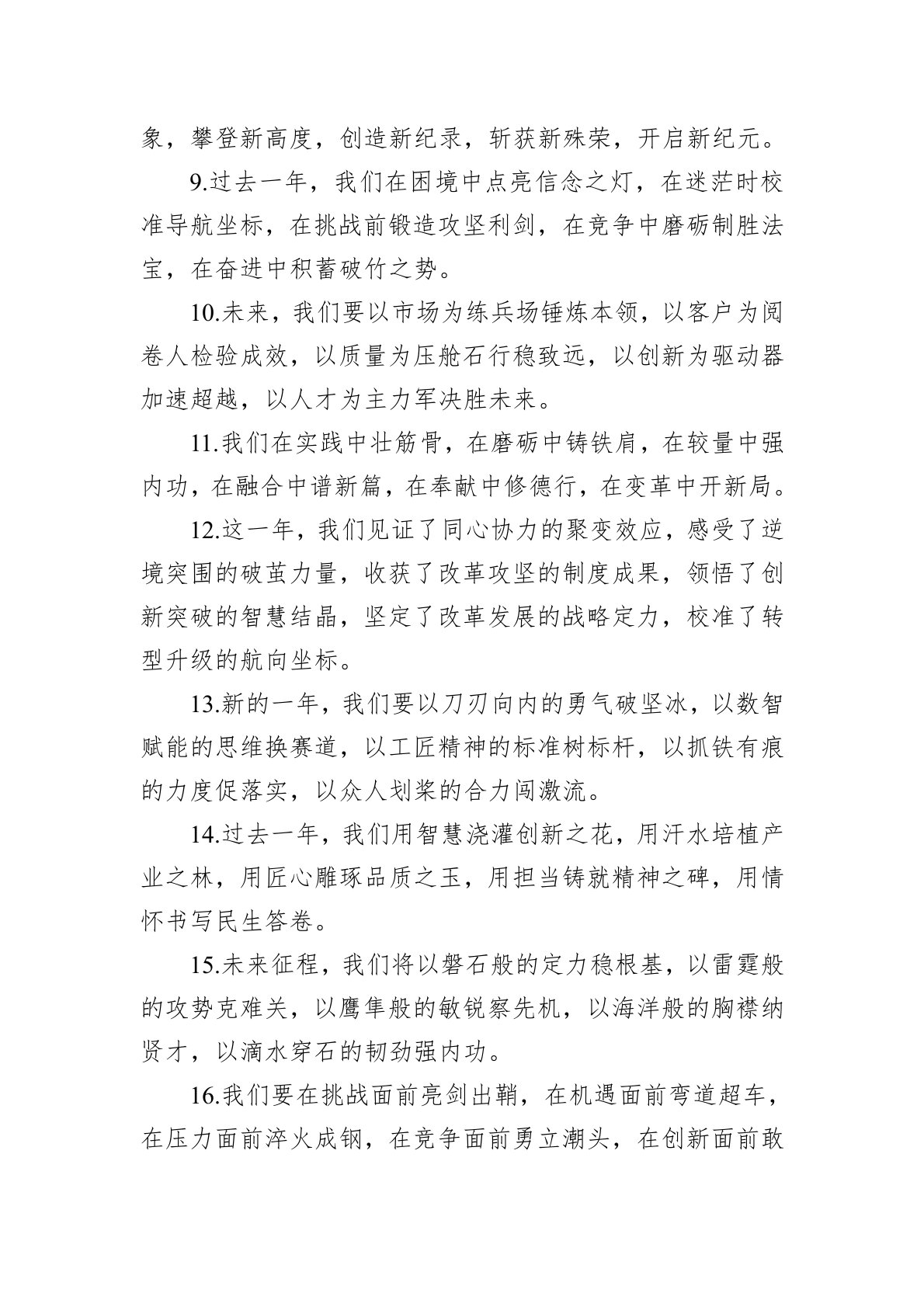 1.过去一年,我们以探路者的勇气开拓未知疆域,以耕耘者的执着培育希望田野,以守护者的初心筑牢民生根基,以破冰者的锐气破解发展困局,以领航者的视野擘画战略蓝图。2.这一年,我们在政策调整中谋先机,在行业洗牌中塑格局,在技术创新中攀高地,在服务升级中铸口碑,在团队建设中聚星火。3.我们用坚守固底色,用突破闯新路,用匠心琢精品,用拼搏摘桂冠,用协作汇江海,用情怀写答卷。4.2025年,我们以登山者的专注征服技术巅峰,以垦荒者的热忱开发新兴领域,以追梦者的执着描绘未来图景,以弄潮者的胆识引领行业风向,以传承者的担当培育人才梯队。5.这一年,我们啃下了制约发展的硬骨头,突破了桎梏创新的封锁线,点亮了转型...