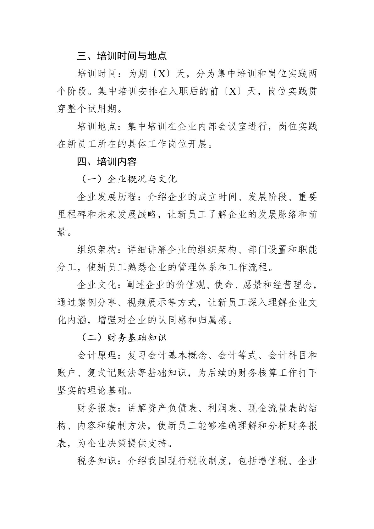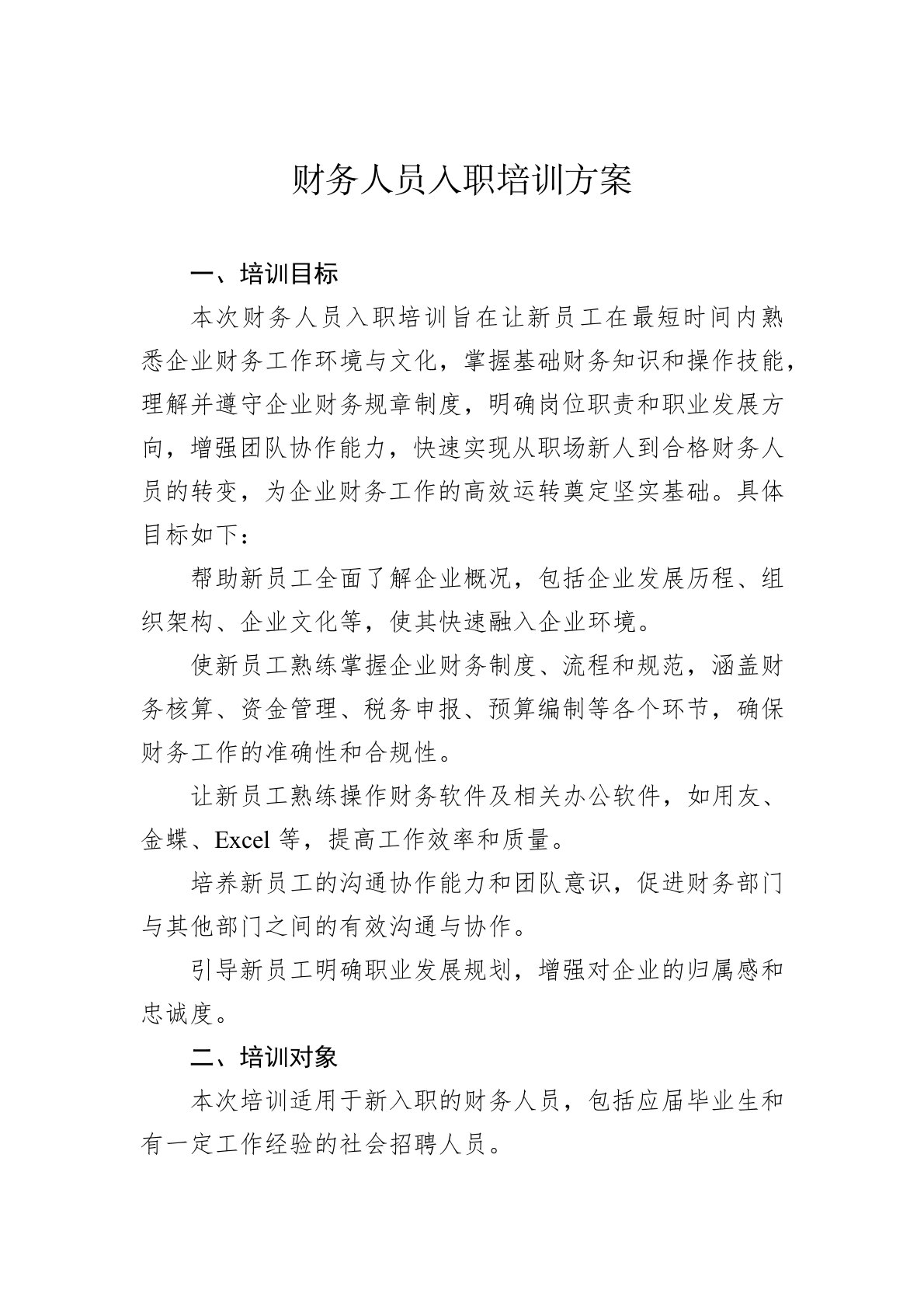 一、培训目标本次财务人员入职培训旨在让新员工在最短时间内熟悉企业财务工作环境与文化,掌握基础财务知识和操作技能,理解并遵守企业财务规章制度,明确岗位职责和职业发展方向,增强团队协作能力,快速实现从职场新人到合格财务人员的转变,为企业财务工作的高效运转奠定坚实基础。具体目标如下:帮助新员工全面了解企业概况,包括企业发展历程、组织架构、企业文化等,使其快速融入企业环境。使新员工熟练掌握企业财务制度、流程和规范,涵盖财务核算、资金管理、税务申报、预算编制等各个环节,确保财务工作的准确性和合规性。让新员工熟练操作财务软件及相关办公软件,如用友、金蝶、Excel等,提高工作效率和质量。培养新员工的沟通协...