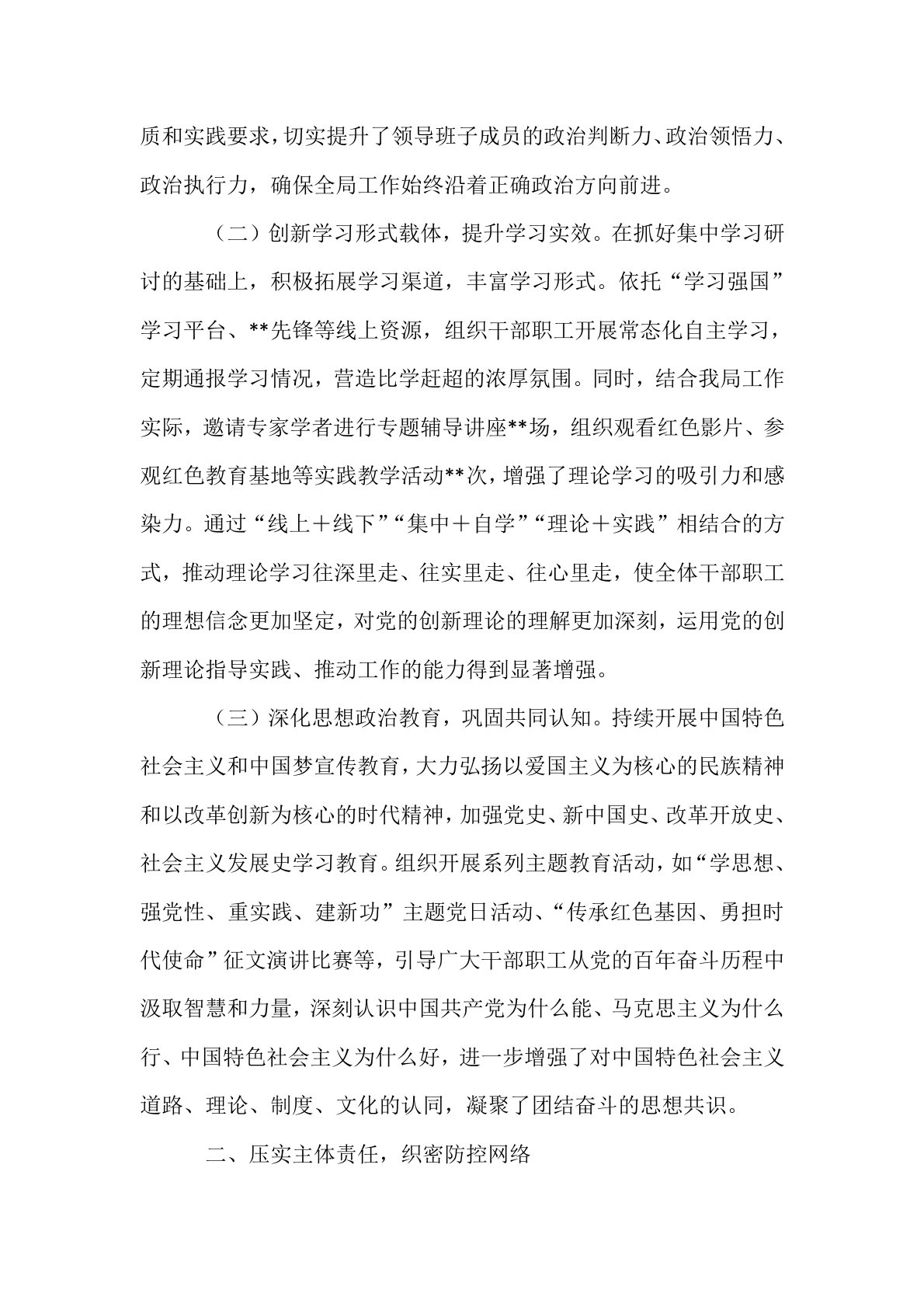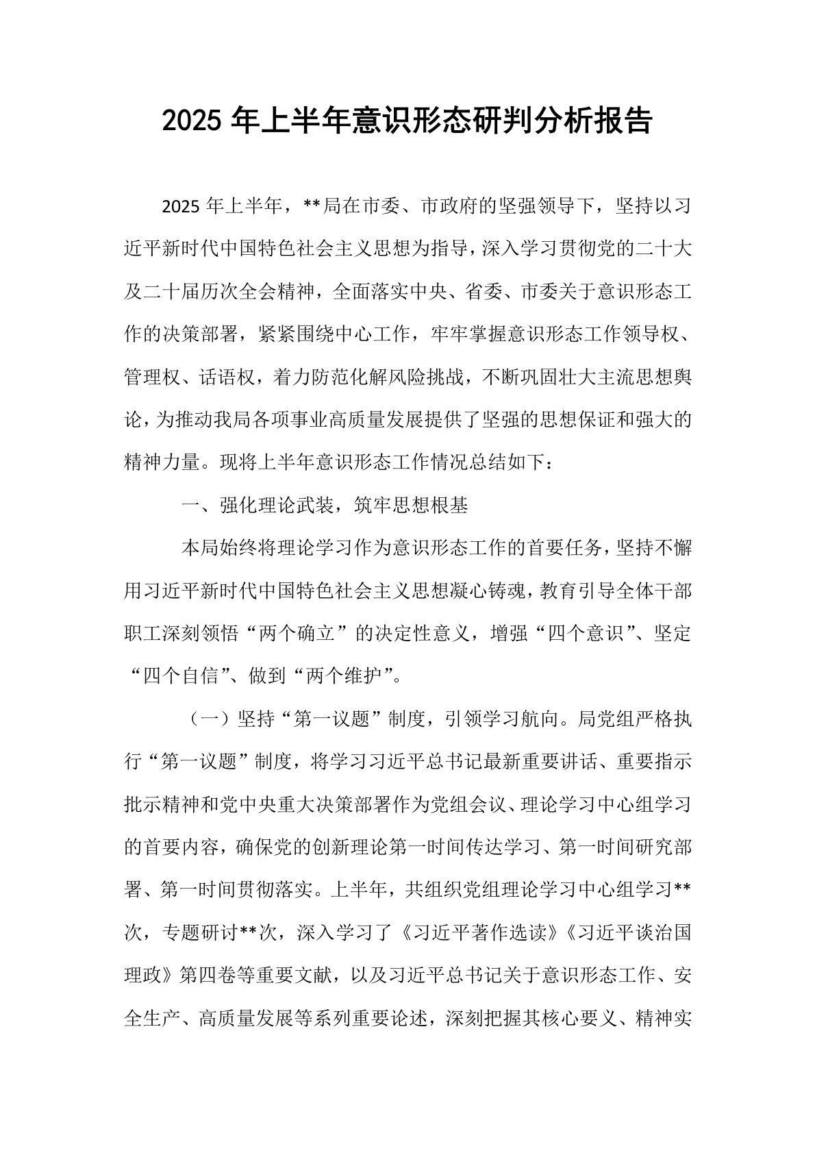 2025年上半年意识形态研判分析报告2025年上半年,**局在市委、市政府的坚强领导下,坚持以习近平新时代中国特色社会主义思想为指导,深入学习贯彻党的二十大及二十届历次全会精神,全面落实中央、省委、市委关于意识形态工作的决策部署,紧紧围绕中心工作,牢牢掌握意识形态工作领导权、管理权、话语权,着力防范化解风险挑战,不断巩固壮大主流思想舆论,为推动我局各项事业高质量发展提供了坚强的思想保证和强大的精神力量。现将上半年意识形态工作情况总结如下:一、强化理论武装,筑牢思想根基本局始终将理论学习作为意识形态工作的首要任务,坚持不懈用习近平新时代中国特色社会主义思想凝心铸魂,教育引导全体干部职工深刻领悟“...