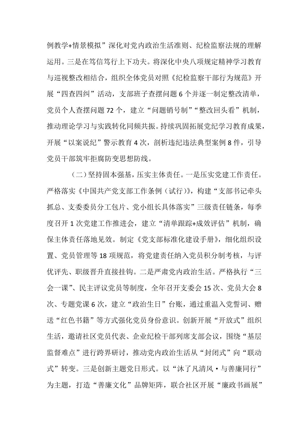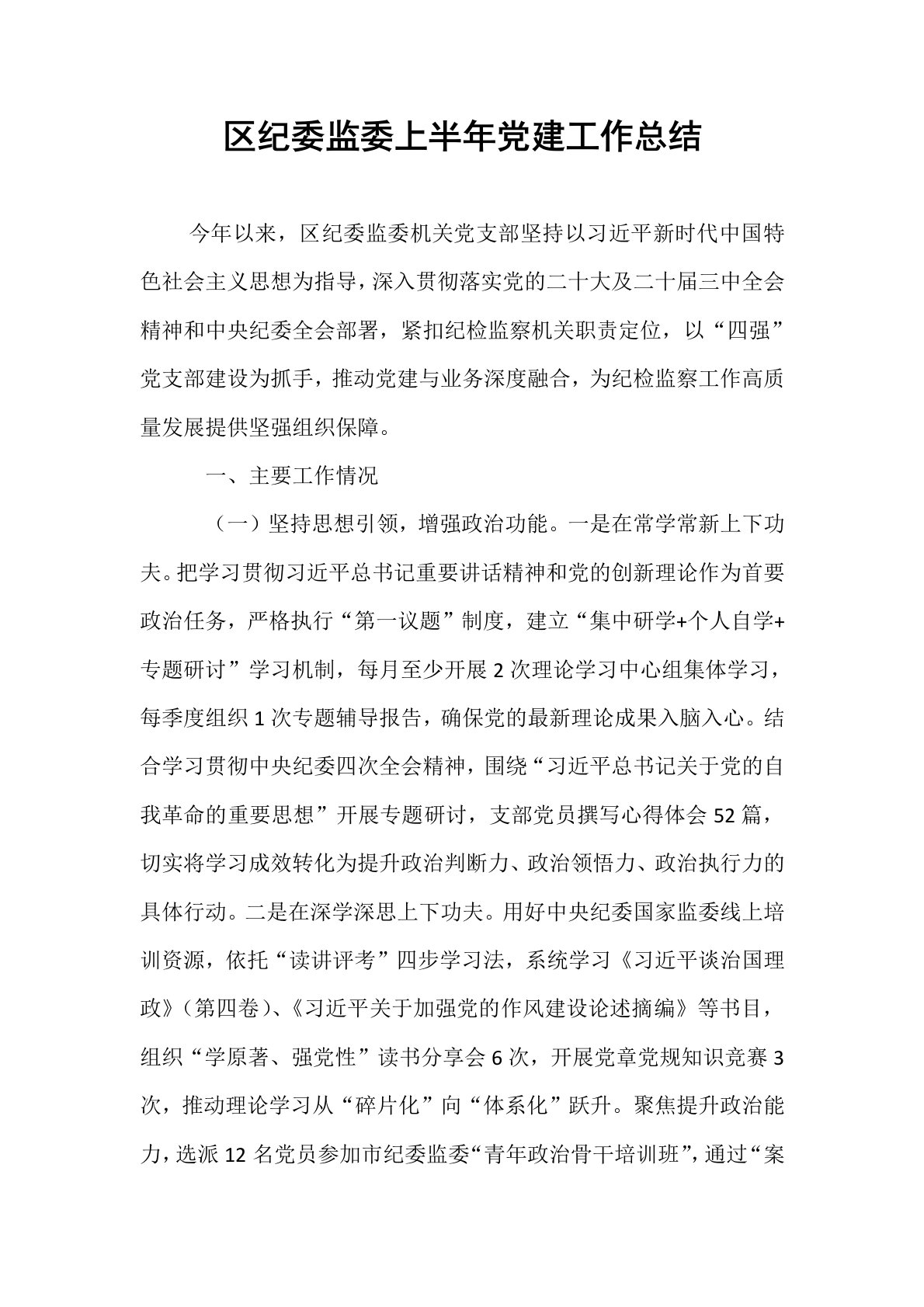 区纪委监委上半年党建工作总结 今年以来,区纪委监委机关党支部坚持以习近平新时代中国特色社会主义思想为指导,深入贯彻落实党的二十大及二十届三中全会精神和中央纪委全会部署,紧扣纪检监察机关职责定位,以“四强”党支部建设为抓手,推动党建与业务深度融合,为纪检监察工作高质量发展提供坚强组织保障。一、主要工作情况(一)坚持思想引领,增强政治功能。一是在常学常新上下功夫。把学习贯彻习近平总书记重要讲话精神和党的创新理论作为首要政治任务,严格执行“第一议题”制度,建立“集中研学+个人自学+专题研讨”学习机制,每月至少开展2次理论学习中心组集体学习,每季度组织1次专题辅导报告,确保党的最新理论成果入脑入心。...