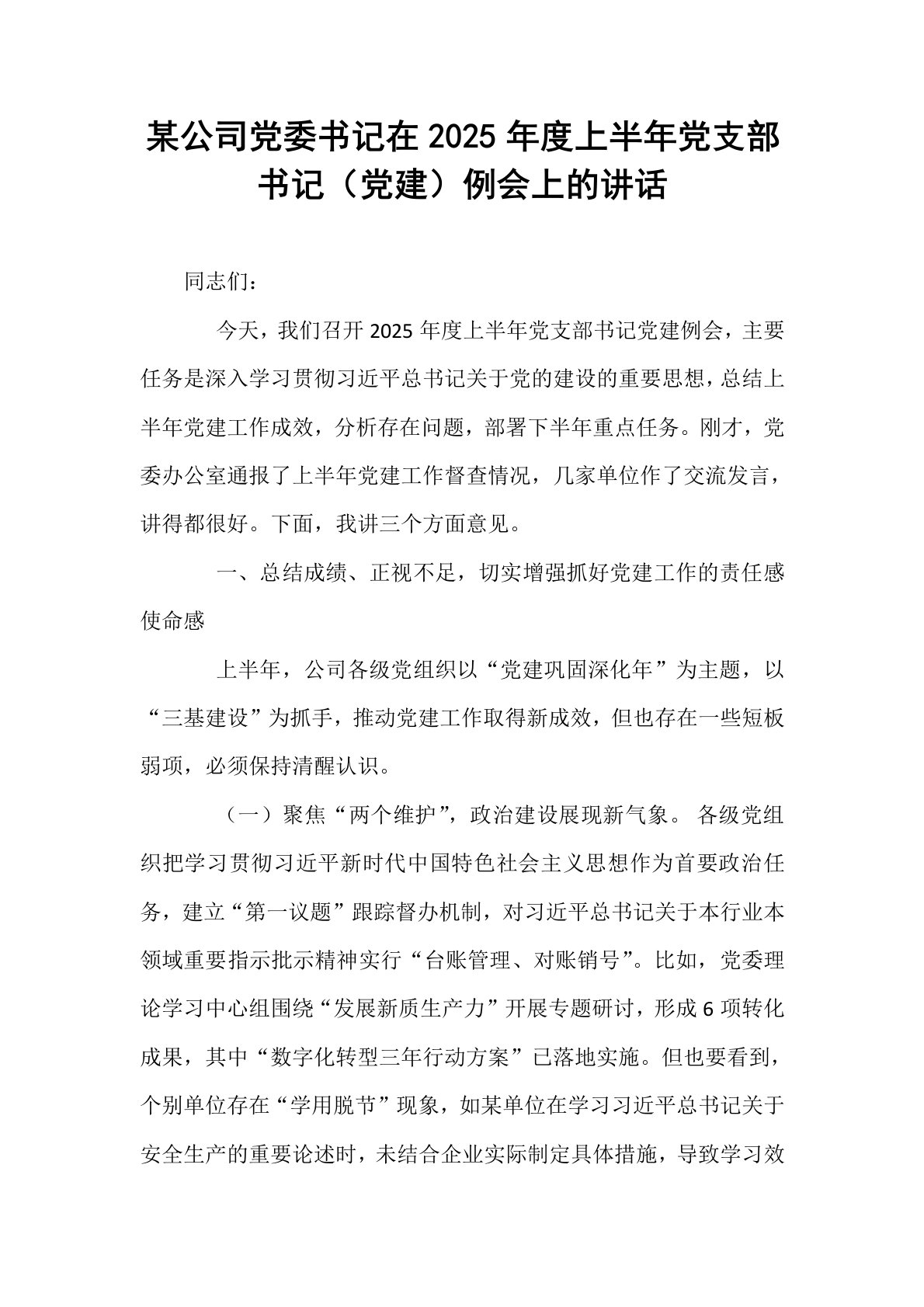 某公司党委书记在2025年度上半年党支部书记(党建)例会上的讲话同志们:今天,我们召开2025年度上半年党支部书记党建例会,主要任务是深入学习贯彻习近平总书记关于党的建设的重要思想,总结上半年党建工作成效,分析存在问题,部署下半年重点任务。刚才,党委办公室通报了上半年党建工作督查情况,几家单位作了交流发言,讲得都很好。下面,我讲三个方面意见。一、总结成绩、正视不足,切实增强抓好党建工作的责任感使命感上半年,公司各级党组织以“党建巩固深化年”为主题,以“三基建设”为抓手,推动党建工作取得新成效,但也存在一些短板弱项,必须保持清醒认识。(一)聚焦“两个维护”,政治建设展现新气象。 各级党组织把学习...