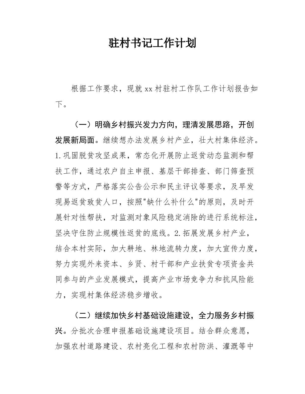 驻村书记工作计划根据工作要求,现就xx村驻村工作队工作计划报告如下。(一)明确乡村振兴发力方向,理清发展思路,开创发展新局面。继续想办法发展乡村产业,壮大村集体经济。1.巩固脱贫攻坚成果,常态化开展防止返贫动态监测和帮扶工作,通过农户自主申报、基层干部排查、部门筛查预警等方式,严格落实公告公示和民主评议等要求,及早发现易返贫致贫人口,按照"缺什么补什么"的原则,及时开展针对性帮扶,对监测对象风险稳定消除的进行系统标注,坚决守住防止规模性返贫的底线。2.拓展发展乡村产业,结合本村实际,加大耕地、林地流转力度,加大宣传力度,努力实现外来资本、乡贤、村干部和产业扶贫专项资金共同参与的产业发展模式,提...