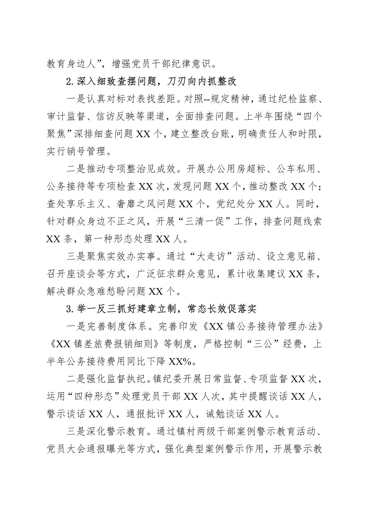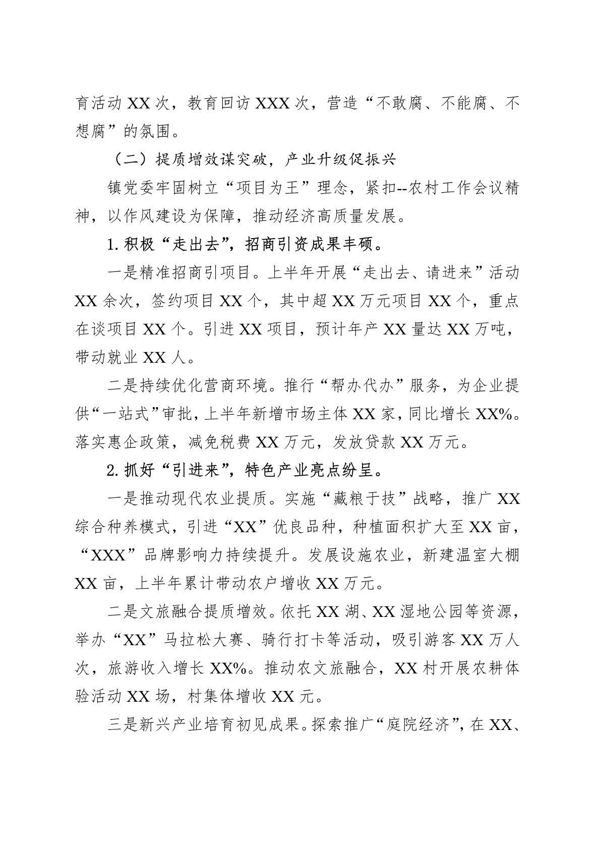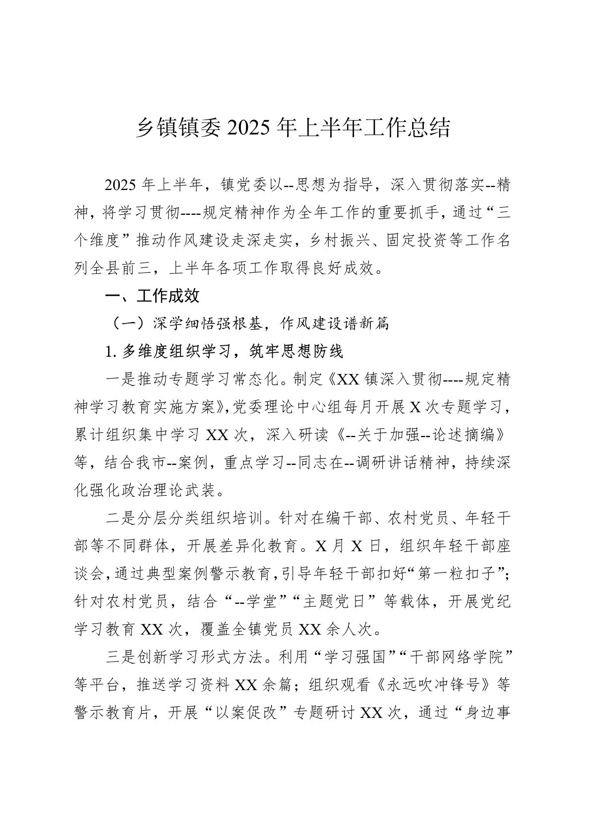 2025年上半年,镇党委以--思想为指导,深入贯彻落实--精神,将学习贯彻----规定精神作为全年工作的重要抓手,通过“三个维度”推动作风建设走深走实,乡村振兴、固定投资等工作名列全县前三,上半年各项工作取得良好成效。一、工作成效(一)深学细悟强根基,作风建设谱新篇1.多维度组织学习,筑牢思想防线一是推动专题学习常态化。制定《XX镇深入贯彻----规定精神学习教育实施方案》,党委理论中心组每月开展X次专题学习,累计组织集中学习XX次,深入研读《--关于加强--论述摘编》等,结合我市--案例,重点学习--同志在--调研讲话精神,持续深化强化政治理论武装。二是分层分类组织培训。针对在编干部、农村党...