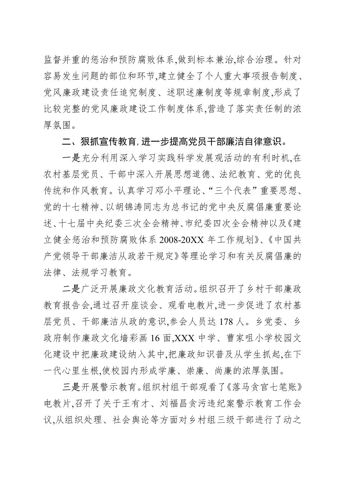 一年来,在县纪委的精心指导下,习近平乡党委、政府、纪委把贯彻落实党风廉政建设责任制作为一项经常性、长期性的重要工作来抓,以科学发展观为指导,认真贯彻落实党风廉政建设责任制,坚持标本兼治、综合治理的方针,以加强思想道德建设为基础,以规范和制约权力运行为核心,以保证党的惠农政策落实、维护群众根本利益为重点,扎实推进农村惩治和预防腐败体系建设,为推进全乡经济社会的快速健康发展提供了有力保障。一、加强组织领导,认真贯彻落实党风廉政建设责任制。乡党委、政府把农村基层党风廉政建设纳入党风廉政建设责任制考核的一项重要内容,坚持“党委统一领导,党政齐抓共管,纪委组织协调,各负其责,依靠群众的支持与参与”的领导...