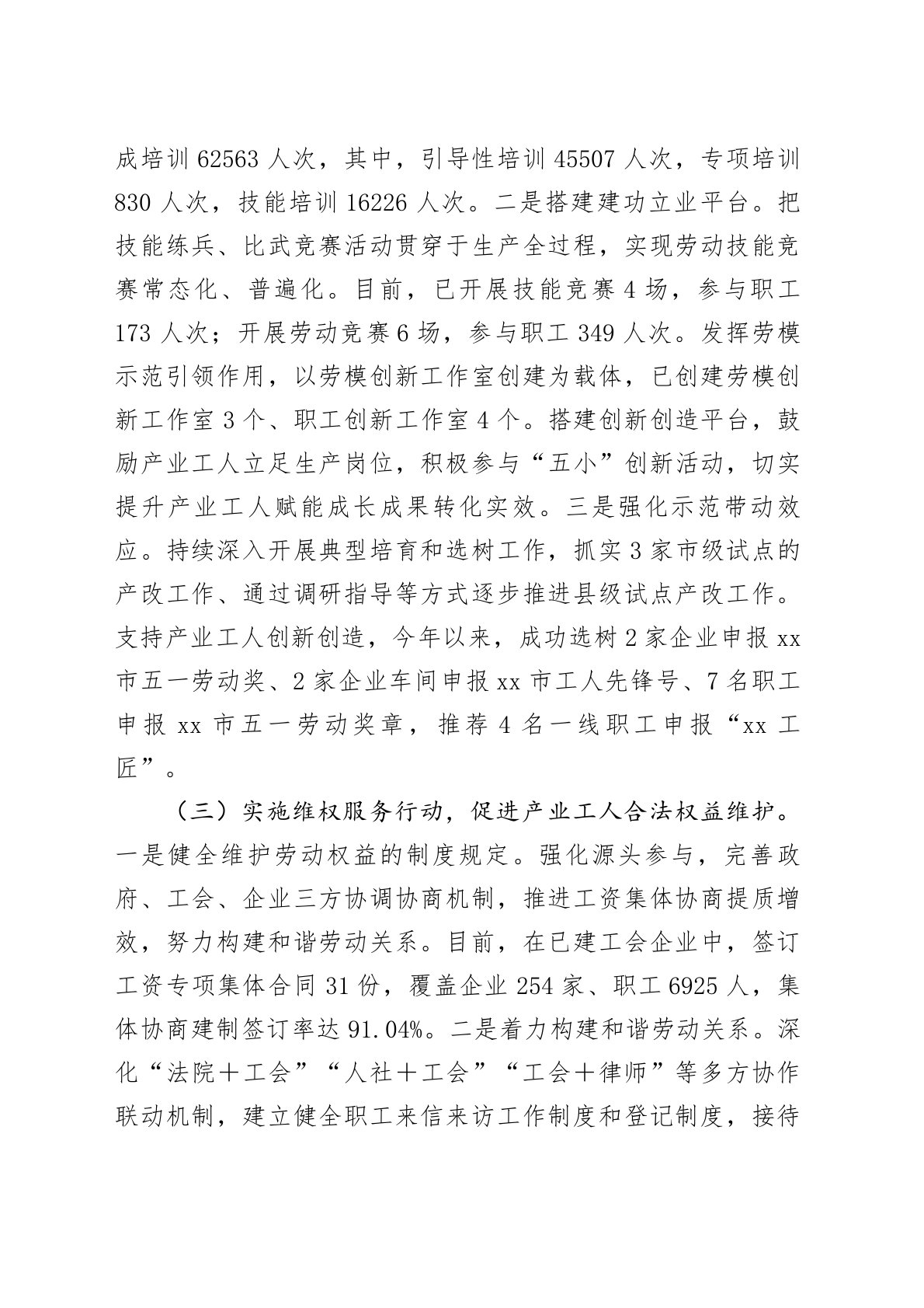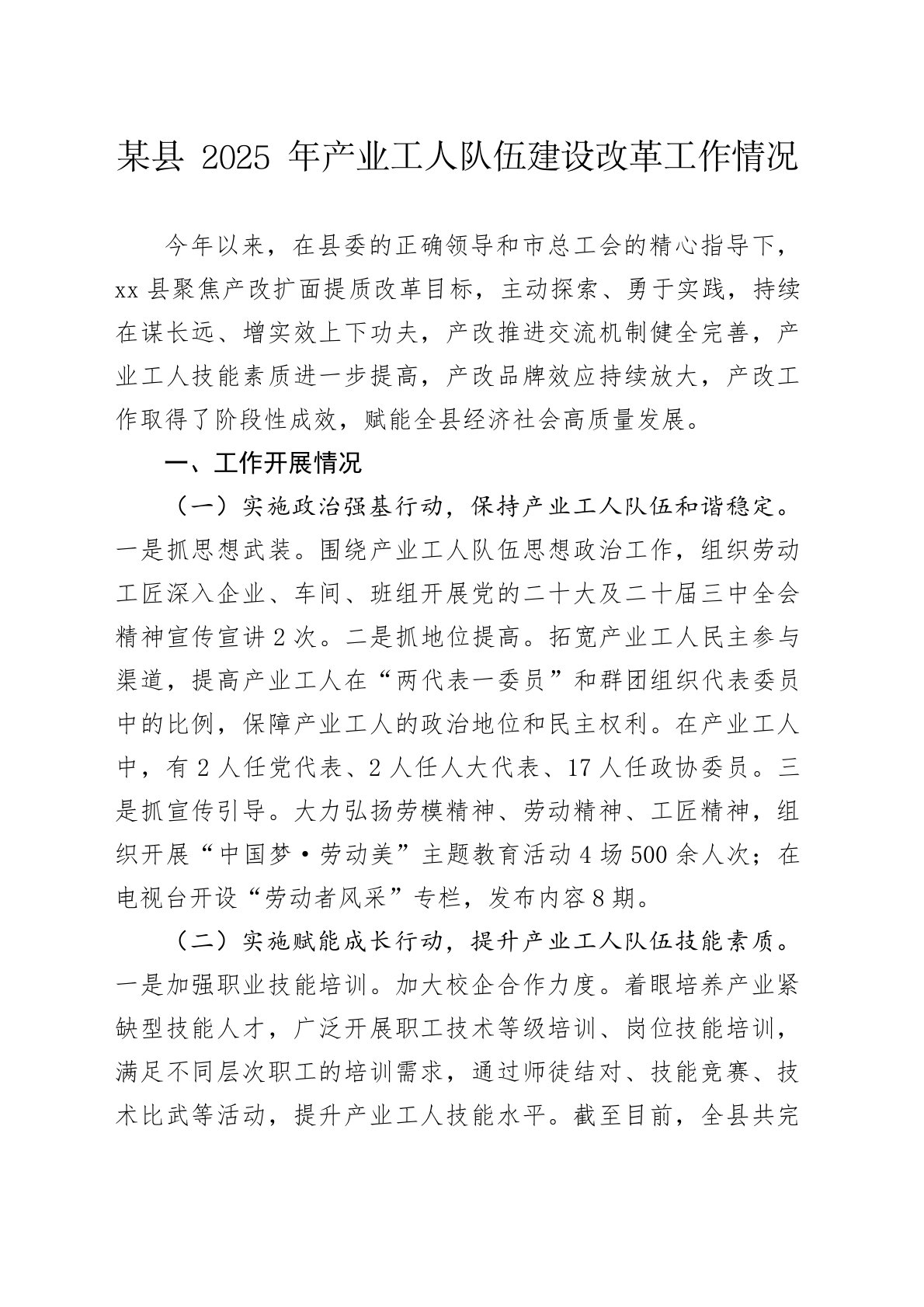 某县2025年产业工人队伍建设改革工作情况今年以来,在县委的正确领导和市总工会的精心指导下,xx县聚焦产改扩面提质改革目标,主动探索、勇于实践,持续在谋长远、增实效上下功夫,产改推进交流机制健全完善,产业工人技能素质进一步提高,产改品牌效应持续放大,产改工作取得了阶段性成效,赋能全县经济社会高质量发展。一、工作开展情况(一)实施政治强基行动,保持产业工人队伍和谐稳定。一是抓思想武装。围绕产业工人队伍思想政治工作,组织劳动工匠深入企业、车间、班组开展党的二十大及二十届三中全会精神宣传宣讲2次。二是抓地位提高。拓宽产业工人民主参与渠道,提高产业工人在“两代表一委员”和群团组织代表委员中的比例,保障...