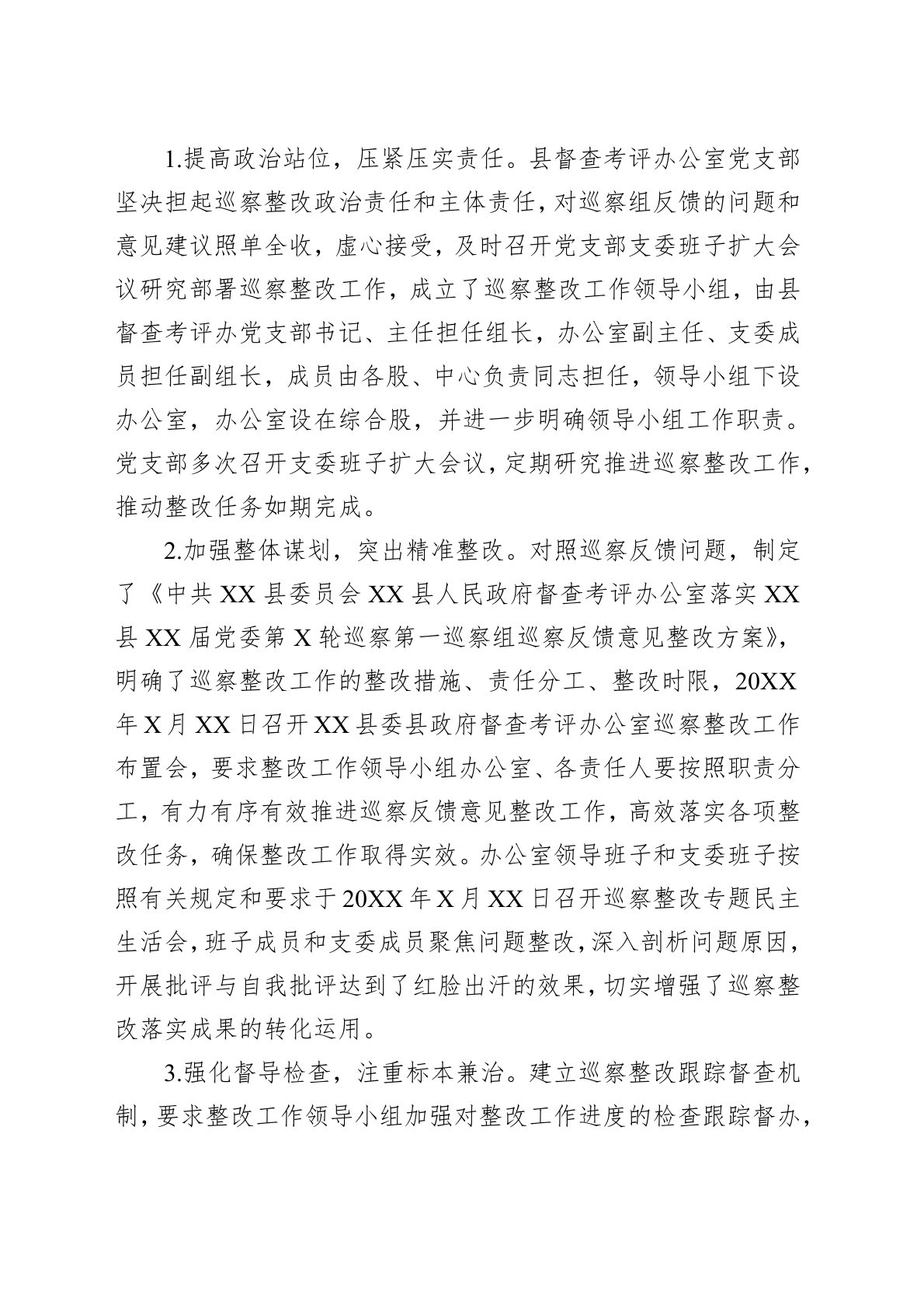 根据县委巡察工作统一部署,20XX年X月下旬至20XX年X月下旬,XX县X届党委第X轮巡察第X巡察组对本办开展了常规巡察。20XX年X月X日,XX县X届党委第X轮巡察第X巡察组向我办反馈了巡察意见。我办按照巡察工作有关要求,逐项对照巡察反馈意见,扎实做好各项整改工作,现将巡察反馈意见集中整改进展情况报告如下。一、党支部及支部书记组织落实整改情况(一)党支部履行巡察整改主体责任情况县督查考评办公室党支部坚持以习近平新时代中国特色社会主义思想为指导,认真贯彻党的二十大和二十届二中、三中全会精神以及习近平总书记关于XX工作论述的重要要求,深入学习贯彻习近平总书记关于巡视工作的重要论述,提高政治站位,...