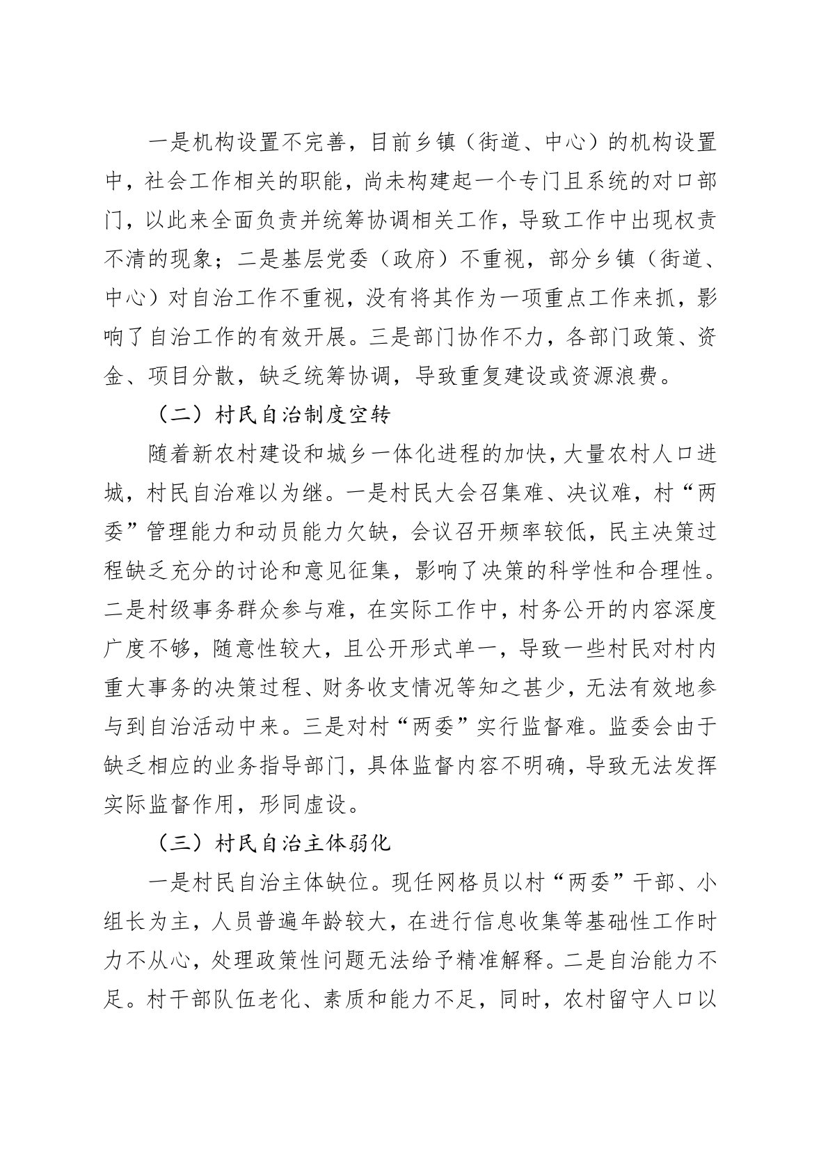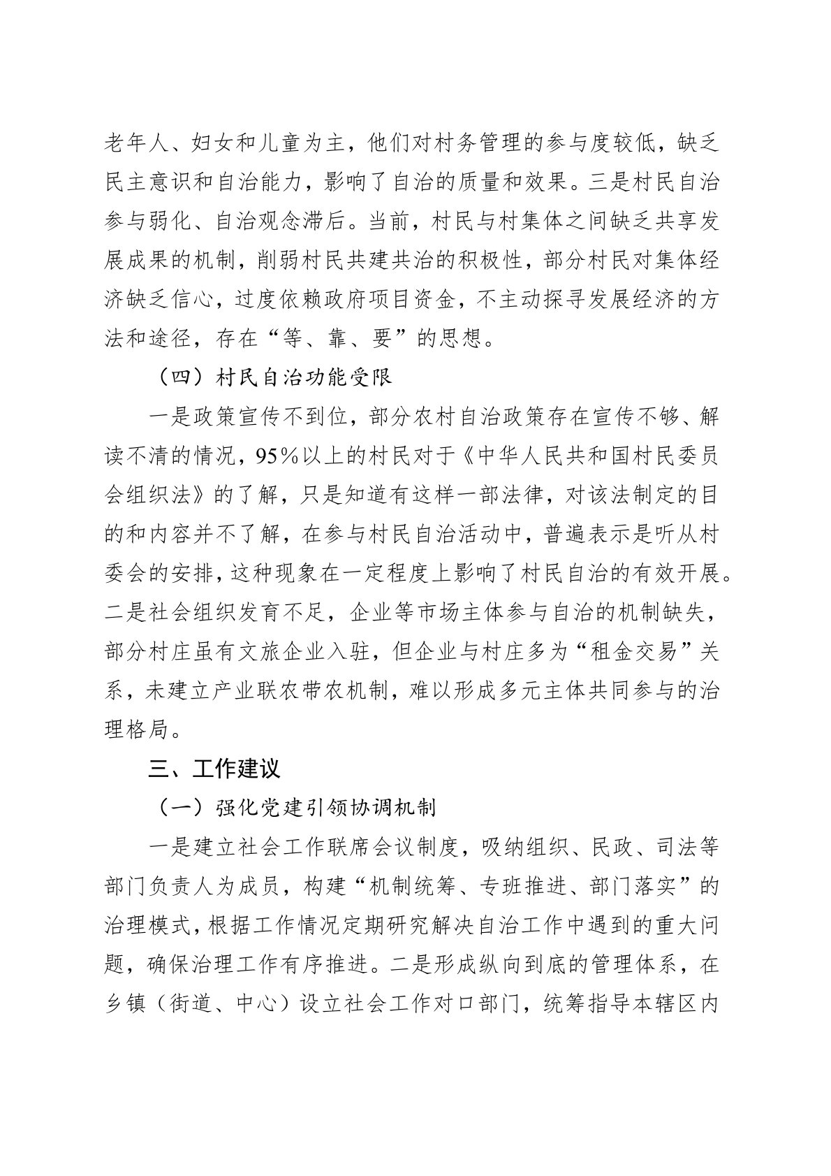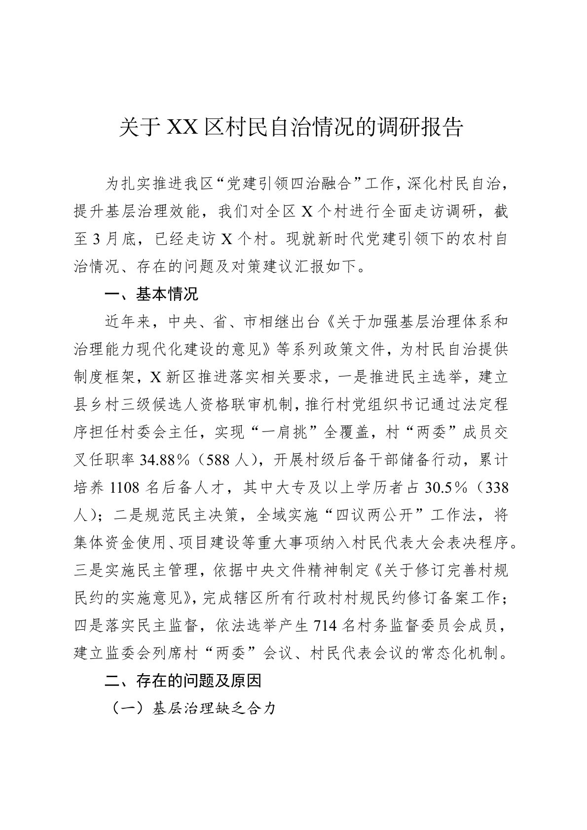 为扎实推进我区“党建引领四治融合”工作,深化村民自治,提升基层治理效能,我们对全区X个村进行全面走访调研,截至3月底,已经走访X个村。现就新时代党建引领下的农村自治情况、存在的问题及对策建议汇报如下。一、基本情况近年来,中央、省、市相继出台《关于加强基层治理体系和治理能力现代化建设的意见》等系列政策文件,为村民自治提供制度框架,X新区推进落实相关要求,一是推进民主选举,建立县乡村三级候选人资格联审机制,推行村党组织书记通过法定程序担任村委会主任,实现“一肩挑”全覆盖,村“两委”成员交叉任职率34.88%(588人),开展村级后备干部储备行动,累计培养1108名后备人才,其中大专及以上学历者占3...