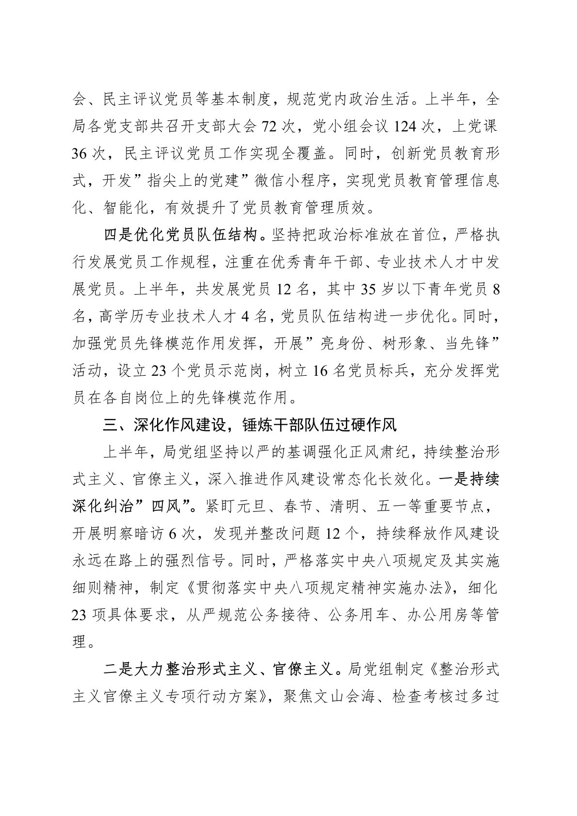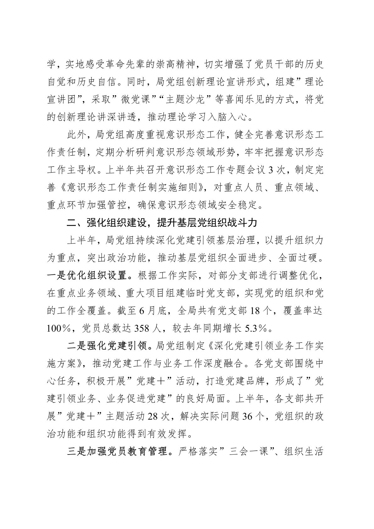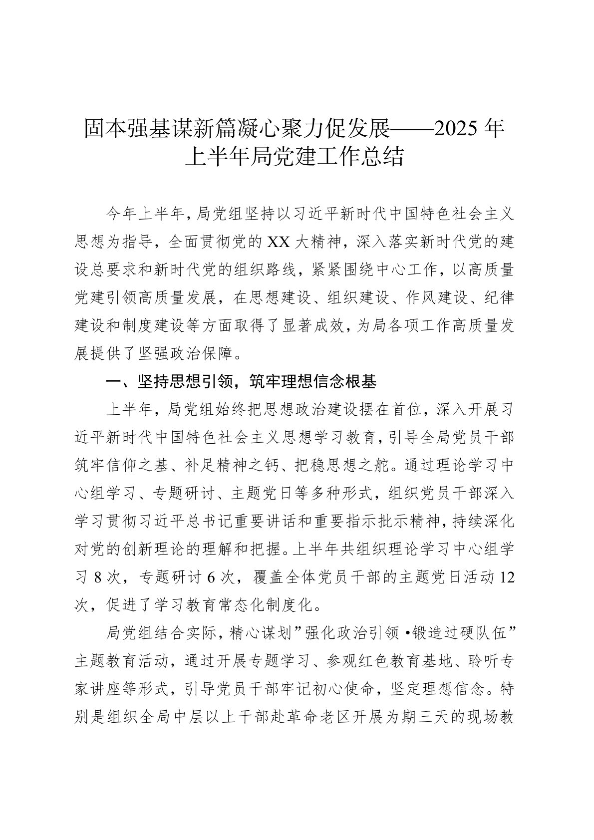今年上半年,局党组坚持以习近平新时代中国特色社会主义思想为指导,全面贯彻党的XX大精神,深入落实新时代党的建设总要求和新时代党的组织路线,紧紧围绕中心工作,以高质量党建引领高质量发展,在思想建设、组织建设、作风建设、纪律建设和制度建设等方面取得了显著成效,为局各项工作高质量发展提供了坚强政治保障。一、坚持思想引领,筑牢理想信念根基上半年,局党组始终把思想政治建设摆在首位,深入开展习近平新时代中国特色社会主义思想学习教育,引导全局党员干部筑牢信仰之基、补足精神之钙、把稳思想之舵。通过理论学习中心组学习、专题研讨、主题党日等多种形式,组织党员干部深入学习贯彻习近平总书记重要讲话和重要指示批示精神,...