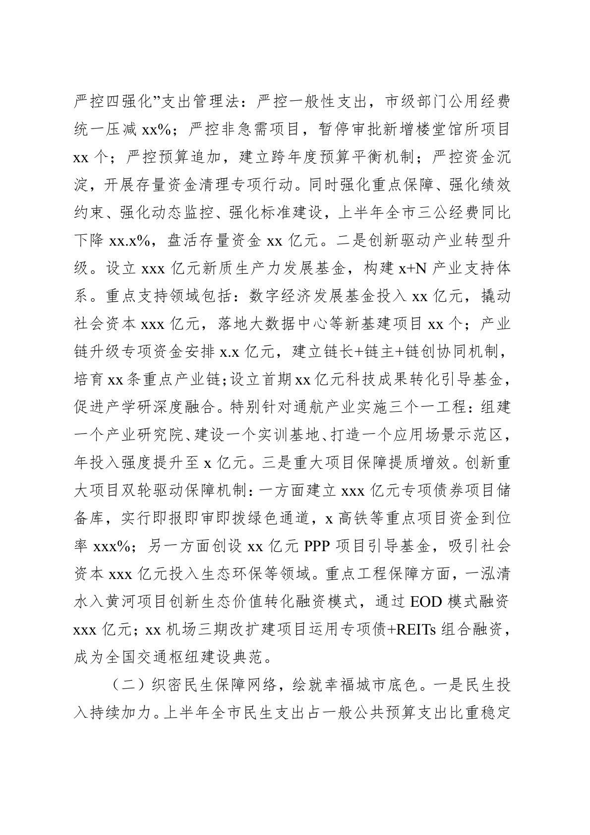 今年以来,在市委的坚强领导下,全市财政系统深入贯彻习近平新时代中国特色社会主义思想,全面落实党的二十大及历次全会精神,聚焦稳增长、促改革、调结构、惠民生、防风险主线,创新实施积极财政政策,聚力服务全市高质量发展大局。上半年财政运行呈现收入稳中有进、支出精准发力、改革纵深推进、风险总体可控的良好态势,为全市经济社会发展提供了坚实财政保障。一、重点工作推进情况(一)构建稳增长财政矩阵,筑牢高质量发展根基。一是多措并举夯实财政基本盘。深化财政收入全周期管理模式,创新建立三维度增收机制:强化税收协同共治。组建财税大数据分析中心,建立重点税源动态监测系统,开展跨部门联合治税专项行动,重点加强矿业权出让、...