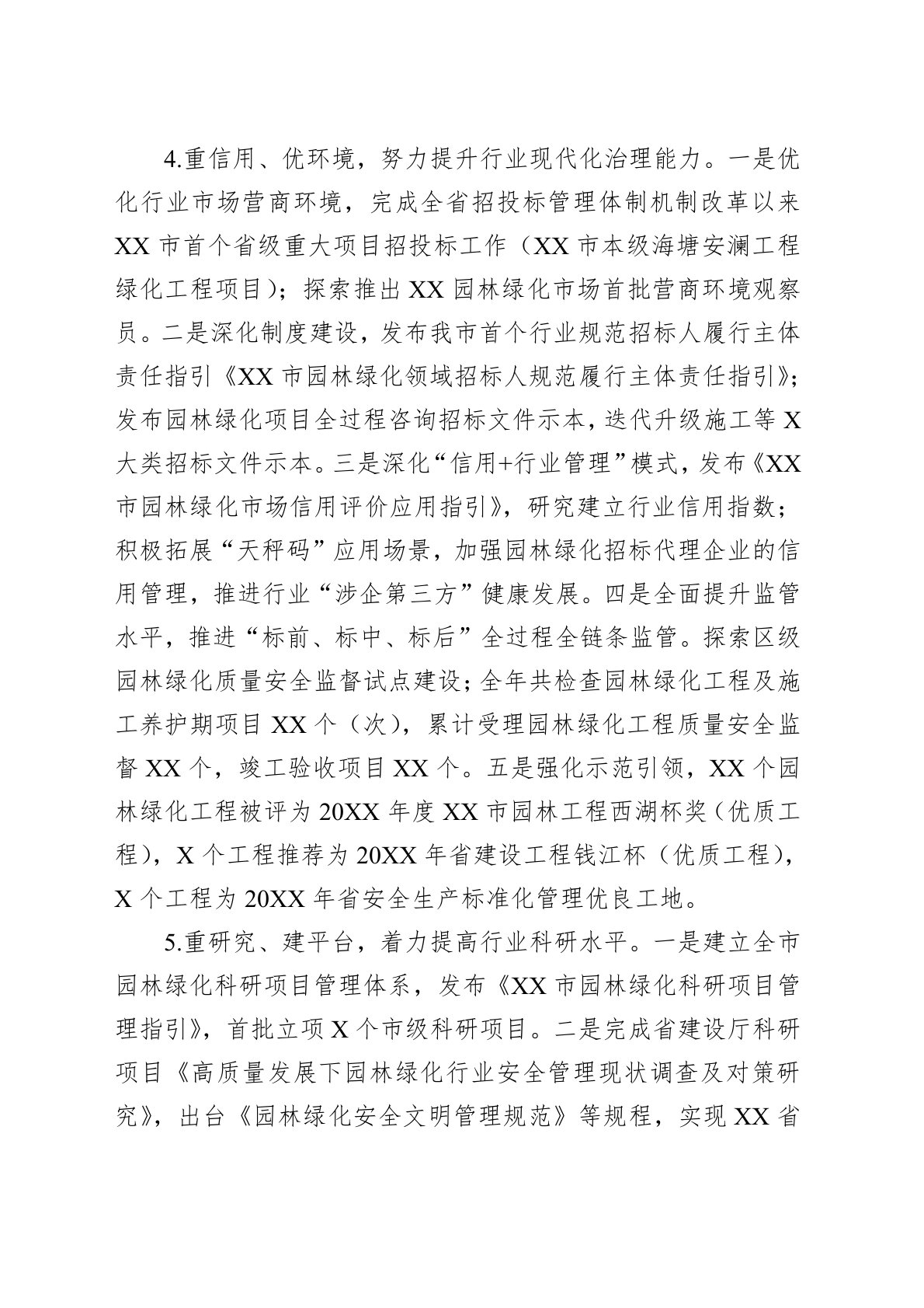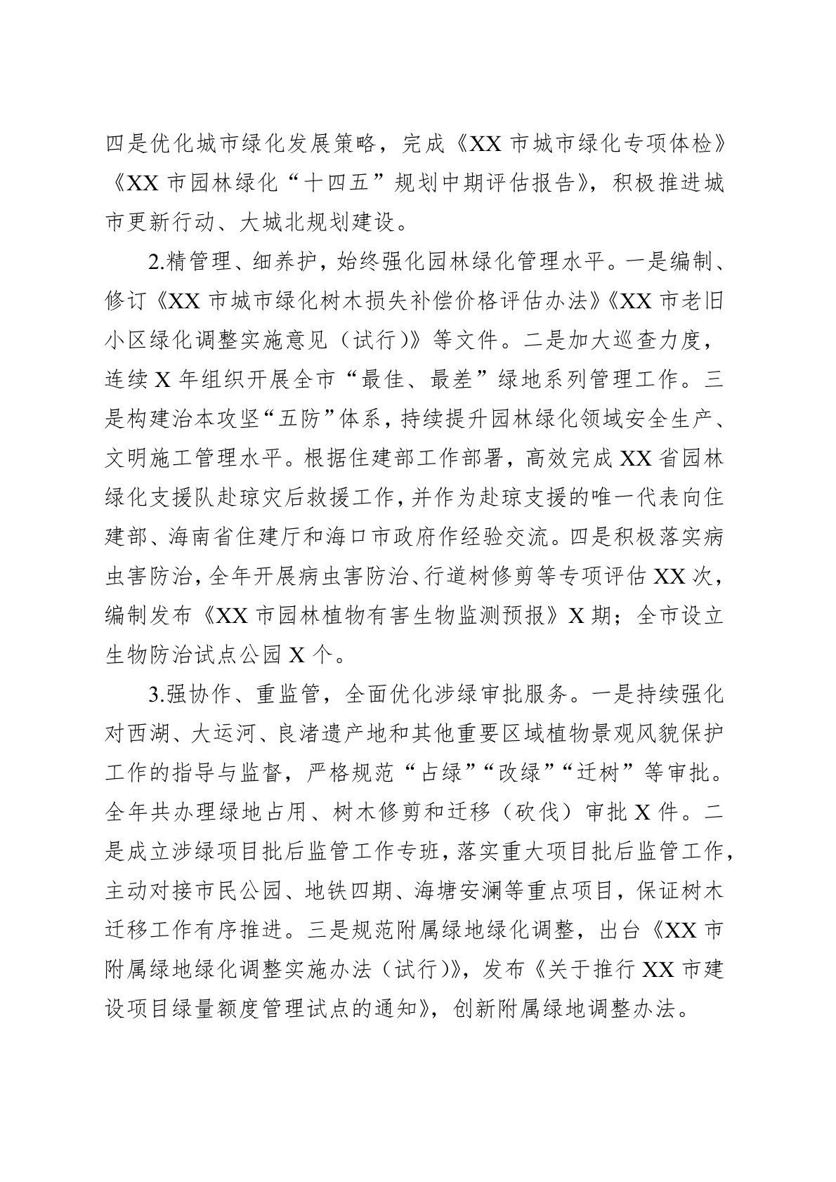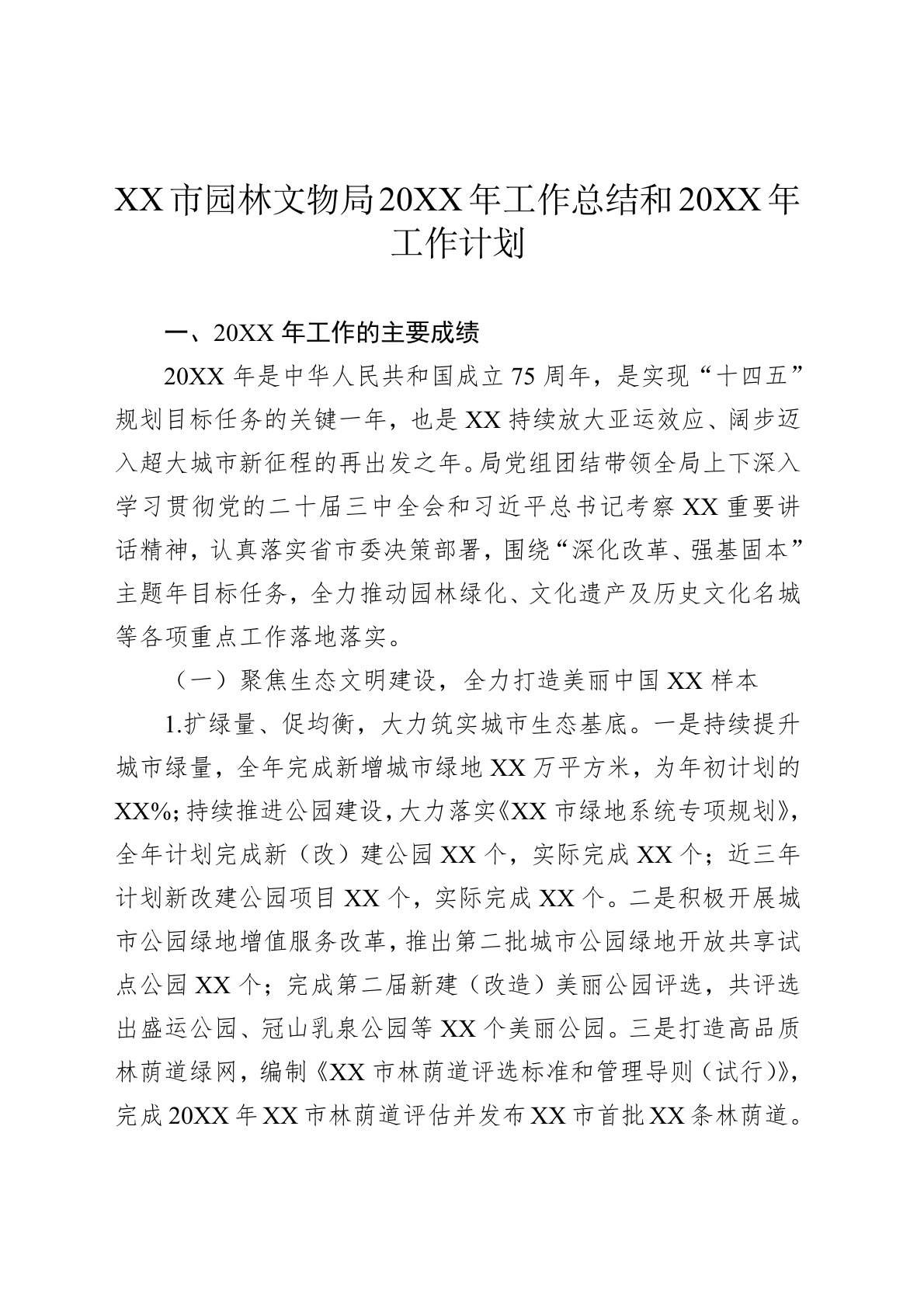 一、20XX年工作的主要成绩20XX年是中华人民共和国成立75周年,是实现“十四五”规划目标任务的关键一年,也是XX持续放大亚运效应、阔步迈入超大城市新征程的再出发之年。局党组团结带领全局上下深入学习贯彻党的二十届三中全会和习近平总书记考察XX重要讲话精神,认真落实省市委决策部署,围绕“深化改革、强基固本”主题年目标任务,全力推动园林绿化、文化遗产及历史文化名城等各项重点工作落地落实。(一)聚焦生态文明建设,全力打造美丽中国XX样本1.扩绿量、促均衡,大力筑实城市生态基底。一是持续提升城市绿量,全年完成新增城市绿地XX万平方米,为年初计划的XX%;持续推进公园建设,大力落实《XX市绿地系统专项...