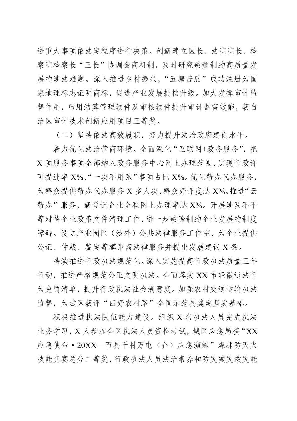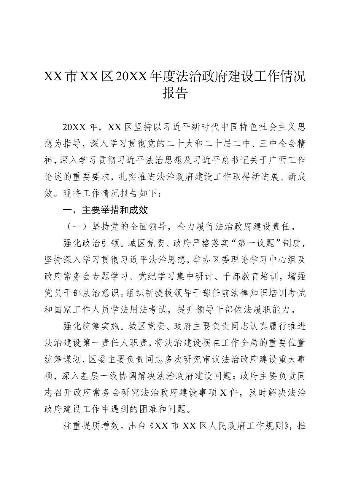 20XX年,XX区坚持以习近平新时代中国特色社会主义思想为指导,深入学习贯彻党的二十大和二十届二中、三中全会精神,深入学习贯彻习近平法治思想及习近平总书记关于广西工作论述的重要要求,扎实推进法治政府建设工作取得新进展、新成效。现将工作情况报告如下:一、主要举措和成效(一)坚持党的全面领导,全力履行法治政府建设责任。强化政治引领。城区党委、政府严格落实“第一议题”制度,坚持深入学习贯彻习近平法治思想,举办区委理论学习中心组及政府常务会专题学习、党纪学习集中研讨、干部教育培训,增强党员干部法治意识。组织新提拔领导干部任前法律知识培训考试和国家工作人员学法用法考试,提升领导干部依法履职能力。强化统...