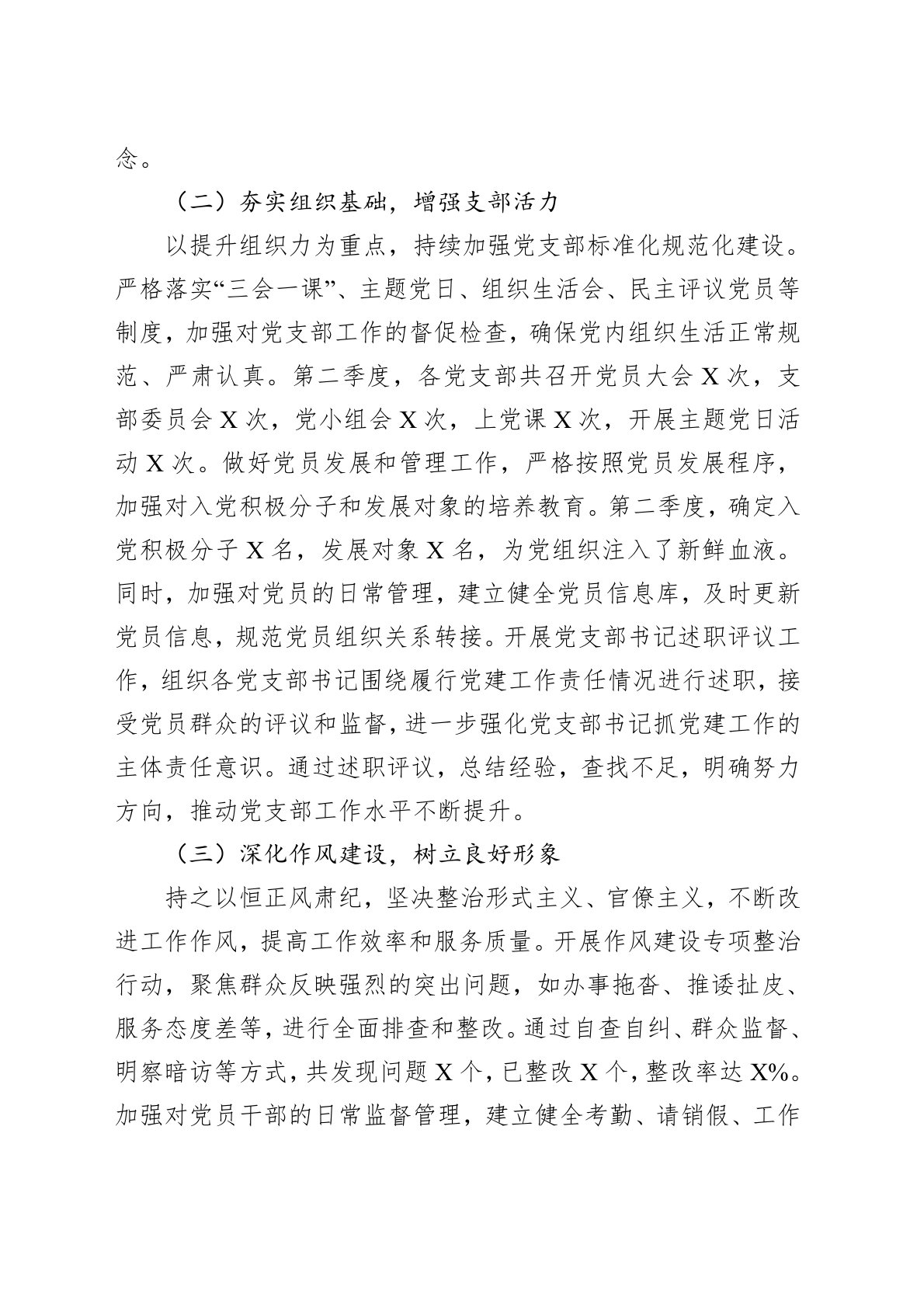 在2025年第二季度,我机关党建工作以习近平新时代中国特色社会主义思想为指导,深入贯彻落实党的二十大及二十届历次全会精神,紧紧围绕全面从严治党要求,扎实推进党的政治建设、思想建设、组织建设、作风建设和纪律建设,为机关各项工作的顺利开展提供了坚强的政治保障。现将第二季度党建工作情况汇报如下:一、工作开展情况(一)强化政治引领,提升思想认识始终把政治建设摆在首位,持续加强理论武装,不断提高党员干部的政治素养。严格落实“第一议题”制度,及时传达学习习近平总书记重要讲话和指示批示精神,以及党中央和上级党组织的决策部署,确保党员干部在思想上、政治上、行动上同党中央保持高度一致。第二季度,机关各党支部共组...