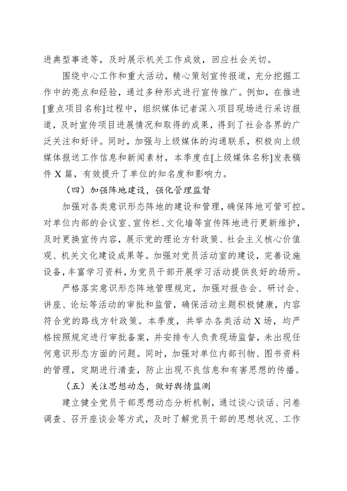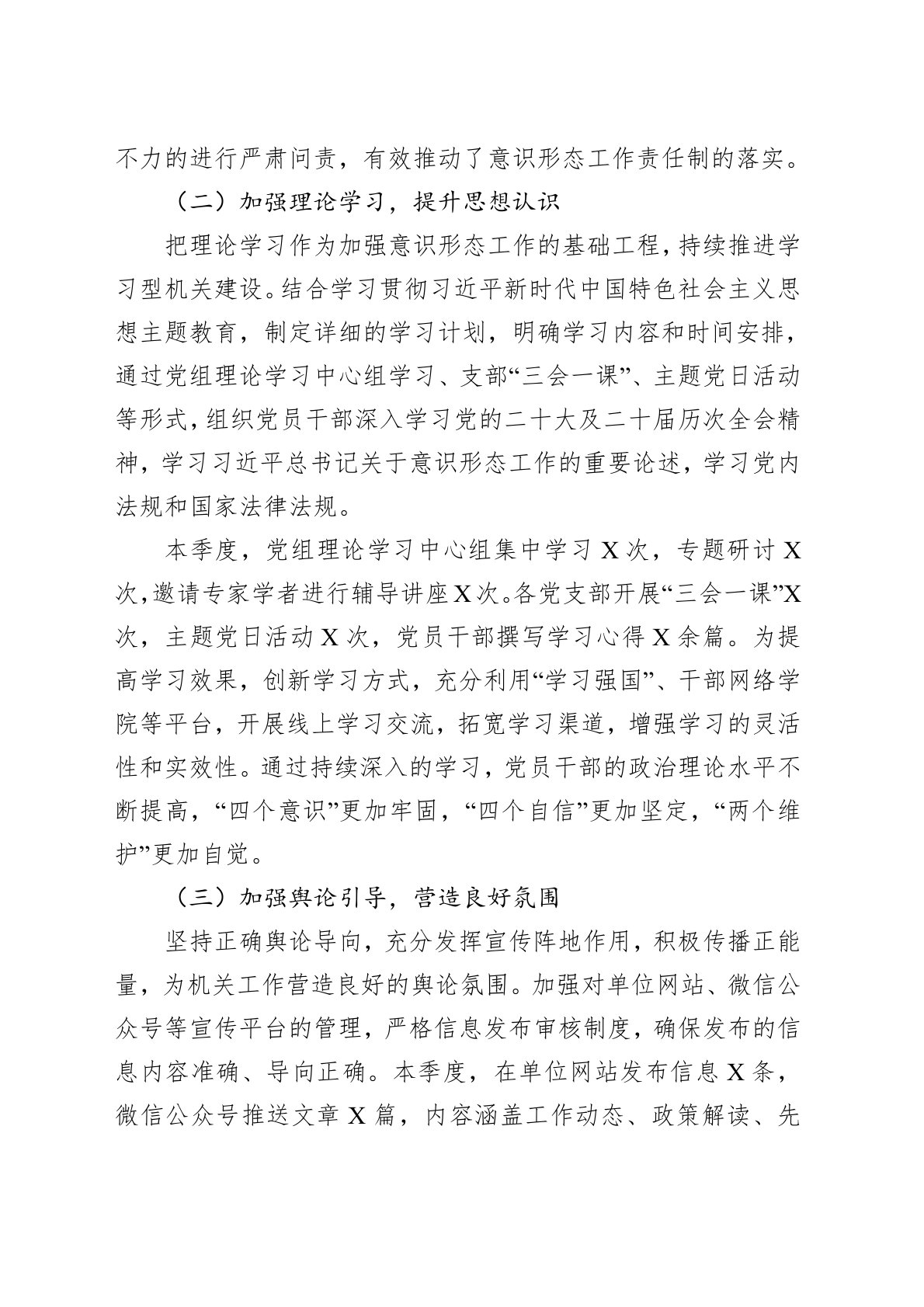 2025年第二季度,我单位以习近平新时代中国特色社会主义思想为指导,深入贯彻落实党中央关于意识形态工作的决策部署,坚持党管意识形态原则,全面落实意识形态工作责任制,不断加强和改进意识形态工作,为机关各项事业发展提供了坚强思想保证和强大精神动力。现将本季度意识形态工作情况汇报如下:一、工作开展情况(一)强化组织领导,压实工作责任单位党组高度重视意识形态工作,将其纳入重要议事日程,与业务工作同部署、同落实、同检查、同考核。及时调整意识形态工作领导小组,由党组书记担任组长,切实履行第一责任人职责,带头抓意识形态工作,重要工作亲自部署、重要问题亲自过问、重大事件亲自处置。其他党组成员按照“一岗双责”要...