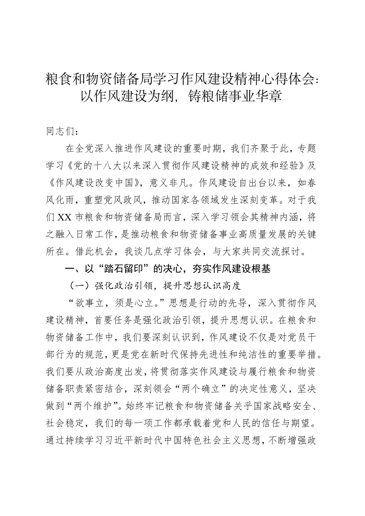 同志们:在全党深入推进作风建设的重要时期,我们齐聚于此,专题学习《党的十八大以来深入贯彻作风建设精神的成效和经验》及《作风建设改变中国》,意义非凡。作风建设自出台以来,如春风化雨,重塑党风政风,推动国家各领域发生深刻变革。对于我们XX市粮食和物资储备局而言,深入学习领会其精神内涵,将之融入日常工作,是推动粮食和物资储备事业高质量发展的关键所在。借此机会,我谈几点学习体会,与大家共同交流探讨。一、以“踏石留印”的决心,夯实作风建设根基(一)强化政治引领,提升思想认识高度“欲事立,须是心立。”思想是行动的先导,深入贯彻作风建设精神,首要任务是强化政治引领,提升思想认识。在粮食和物资储备工作中,我们...