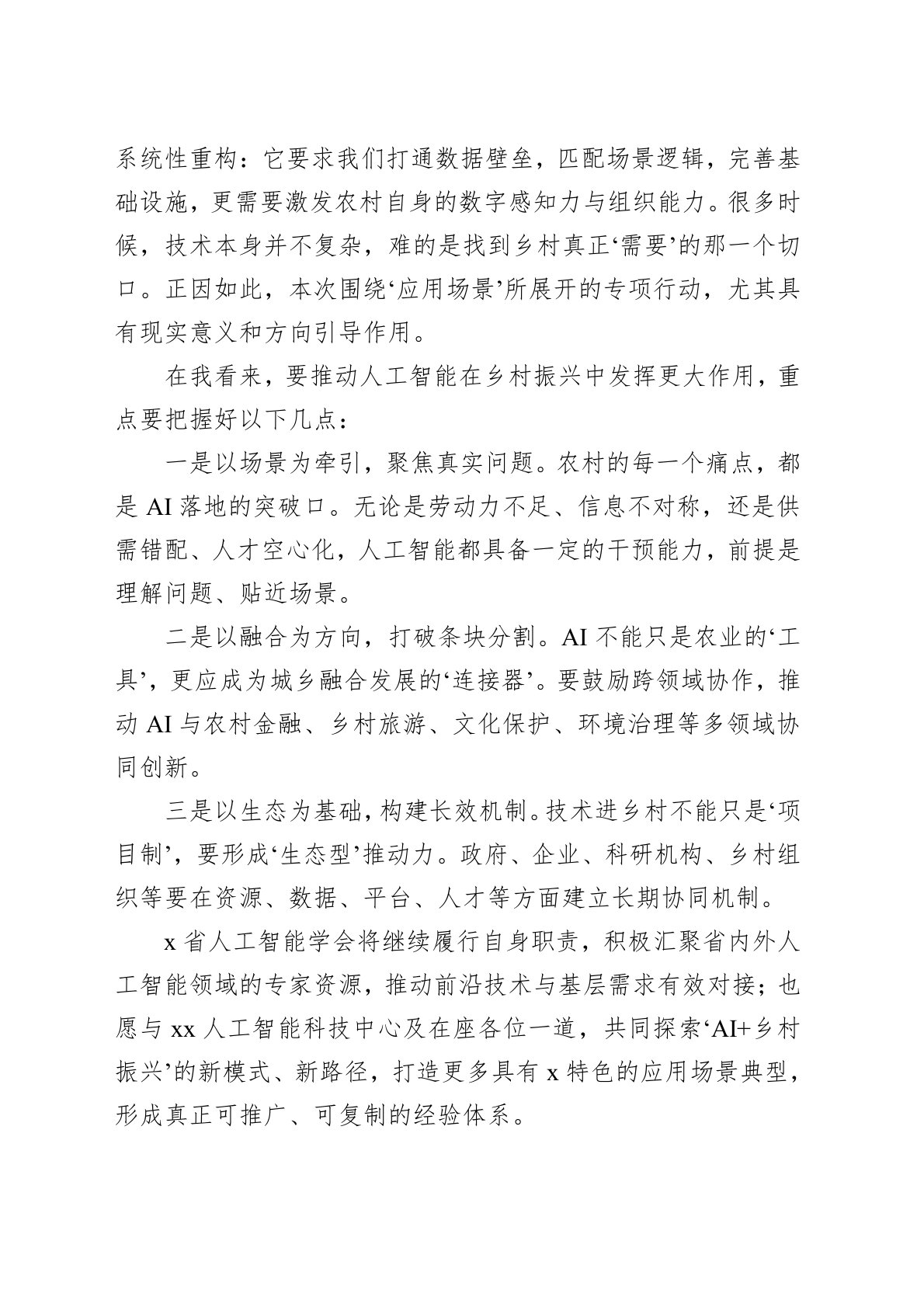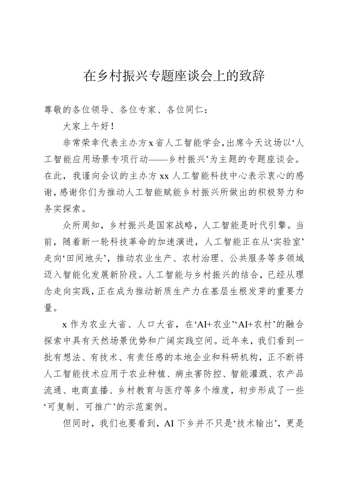 尊敬的各位领导、各位专家、各位同仁:大家上午好!非常荣幸代表主办方x省人工智能学会,出席今天这场以‘人工智能应用场景专项行动——乡村振兴’为主题的专题座谈会。在此,我谨向会议的主办方xx人工智能科技中心表示衷心的感谢,感谢你们为推动人工智能赋能乡村振兴所做出的积极努力和务实探索。众所周知,乡村振兴是国家战略,人工智能是时代引擎。当前,随着新一轮科技革命的加速演进,人工智能正在从‘实验室’走向‘田间地头’,推动农业生产、农村治理、公共服务等多领域迈入智能化发展新阶段。人工智能与乡村振兴的结合,已经从理念走向实践,正在成为推动新质生产力在基层生根发芽的重要力量。x作为农业大省、人口大省,在‘AI+...