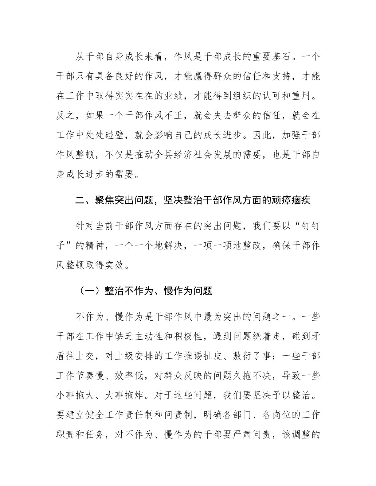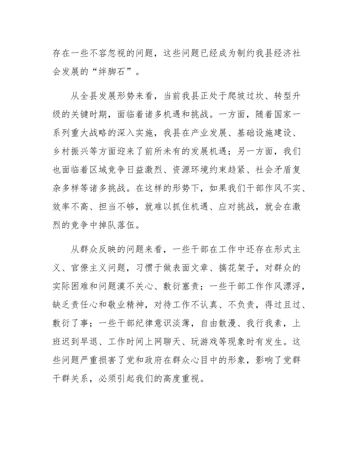 在全县干部作风整顿大会上的讲话同志们:今天,我们召开全县干部作风整顿大会,主要目的是深刻剖析当前干部作风方面存在的突出问题,明确整顿方向和重点,进一步统一思想、凝聚共识,以作风的大转变推动全县各项工作的大提升。干部作风关乎党的形象,关乎事业发展,关乎人心向背。我们必须以刮骨疗毒的勇气,坚决整治干部作风方面的顽瘴痼疾,为全县经济社会高质量发展提供坚强的作风保障。下面,我讲几点意见。一、提高思想认识,深刻领会干部作风整顿的重要性和紧迫性干部作风是党风政风的重要体现,也是推动工作落实、促进事业发展的重要保障。近年来,我们通过开展一系列作风建设活动,全县干部作风有了明显转变,广大干部在脱贫攻坚、疫情防...