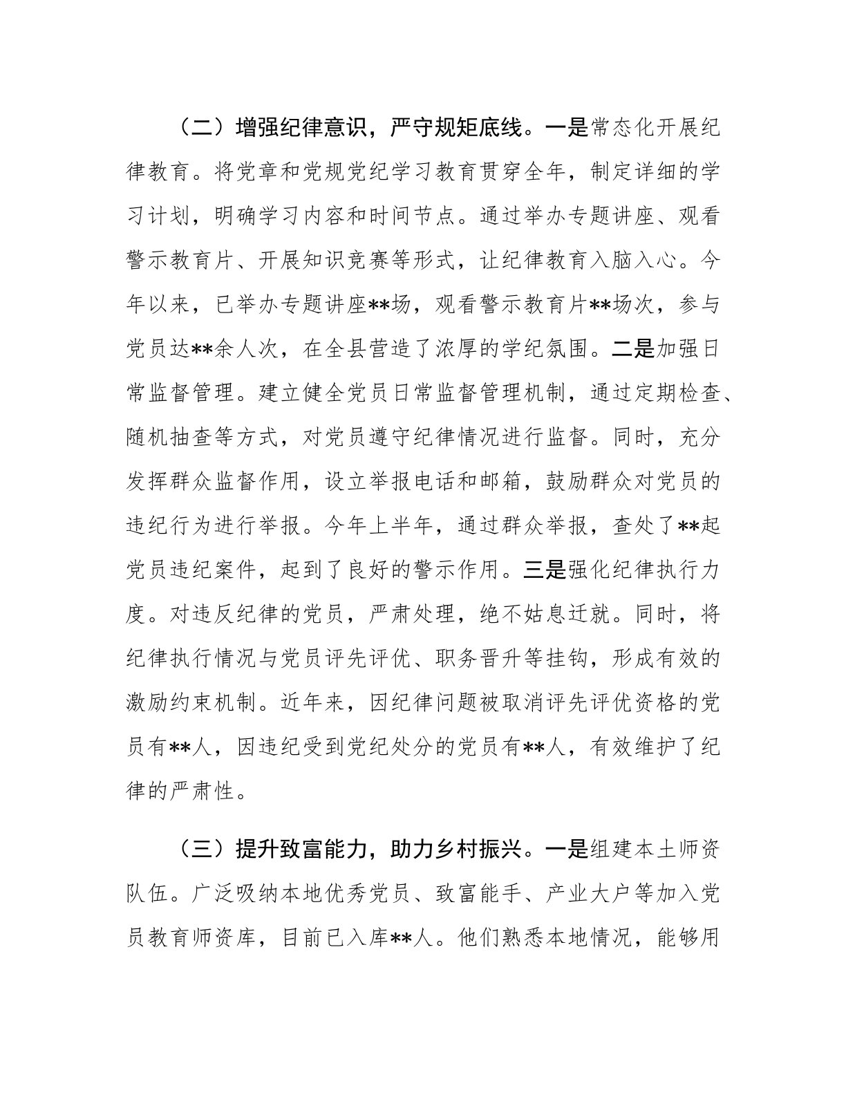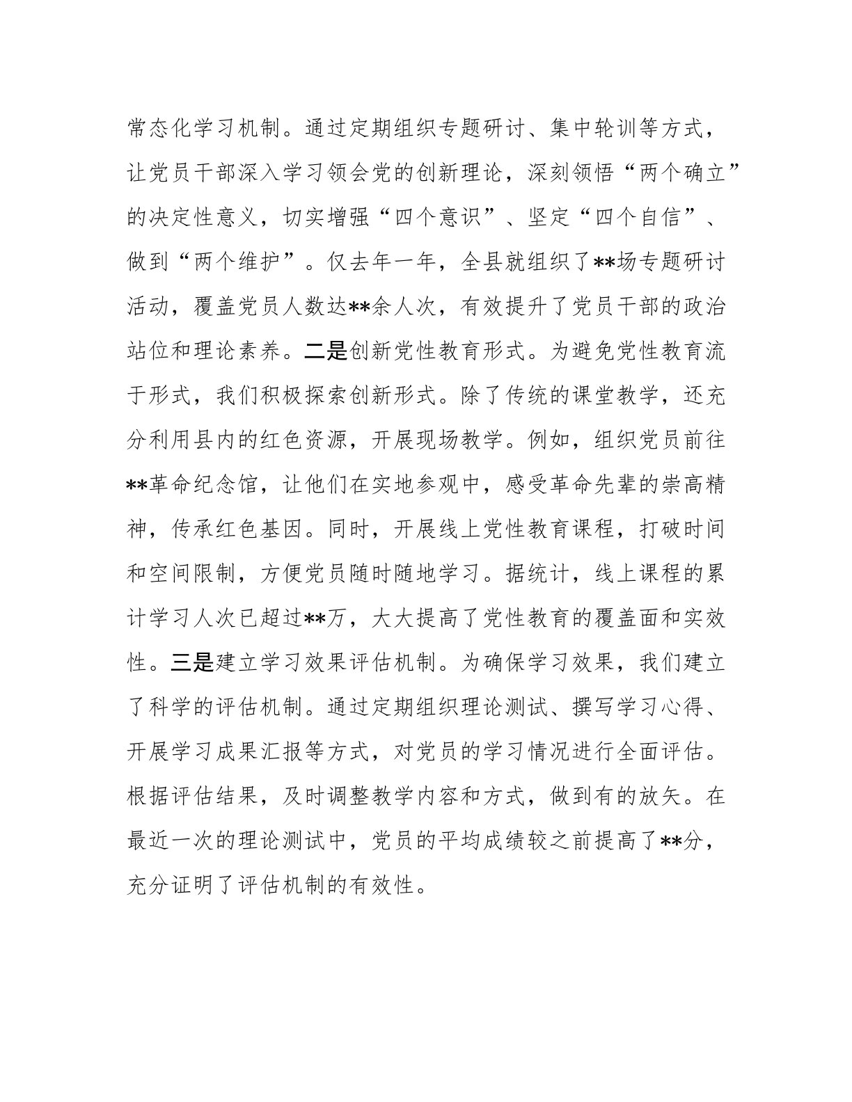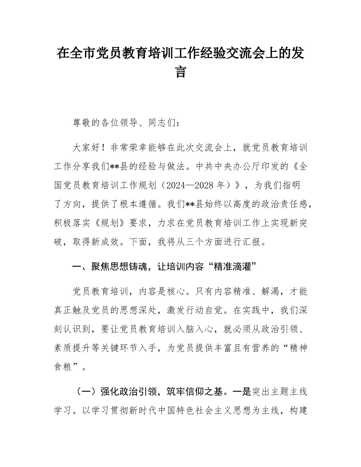 在全市党员教育培训工作经验交流会上的发言尊敬的各位领导、同志们:大家好!非常荣幸能够在此次交流会上,就党员教育培训工作分享我们**县的经验与做法。中共中央办公厅印发的《全国党员教育培训工作规划(2024—2028年)》,为我们指明了方向,提供了根本遵循。我们**县始终以高度的政治责任感,积极落实《规划》要求,力求在党员教育培训工作上实现新突破,取得新成效。下面,我将从三个方面进行汇报。一、聚焦思想铸魂,让培训内容“精准滴灌”党员教育培训,内容是核心。只有内容精准、解渴,才能真正触及党员的思想深处,激发行动自觉。在实践中,我们深刻认识到,要让党员教育培训入脑入心,就必须从政治引领、素质提升等关键...