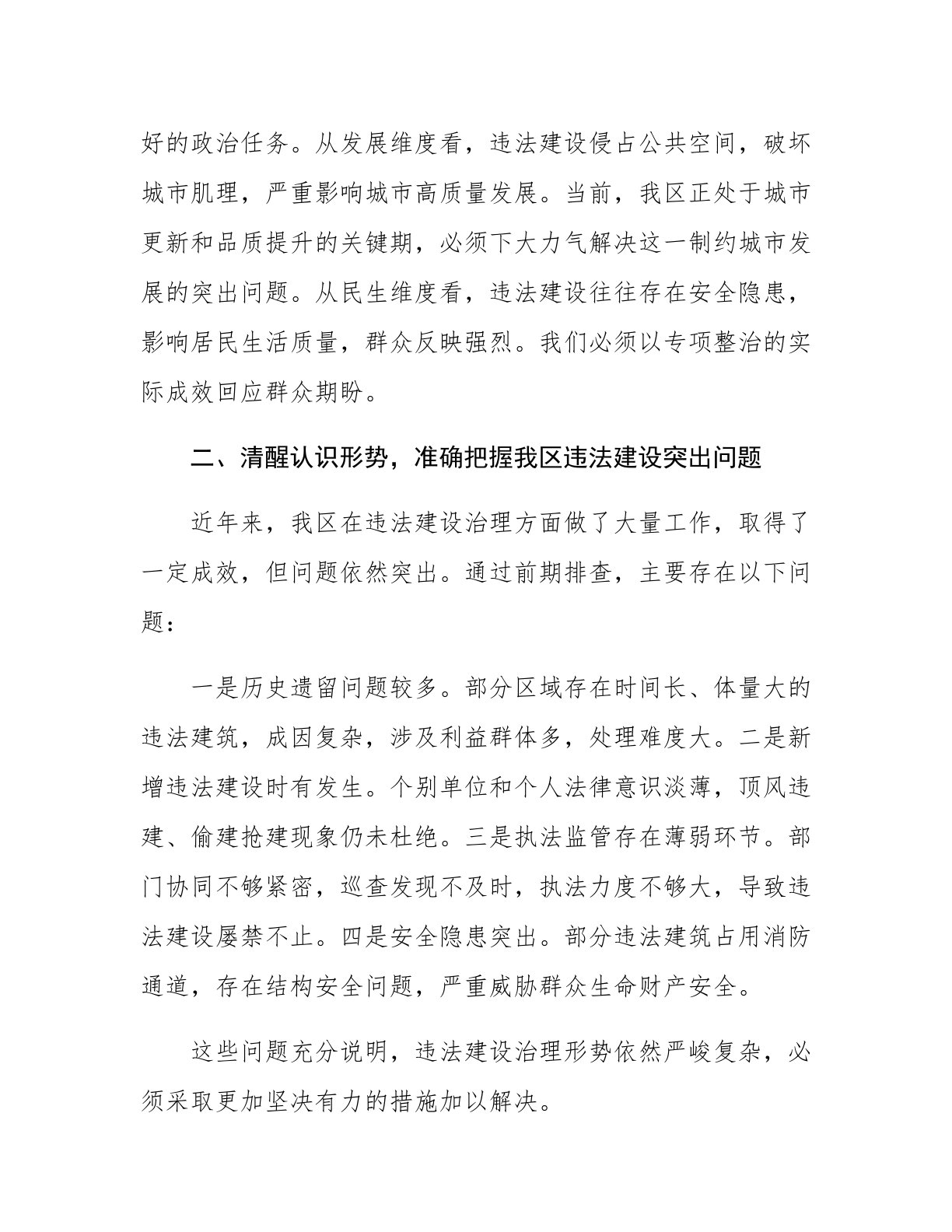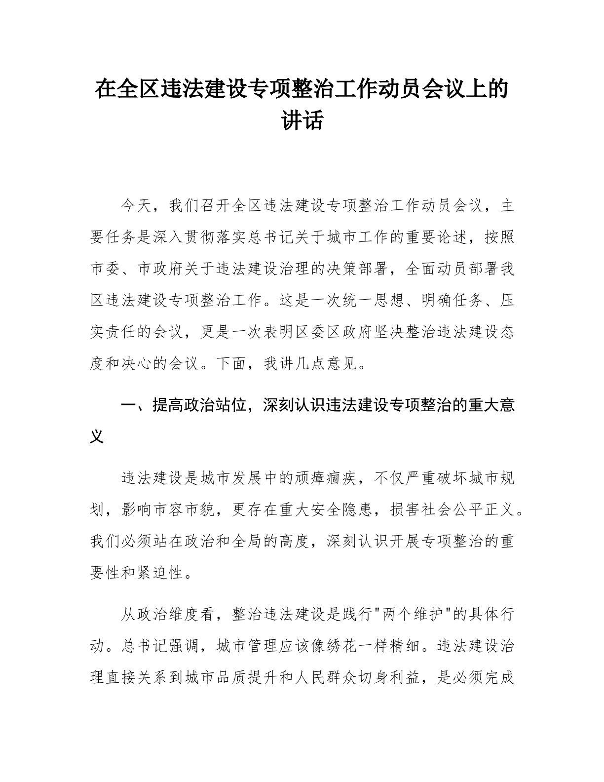 在全区违法建设专项整治工作动员会议上的讲话今天,我们召开全区违法建设专项整治工作动员会议,主要任务是深入贯彻落实总书记关于城市工作的重要论述,按照市委、市政府关于违法建设治理的决策部署,全面动员部署我区违法建设专项整治工作。这是一次统一思想、明确任务、压实责任的会议,更是一次表明区委区政府坚决整治违法建设态度和决心的会议。下面,我讲几点意见。一、提高政治站位,深刻认识违法建设专项整治的重大意义违法建设是城市发展中的顽瘴痼疾,不仅严重破坏城市规划,影响市容市貌,更存在重大安全隐患,损害社会公平正义。我们必须站在政治和全局的高度,深刻认识开展专项整治的重要性和紧迫性。从政治维度看,整治违法建设是践...