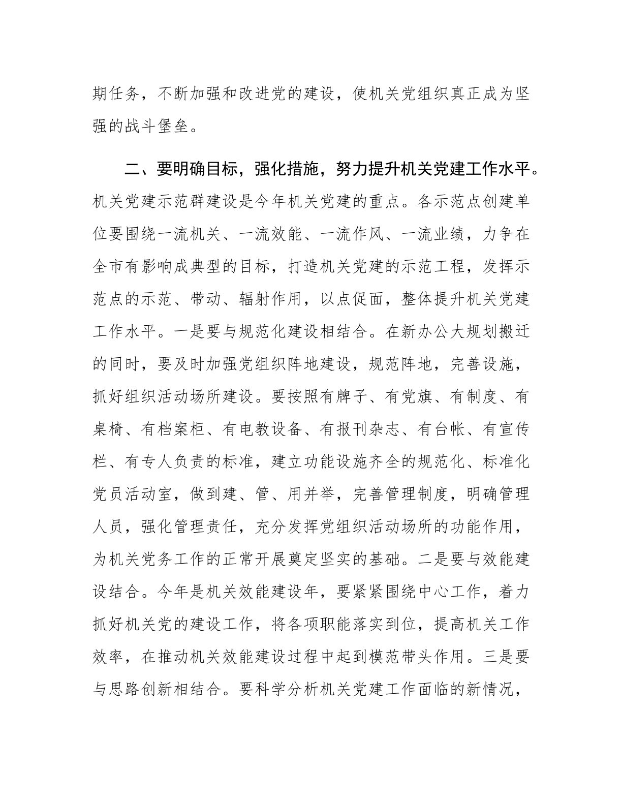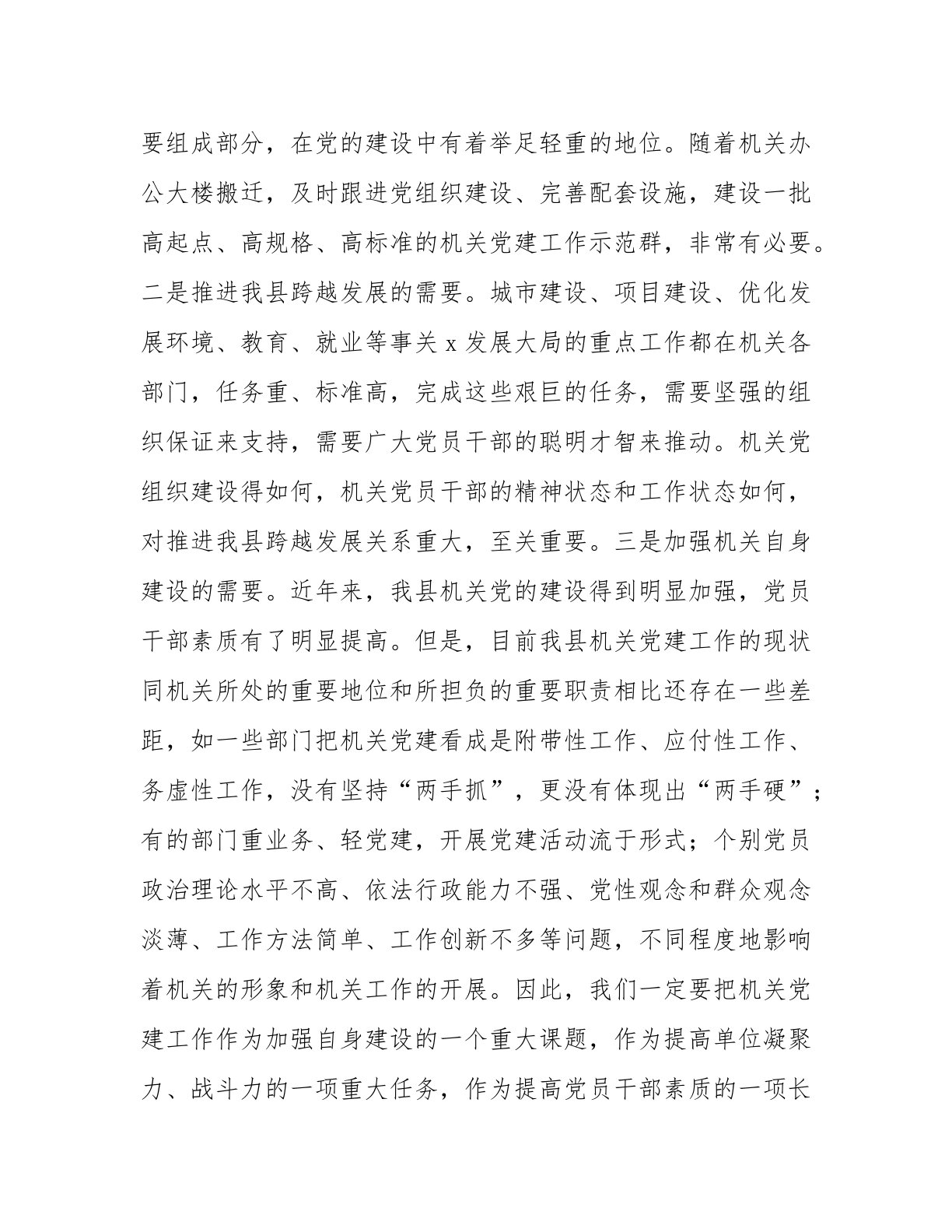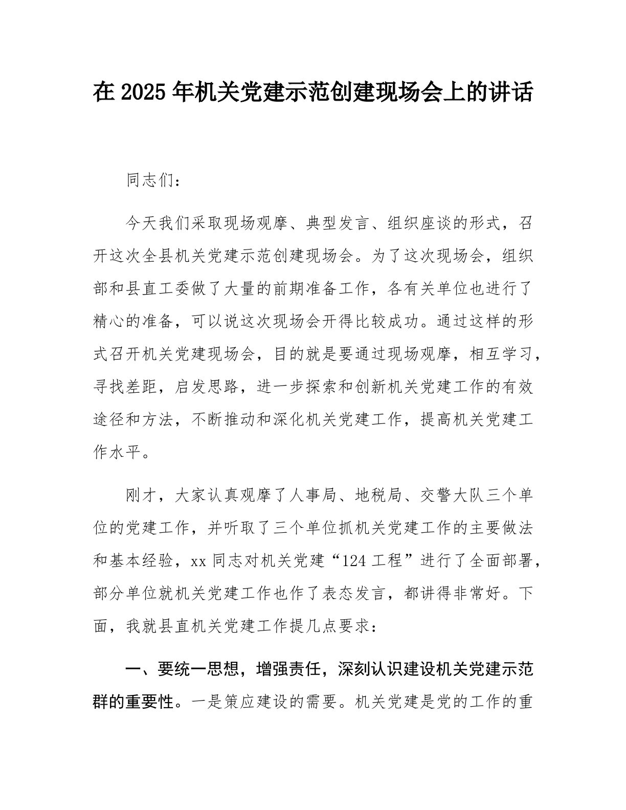 在2025年机关党建示范创建现场会上的讲话同志们:今天我们采取现场观摩、典型发言、组织座谈的形式,召开这次全县机关党建示范创建现场会。为了这次现场会,组织部和县直工委做了大量的前期准备工作,各有关单位也进行了精心的准备,可以说这次现场会开得比较成功。通过这样的形式召开机关党建现场会,目的就是要通过现场观摩,相互学习,寻找差距,启发思路,进一步探索和创新机关党建工作的有效途径和方法,不断推动和深化机关党建工作,提高机关党建工作水平。刚才,大家认真观摩了人事局、地税局、交警大队三个单位的党建工作,并听取了三个单位抓机关党建工作的主要做法和基本经验,xx同志对机关党建“124工程”进行了全面部署,部...