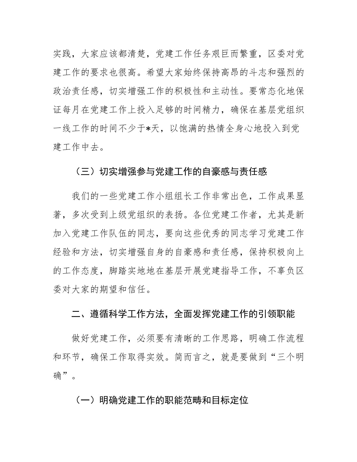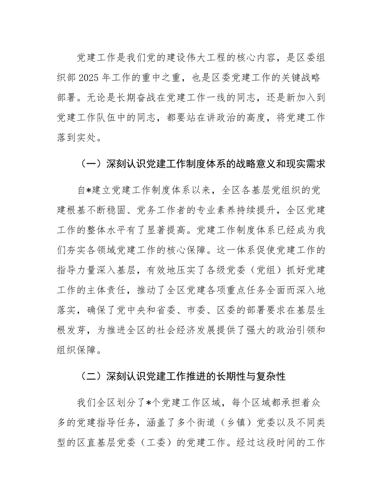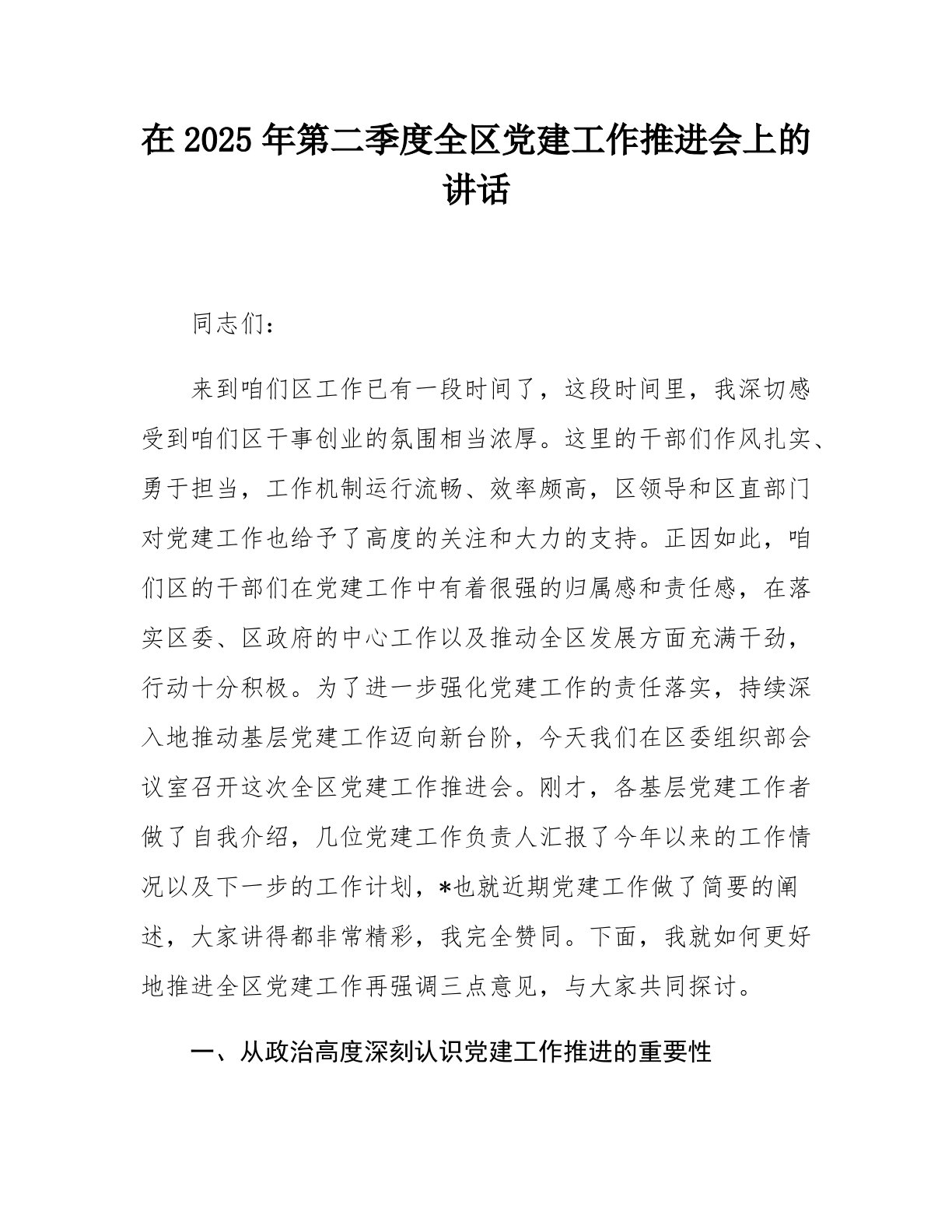 在2025年第二季度全区党建工作推进会上的讲话同志们:来到咱们区工作已有一段时间了,这段时间里,我深切感受到咱们区干事创业的氛围相当浓厚。这里的干部们作风扎实、勇于担当,工作机制运行流畅、效率颇高,区领导和区直部门对党建工作也给予了高度的关注和大力的支持。正因如此,咱们区的干部们在党建工作中有着很强的归属感和责任感,在落实区委、区政府的中心工作以及推动全区发展方面充满干劲,行动十分积极。为了进一步强化党建工作的责任落实,持续深入地推动基层党建工作迈向新台阶,今天我们在区委组织部会议室召开这次全区党建工作推进会。刚才,各基层党建工作者做了自我介绍,几位党建工作负责人汇报了今年以来的工作情况以及下...