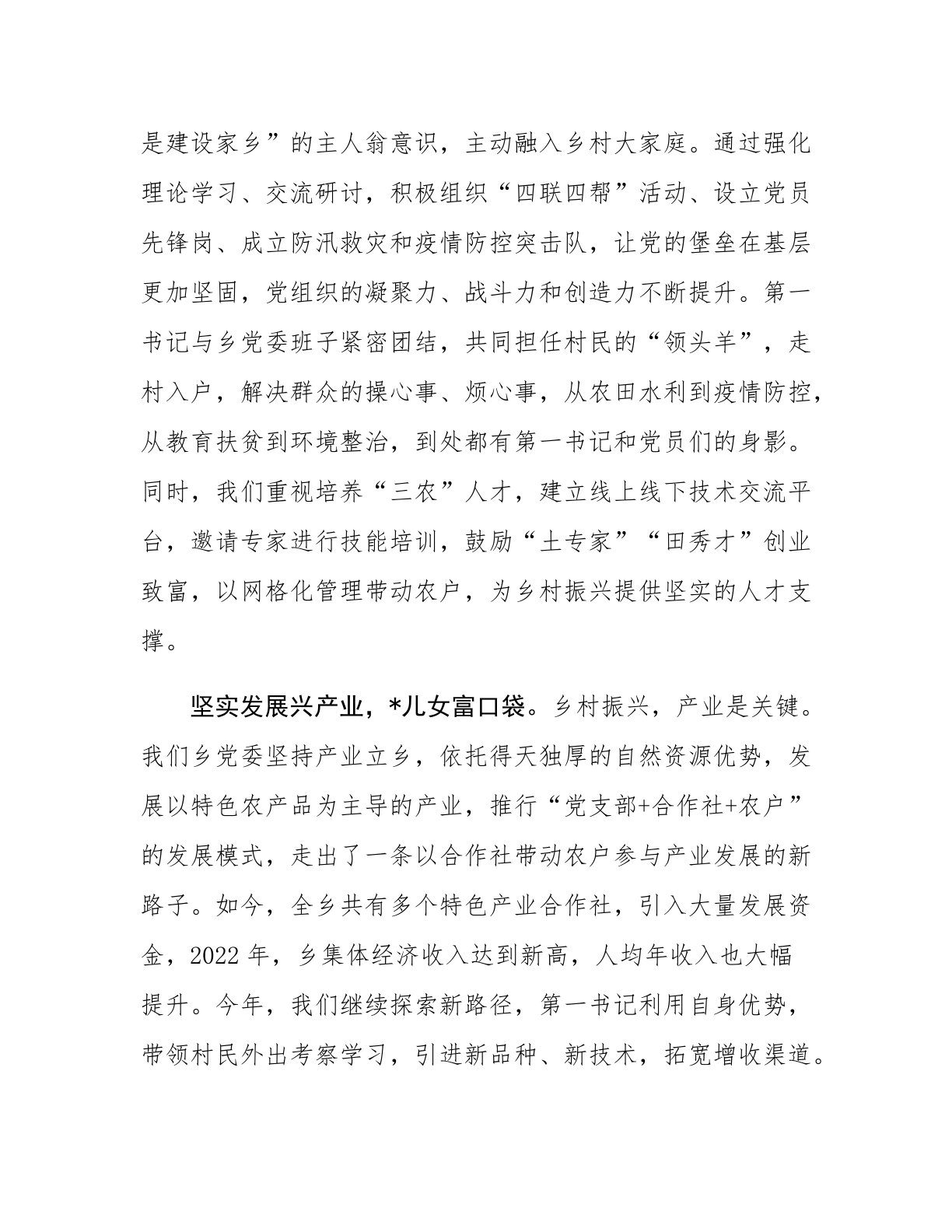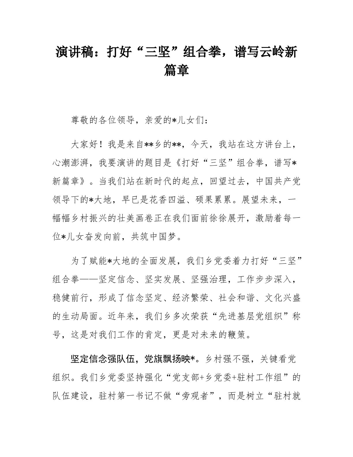 演讲稿:打好“三坚”组合拳,谱写云岭新篇章尊敬的各位领导,亲爱的*儿女们:大家好!我是来自**乡的**,今天,我站在这方讲台上,心潮澎湃,我要演讲的题目是《打好“三坚”组合拳,谱写*新篇章》。当我们站在新时代的起点,回望过去,中国共产党领导下的*大地,早已是花香四溢、硕果累累。展望未来,一幅幅乡村振兴的壮美画卷正在我们面前徐徐展开,激励着每一位*儿女奋发向前,共筑中国梦。为了赋能*大地的全面发展,我们乡党委着力打好“三坚”组合拳——坚定信念、坚实发展、坚强治理,工作步步深入,稳健前行,形成了信念坚定、经济繁荣、社会和谐、文化兴盛的生动局面。近年来,我们乡多次荣获“先进基层党组织”称号,这是对我...