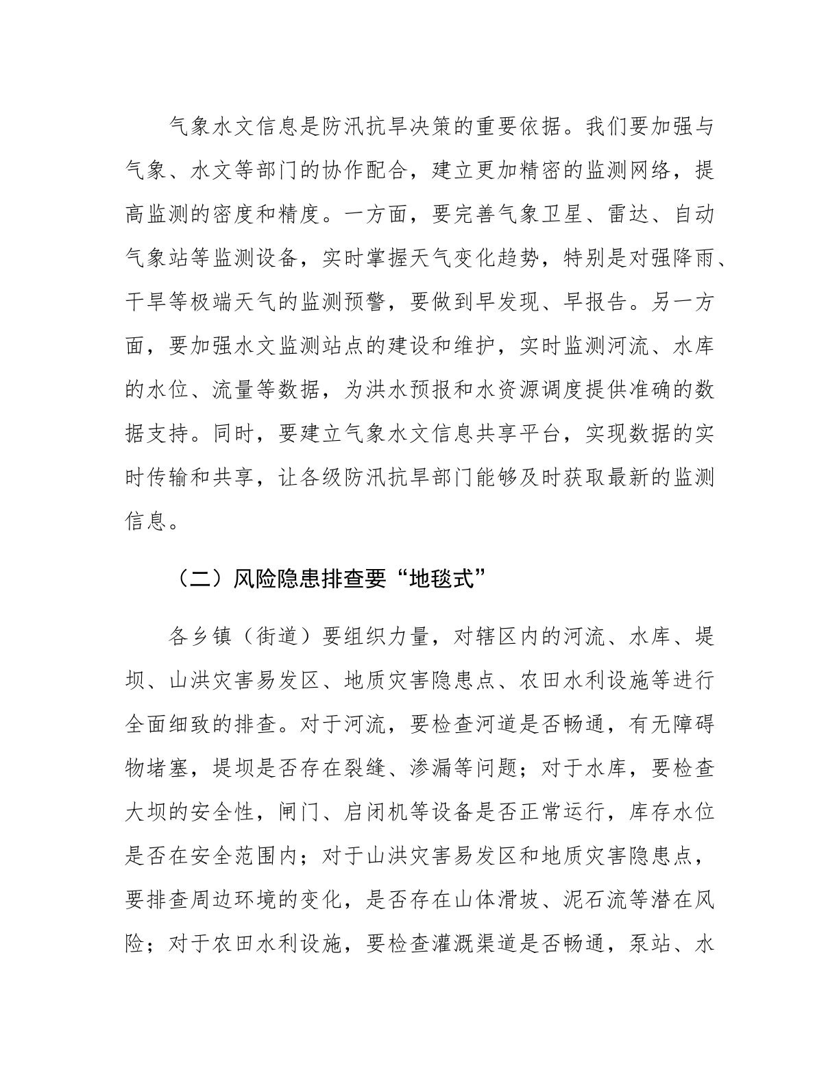 县长在2025年乡镇(街道)防汛抗旱工作部署会上的讲话同志们:防汛抗旱,是守护人民生命财产安全的坚实壁垒,是保障经济社会平稳发展的重要基石。近年来,气候变化带来的极端天气事件频发,暴雨、洪水、干旱等灾害给我们的生产生活带来了诸多挑战。2025年的防汛抗旱形势依然严峻复杂,据气象部门预测,今年夏季降水量较常年偏多,局部地区可能发生较大洪水,同时部分乡镇(街道)也可能面临阶段性干旱。面对即将到来的考验,我们必须以高度的责任感和使命感,全力以赴做好防汛抗旱各项工作。一、未雨绸缪,下好风险预判“先手棋”古人云:“凡事预则立,不预则废。”防汛抗旱工作,准确的风险预判是前提。只有提前洞察潜在的风险隐患,才...